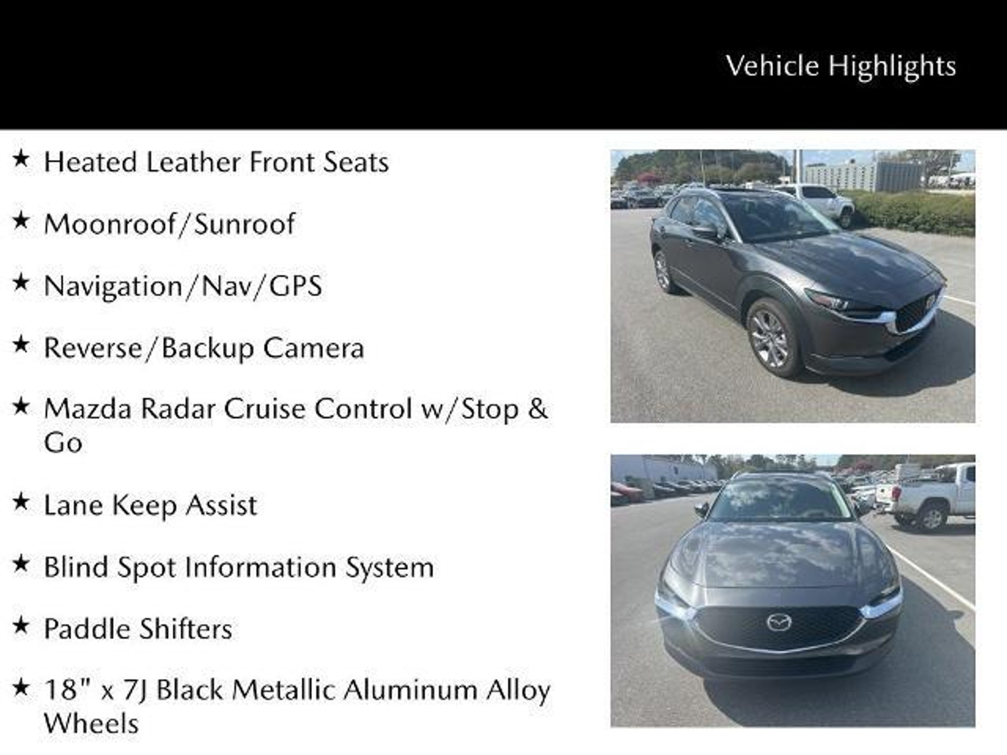 Elevated style meets premium detail in this 2023 Mazda CX-30 2.5 S Premium Package (VIN 3MVDMBDM4PM506161) with just 17,121 miles, delivering a refined compact SUV with standout design and advanced features. Inside, heated leather front seats provide upscale comfort, while the Premium Package enhances the experience with navigation, an Active Driving Display, and paddle shifters for a more engaging drive. A moonroof adds an open, airy feel to the cabin, and thoughtful technology like traffic sign recognition keeps key information easily within view. On the exterior, adaptive LED headlamps with signature illumination create a distinctive look, complemented by a black grille and black rear spoiler that give this CX-30 a sleek, sporty edge. A power liftgate adds everyday convenience when loading cargo or gear. Driver-assist features including adaptive cruise control, blind spot information system, and a backup camera help provide added confidence on the road. This vehicle is equipped with a standard audio system and does not include the Bose premium audio upgrade, allowing you to make an informed decision. Blending premium materials, advanced safety, and eye-catching styling, this CX-30 2.5 S Premium Package offers a well-rounded driving experience with low miles and modern appeal. CARFAX One-Owner. Clean CARFAX. Heated Leather Front Seats, Moonroof/Sunroof, Navigation/Nav/GPS, Reverse/Backup Camera, Mazda Radar Cruise Control w/Stop & Go, Lane Keep Assist, Blind Spot Information System, Paddle Shifters, 172 Point Inspection completed by our Factory Certified & ASC Trained Technicians, CLEAN HISTORY/NO ACCIDENTS, Recent Oil Change, Vehicle Detailed, 18 x 7J Black Metallic Aluminum Alloy Wheels, Active Driving Display, Traffic Sign Recognition, Power Liftgate, Front & Rear Signature Illumination, Adaptive LED Headlamps, Black Grille, Power Side Mirrors w/Tilt-in-Reverse & Memory, Black Rear Roof Spoiler, Bose Audio Credit, Leather Shift Knob, Leather Steering Wheel, MAZDA CONNECT Infotainment System, Rain Sensing Wipers. Savannah, GA â J.C. Lewis Mazda Smart Choices Start Here At J.C. Lewis Mazda, we know todayâs drivers are informed, connected, and always looking for smart value. Thatâs why we include over 20 high-resolution photos and a full walkaround video with every vehicle â so you can evaluate the details before ever stepping on the lot. Whether youâre a tech-forward professional, a college student, or simply someone who appreciates smart engineering, Mazda delivers the perfect