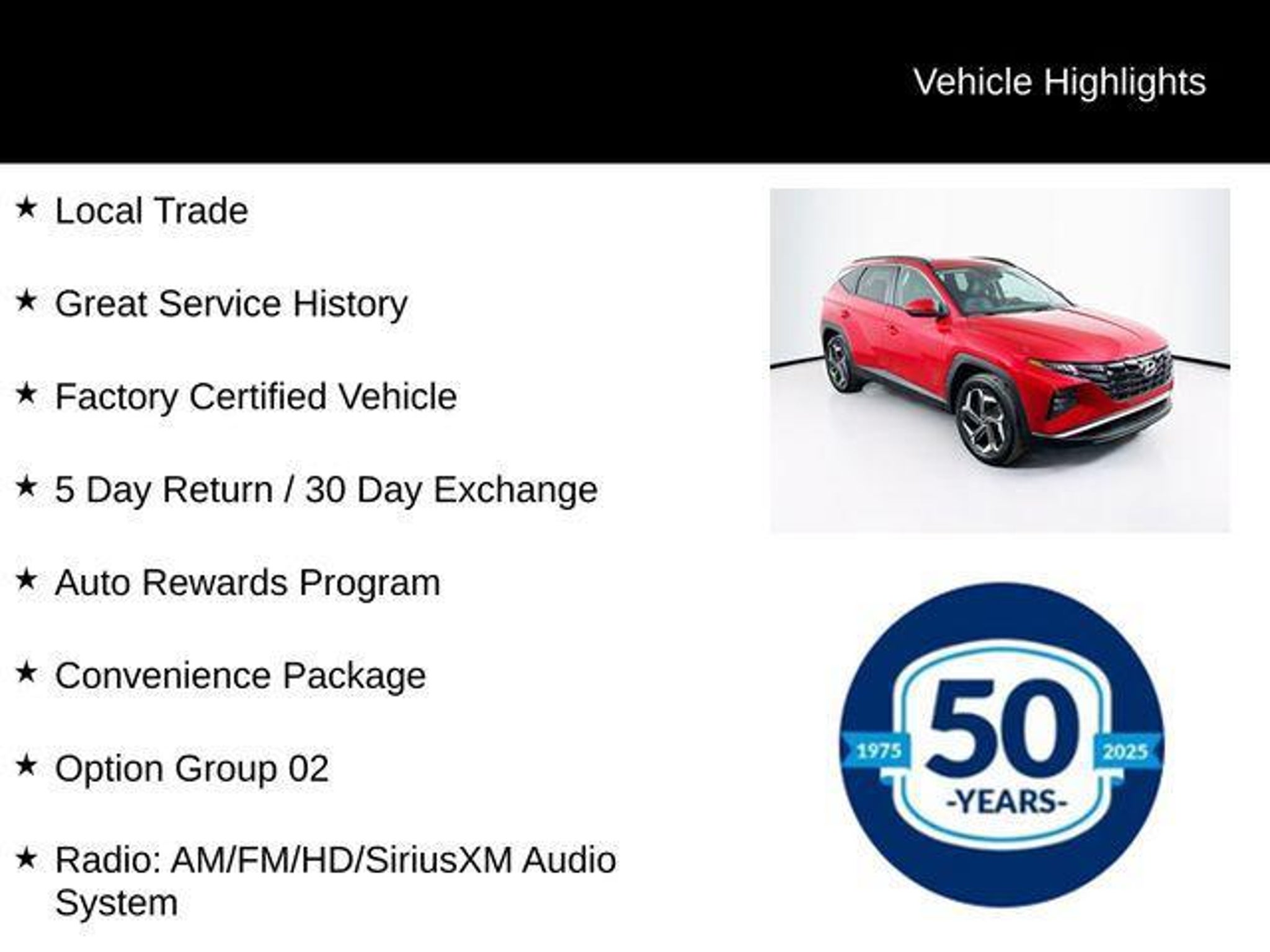 2023 Hyundai Tucson SEL SEL 2.5L I4 DGI DOHC 16V LEV3-ULEV70 187hp 8-Speed Automatic with SHIFTRONIC AWD 4D Sport Utility Calypso Red Local Trade, Great Service History, Factory Certified Vehicle, 5 Day Return / 30 Day Exchange, Auto Rewards Program, AWD, 10.25 Digital Instrument Cluster, Apple CarPlay & Android Auto, Auto High-beam Headlights, Convenience Package, Dual Automatic Temperature Control, H-Tex Seat Trim, Heated door mirrors, Heated front seats, Illuminated entry, Leather-Wrapped Shift Knob, Leather-Wrapped Steering Wheel, Option Group 02, Power door mirrors, Power driver seat, Power Liftgate, Power Sunroof, Radio: AM/FM/HD/SiriusXM Audio System, Remote keyless entry, Steering wheel mounted audio controls, Turn signal indicator mirrors, Wheels: 19 x 7.5J Machine-Face Finish Alloy. CARFAX One-Owner. Odometer is 2885 miles below market average! Certified. Hyundai Certified Used Vehicles Details: * Warranty Deductible: $50 * Roadside Assistance * Includes 10-year/Unlimited Mileage Roadside Assistance with Rental Car and Trip Interruption Reimbursement; Please See Dealers for Specific Vehicle Eligibility Requirements. 10-Year/100,000 Mile Hybrid/EV Battery Warranty. 3-Months SiriusXM Trial Subscription. Complimentary 1 Year (Connected Care & Remote Pkgs). * Limited Warranty: 60 Month/60,000 Mile (whichever comes first) from original in-service date * Powertrain Limited Warranty: 120 Month/100,000 Mile (whichever comes first) from original in-service date * Vehicle History * 173 Point Inspection For better peace of mind all our used vehicles have a 127-point inspection and come with a 5-day return, 30-day exchange (As-Is vehicles are excluded). Our exclusive Auto Rewards Program provides better value with $50 Service Gift Certificate, Free Pa State Safety inspections, discounts for local merchants and more. Plus, you can earn up to $2000 towards your next vehicle just by servicing with Fred Beans! As Fred Beans always says, our used cars are better because our reputation depends on it. Although every reasonable effort has been made to ensure the accuracy of the information contained on this site, absolute accuracy cannot be guaranteed. This site, and all information and materials appearing on it, are presented to the user as is without warranty of any kind, either express or implied. All vehicles are subject to prior sale. Price does not include applicable tax, title, license, processing and/or documentation fees. "¡Vehicles shown at different locations are not currently in our inventory (Not in Stock) but can be made available to you at our location within a reasonable date from the time of your request, not to exceed one week. Residency restrictions may apply.