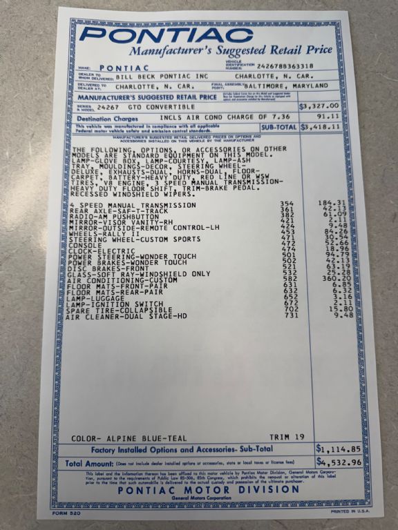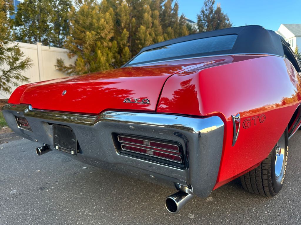 1968 PONTIAC GTO CONVERTIBLE 400CI/350HP V8 AUTO FACTORY A/C P.H.S.DOCUMENTED YEAR: 1968 MAKE: PONTIAC MODEL: GTO BODY: CONVERTIBLE COLOR: RED/BLACK TOP TRIM: BLACK BUCKETS ENGINE: 400CI/350HP TRANS: 4/SPEED REAR: DUAL GATE AUTOMATIC MILES: 07897 (TMU) SERIAL#: 242678P363318 OPTIONS 242 GTO *400CI/V8 4BBL *AUTOMATIC DUAL GATE TRANS *POWER STEERING *POWER DISC BRAKES *AM RADIO *RALLY II WHEELS *BUCKET SEATS *CONSOLE *GAUGES AND CLOCK *HOOD TACH *HIDE A WAY HEADLIGHTS *FACTORY AIR CONDITION*POWER TOP *POSI TRACTION*CUSTOM SPORT STEERING WHEEL *TINTED GLASS*TILT STEERING WHEEL*AM-FM 8/TRACK PIONEER RADIO SERIAL NUMBER BREAKDOWN 2-PONTIAC 42-GTO 67-CONVERTIBLE 8-1968 P-PONTIAC PLANT 363318-SRQ# COWL TAG 07C-BUILT 3RD WEEK OF JULY 24267- GTO CONVERTIBLE PON3926- PLANT # TRIM-219-TEAL PNT-D-5 ALPINE BLUE /TEAL TO DOCUMENTATION *PHS DOCUMENTATION *COPY ORIGINAL WINDOW STICKER *$70,000 WORTH OF DOCUMENTED RECEIPTS HISTORY/COMMENTS THIS REAL GTO WAS BOUGHT NEW IN CHARLOTTE N.C. THE CAR WAS BUILT WITH 4/SPEED AND BLUE EXTERIOR. THE OWNER SPENT CLOSE TO $70,000 NUT AND BOLT RESTORATION DONE BY A AWRD WINNING PROFESSIONAL SHOP TO CHANGE THIS REAL GTO TO A QUALITY LUXURY PERFORMANCE CAR. QUALITY THRU OUT FROM A LONG TIME OWNER . ALL THE RIGHT EQUIPMENT TO ENJOY.
