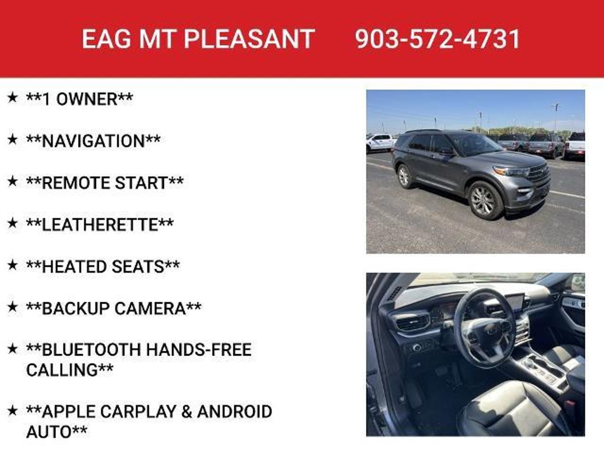 Discover the perfect blend of power, style, and advanced technology in this 2022 Ford Explorer XLT. This exceptional SUV is ready to elevate your driving experience with its impressive capabilities and thoughtfully designed features. - 1 OWNER - 2ND ROW BUCKET SEATS - 360 CAMERA - 3RD ROW SEATING - ADAPTIVE CRUISE CONTROL - APPLE CARPLAY & ANDROID AUTO - BACKUP CAMERA - BLIND SPOT SENSORS - BLUETOOTH HANDS-FREE CALLING - HEATED SEATS - LANE-KEEPING ASSIST - LEATHERETTE - NAVIGATION - REMOTE START Equipped with a 2.3L EcoBoost I-4 engine and a 10-Speed Automatic transmission, this Ford Explorer XLT delivers an exceptional balance of power and efficiency, with an EPA-estimated 21 MPG in the city and 28 MPG on the highway. The RWD drivetrain ensures confident handling and a responsive ride, while the comprehensive Ford Co-Pilot360 Assist suite of advanced driver-assistance technologies provides an extra layer of safety and convenience. The XLT Technology Package takes this Explorer to new heights, offering features like a Wireless Charging Pad, 360-Degree Camera with Split View, and a premium B&O Sound System by Bang & Olufsen. The Intelligent Adaptive Cruise Control and Evasive Steering Assist further enhance the driving experience, helping you navigate the road with ease and confidence. Exterior highlights include 20-inch Premium Painted Aluminum Wheels, LED Fog Lamps, and a Sideview Mirror package with power-folding, auto-dimming, and integrated turn signals. Step inside and you'll be greeted by a spacious and well-appointed cabin, featuring ActiveX Captain's Chairs, a Heated Steering Wheel, and a Voice-Activated Touchscreen Navigation System. Whether you're embarking on a family adventure or simply seeking a versatile and technologically advanced SUV, this 2022 Ford Explorer XLT is a must-see. Experience the difference for yourself and schedule a test drive today. This vehicle is located at EAG Mt. Pleasant, but can be made available upon request. The price listed does not include tax, title, license, or documentation fees ($225). We are located just west of Titus Regional Medical Center on the I-30 frontage road.