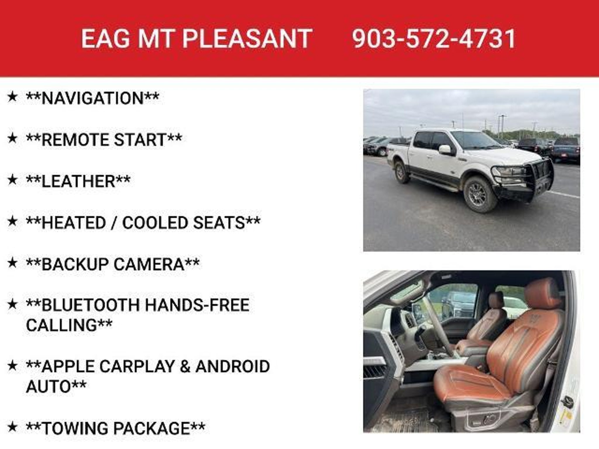 Discover the ultimate in power, capability, and refined luxury with this 2018 Ford F-150 King Ranch. This exceptional truck is the perfect companion for your adventures, whether you're towing a heavy load, navigating rugged terrain, or simply enjoying the open road in unparalleled comfort. Boasting a commanding 5.0L V8 engine mated to a smooth-shifting 10-speed automatic transmission, this F-150 King Ranch delivers exceptional performance and efficiency. The advanced 4WD system ensures confident handling in any conditions, while the extended-range 36-gallon fuel tank means you can go the distance without worry. - **4X4** - **APPLE CARPLAY & ANDROID AUTO** - **BACKUP CAMERA** - **BLUETOOTH HANDS-FREE CALLING** - **HEATED / COOLED SEATS** - **LEATHER** - **NAVIGATION** - **REMOTE START** - **TOWING PACKAGE** - **V8** - EXTENDED RANGE 36 GALLON FUEL TANK Step inside the cabin and you'll be surrounded by the finest materials and craftsmanship. The King Ranch's luxurious leather upholstery, heated and cooled front seats, and premium audio system create an unrivaled driving experience. The intuitive SYNC 3 infotainment system with navigation and voice control keeps you connected and in command. This F-150 is not only a powerhouse, but also a technological marvel. Features like the backup camera, blind spot monitoring, and advanced safety systems provide added peace of mind and convenience. The remote start and keyless entry make it easy to get on the road quickly, while the towing package ensures you can haul your toys with confidence. Whether you're tackling tough jobs or seeking a refined and capable daily driver, this 2018 Ford F-150 King Ranch is the perfect choice. Experience the ultimate in truck versatility and luxury. Visit our showroom today to take this impressive vehicle for a test drive. This vehicle is located at EAG Mt. Pleasant, but can be made available upon request. The price listed does not include tax, title, license, or documentation fees ($225). We are located just west of Titus Regional Medical Center on the I-30 frontage road.