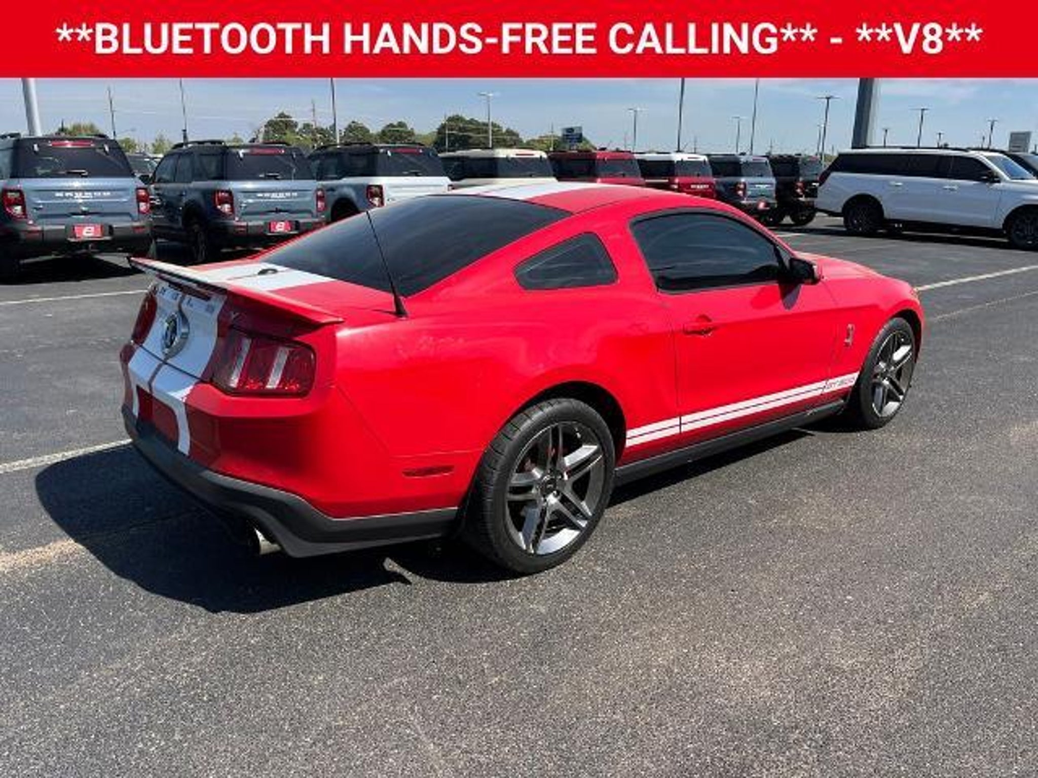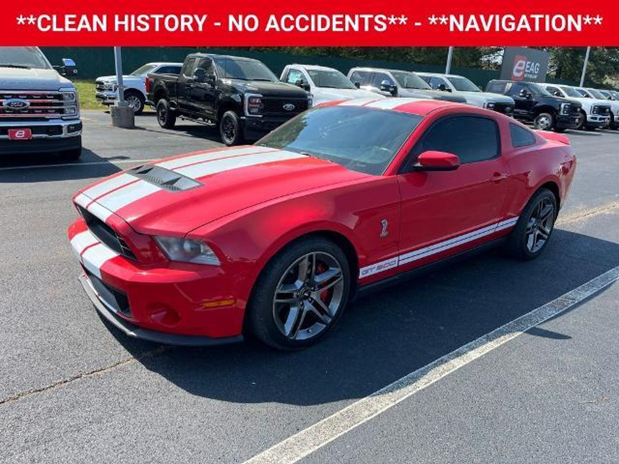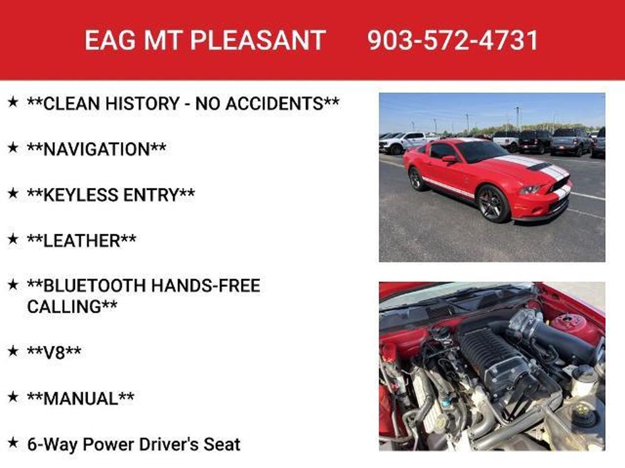 Unleash the power of the iconic 2010 Ford Mustang Shelby GT500 and experience the thrill of true American muscle. This exceptional sports car boasts a commanding presence and a performance pedigree that is sure to captivate any driving enthusiast. Meticulously equipped with a range of premium features, this Mustang Shelby GT500 is the embodiment of automotive excellence: - **BLUETOOTH HANDS-FREE CALLING** - **CLEAN HISTORY - NO ACCIDENTS** - **KEYLESS ENTRY** - **LEATHER** - **MANUAL** - **NAVIGATION** - **V8** - 6-Way Power Driver's Seat Beneath the striking red exterior lies a heart-pounding 5.4L V8 32V Supercharged engine, mated to a precision Tremec 6-Speed Manual transmission, delivering an exhilarating driving experience. With 14 MPG in the city and 22 MPG on the highway, this Shelby GT500 offers a thrilling performance without compromising efficiency. Slip behind the wheel and you'll be surrounded by a wealth of premium amenities, including a Shaker 500 audio system, dual-zone automatic climate control, and a voice-activated navigation system. The leather-wrapped steering wheel and sport bucket seats provide the perfect blend of comfort and control, ensuring you'll arrive at your destination in style and comfort. Safety is equally paramount, with features like electronic stability control, traction control, and a suite of airbags providing peace of mind on the open road. The 19-inch premium painted aluminum wheels and high-performance brakes further enhance the Shelby GT500's dynamic capabilities, making it a true driver's machine. This exceptional 2010 Ford Mustang Shelby GT500 is a rare find, and it won't be available for long. Don't miss your chance to experience the power, style, and prestige of this iconic American sports car. Contact us today to schedule a test drive and make this Shelby GT500 your own. This vehicle is located at EAG Mt. Pleasant, but can be made available upon request. The price listed does not include tax, title, license, or documentation fees ($225). We are located just west of Titus Regional Medical Center on the I-30 frontage road.