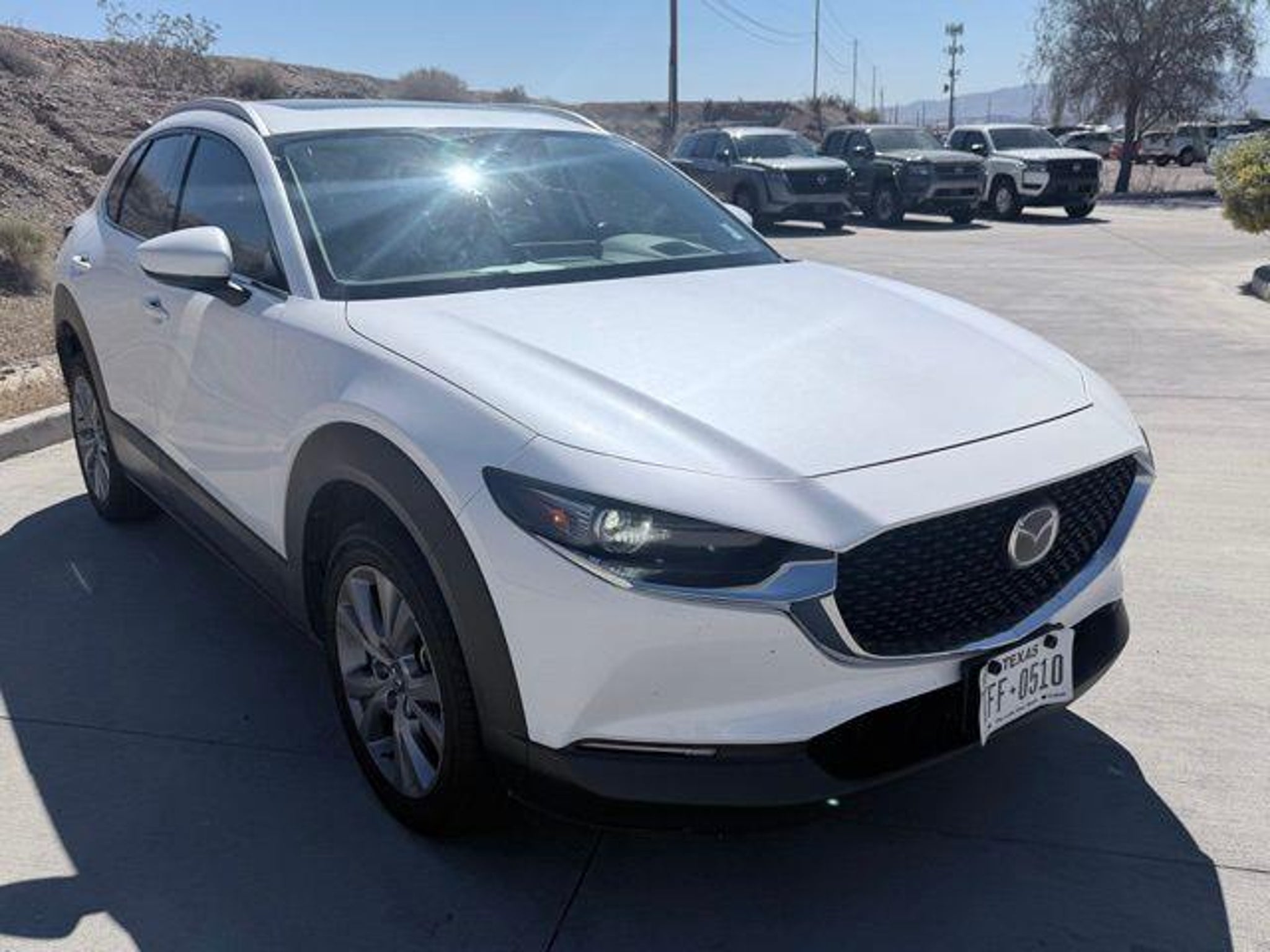 Snowflake White Pearl Mica 2023 Mazda CX-30 2.5 S Premium Package AWD 6-Speed Automatic SKYACTIV® 2.5L 4-Cylinder DOHC 16V 4-Wheel Disc Brakes, 4.095 Axle Ratio, 8 Speakers, ABS brakes, Air Conditioning, Alloy wheels, AppLink/Apple CarPlay and Android Auto, Auto High-beam Headlights, Automatic temperature control, Bose Audio Credit, Brake assist, Bumpers: body-color, Compass, Delay-off headlights, Driver door bin, Driver vanity mirror, Dual front impact airbags, Dual front side impact airbags, Electronic Stability Control, Emergency communication system: Mazda Connected Services (3-year complimentary trial included), Exterior Parking Camera Rear, Front anti-roll bar, Front Bucket Seats, Front Center Armrest, Front dual zone A/C, Front reading lights, Front wheel independent suspension, Fully automatic headlights, Heads-Up Display, Heated Front Bucket Seats, Heated front seats, Illuminated entry, Knee airbag, Leather Seat Trim, Leather Shift Knob, Leather steering wheel, Low tire pressure warning, MAZDA CONNECT Infotainment System, Memory seat, Navigation system: MAZDA CONNECT, Occupant sensing airbag, Outside temperature display, Overhead airbag, Overhead console, Panic alarm, Passenger door bin, Passenger vanity mirror, Power door mirrors, Power driver seat, Power Liftgate, Power moonroof, Power steering, Power windows, Radio data system, Radio: AM/FM/HD Audio System w/Mazda Navigation, Rain sensing wipers, Rear seat center armrest, Rear side impact airbag, Rear window defroster, Rear window wiper, Remote keyless entry, Snowflake White Pearl Mica Paint, Speed control, Speed-sensing steering, Split folding rear seat, Spoiler, Steering wheel mounted audio controls, Tachometer, Telescoping steering wheel, Tilt steering wheel, Traction control, Trip computer, Turn signal indicator mirrors, Variably intermittent wipers, Wheel Locks, Wheels: 18 x 7J Aluminum Alloy. 26/33 City/Highway MPG WHY BUY FROM ANDERSON: All Anderson pre-owned vehicles include a one-year/15,000 mile (whichever occurs first) vehicle maintenance plan when the vehicle is serviced at an Anderson Auto Group dealership. Out of town customers will be accommodated with free shuttle service from Las Vegas and Phoenix airports and if an overnight stay is needed, discounted nightly rates are available from local hotels. We welcome you to come in and enjoy a positive buying experience and look forward to you joining the Anderson family of customers. DISCLAIMER: *Prices, options, specifications and images shown are subject to certain qualifications and availability. Pricing information is not final and may not include taxes, registration, finance and purchase fees. Please confirm vehicle availability and pricing information by calling us at or emailing our internet sales department at .