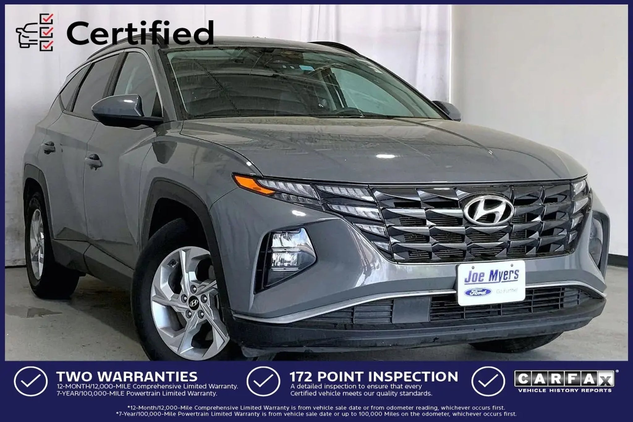 Discover the perfect blend of style, comfort, and capability with the 2024 Hyundai Tucson SEL. This exceptional SUV is ready to elevate your driving experience and exceed your expectations. - Aluminum Wheels - Bluetooth - Clean Carfax - Local Trade - Non-Smoker - ONE OWNER - Rear View Camera - Carpeted Floor Mats - Option Group 01 Boasting a sleek gray exterior and a spacious, well-appointed interior, the Tucson SEL is designed to impress. Powered by a 2.5L I4 DGI DOHC 16V engine, this SUV delivers an impressive 187 horsepower and an exceptional fuel efficiency of 25 city/32 highway MPG, making it both powerful and economical. Step inside and experience the advanced technology that sets the Tucson SEL apart. With features like Apple CarPlay, Android Auto, and a premium audio system, you'll enjoy seamless connectivity and a truly immersive driving experience. The Tucson also comes equipped with a host of safety features, including Blind Spot Monitoring, Rear Cross-Traffic Alert, and Forward Collision-Avoidance Assist, ensuring your peace of mind on the road. This Tucson SEL is a certified pre-owned vehicle, meaning it has undergone a rigorous inspection and comes with a comprehensive warranty, giving you the confidence to make this your next family SUV. With its impressive performance, cutting-edge technology, and uncompromising safety, the 2024 Hyundai Tucson SEL is the perfect choice for those seeking a versatile and well-equipped SUV. Experience the difference for yourself. Visit our showroom today and let us demonstrate the exceptional value and capabilities of this Tucson SEL. We're confident you'll be impressed by its exceptional features and the seamless ownership experience it provides.