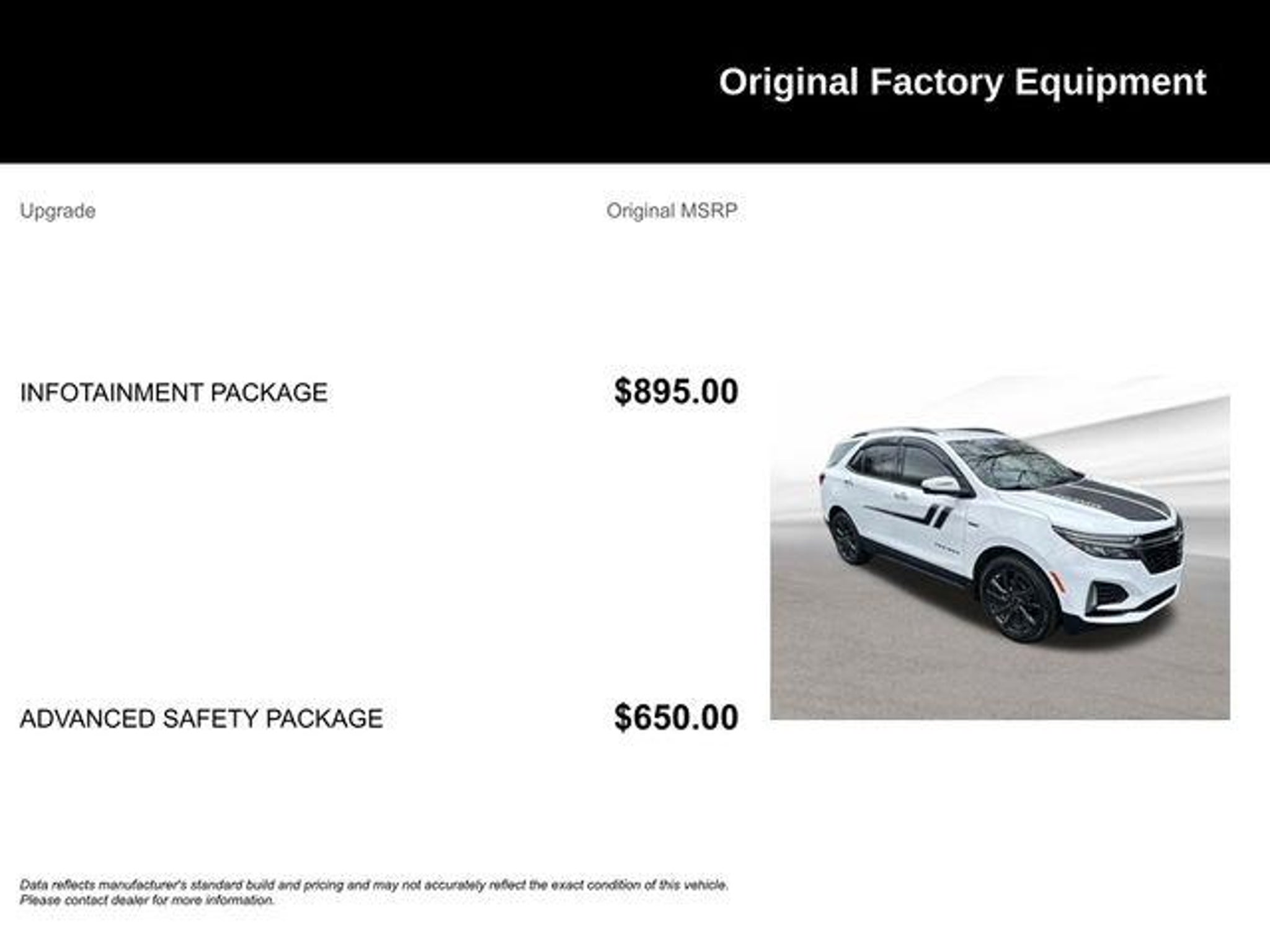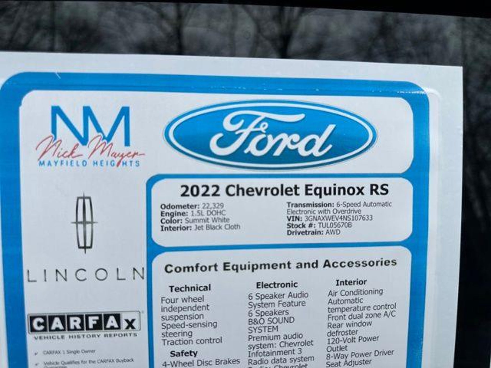 Details > 2022 Chevrolet Equinox 4X4 RS 4DR SUV For Sale in Mayfield Heights, OH Private Party Sellers Click here to place your ad now! You auta tell them you saw the ad in AutaBuy when you call or email. 1/39 2/39 3/39 4/39 5/39 6/39 7/39 8/39 9/39 10/39 11/39 12/39 13/39 14/39 15/39 16/39 17/39 18/39 19/39 20/39 21/39 22/39 23/39 24/39 25/39 26/39 27/39 28/39 29/39 30/39 31/39 32/39 33/39 34/39 35/39 36/39 37/39 38/39 39/39 View 39 Photos View All Add to My Garage Parked in Your Garage! Nick Mayer Ford Contact Seller: I would like to: Make Offer Check Availability Ask A Question Request More Photos Check Financing Options Send a copy of this message to me Add this listing to my garage Send to Mobile Mileage 22,329 Exterior Color Summit White Interior Color Jet Black Doors 4 Engine 1.5L I4 Transmission 6 Speed Auto Stock # TUL05670B VIN 3GNAXWEV4NS107633 Estimated Monthly Payment $417 mo Apply Now J.J. Best Banc & Co. 2022 Chevrolet Equinox 4X4 RS 4DR SUV Description: 2022 Chevrolet Equinox RS Summit White Recent Arrival! AWD. CARFAX One-Owner. Priced below KBB Fair Purchase Price! 25/30 City/Highway MPG Odometer is 21761 miles below market average! · Mileage: 22,329 · Color: Summit White Price: $24,970. Price: $23,970. Mileage 22,329 Exterior Color Summit White Interior Color Jet Black Doors 4 Engine 1.5L I4 Transmission 6 Speed Auto Stock # TUL05670B VIN 3GNAXWEV4NS107633 Estimated Monthly Payment $417 mo Apply Now J.J. Best Banc & Co. Add to My Garage Parked in Your Garage! Message Seller Nick Mayer Ford Contact Seller: I would like to: Make Offer Check Availability Ask A Question Request More Photos Check Financing Options Send a copy of this message to me Add this listing to my garage Offered for sale by Nick Mayer Ford MAYFIELD HEIGHTS, OH Price: $24,970. Price: $23,970. Offered for sale by Nick Mayer Ford MAYFIELD HEIGHTS, OH [entire inventory] Ask Auta Intelligence The first collector-car AI built directly into a classic car marketplace When was this model first introduced? What does this VIN number tell me? What trim levels were available for this model? How far is this from me? How many of these were produced? What safety features does this model offer? How many Equinoxs were produced in White? Where is this located? How many passengers can this seat comfortably? What engine options did these come with? What kind of mileage do these get? How easy are parts to find for this model? What colors did these come in? What transmission options did these offer? Can you show me more suvs for a similar price? Tell me about this model What factory options were available on this model? Do you have a similar car to sell? List It Now! Questions about this car? Ask Auta Intelligence for production numbers, available options, etc. · Subscribe to AutaBuy! · Send a Gift Subscription Notice to a Friend