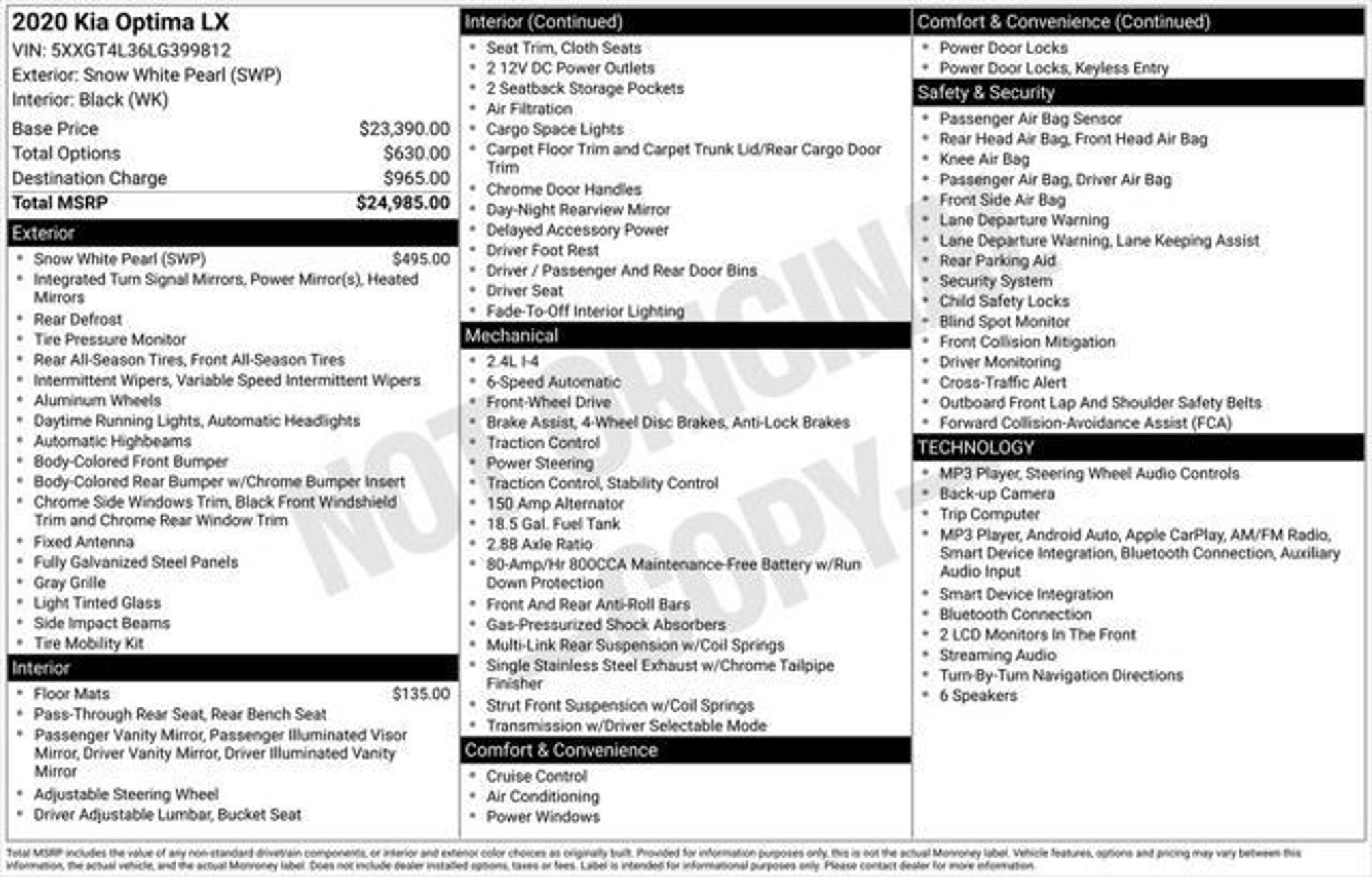 Elevate your driving experience with the 2020 Kia Optima LX. This exceptional sedan boasts a captivating exterior in the stunning White color, complemented by a spacious and well-appointed interior. Powered by a 2.4L I4 DGI DOHC engine and paired with a 6-Speed Automatic with Sportmatic transmission, this Optima LX delivers an impressive balance of performance and efficiency, with an EPA-estimated 24 MPG in the city and 32 MPG on the highway. - Enjoy the convenience of features such as - Carpet Floor Mats, Snow White Pearl exterior color, and White interior. - Stay connected with the impressive infotainment system, featuring Apple CarPlay and Android Auto integration. - Experience the comfort of the Cloth Seat Trim, along with the added utility of the Split folding rear seat. - Enhance your driving experience with the Tilt and Telescoping steering wheel, Steering wheel mounted audio controls, and Cruise Control. - Stay safe with the comprehensive suite of advanced safety technologies, including Dual front impact airbags, Dual front side impact airbags, Knee airbag, and Electronic Stability Control. - Indulge in the premium feel of the 6.5J x 16 Silver Alloy Wheels, adding a touch of style to your daily commute. This 2020 Kia Optima LX is the perfect blend of style, technology, and safety, making it an exceptional value proposition in the midsize sedan segment. With its impressive features and efficient performance, it's the ideal choice for discerning drivers seeking a well-rounded and reliable vehicle. We invite you to experience the Optima LX for yourself and discover the joy of driving this exceptional Kia sedan.