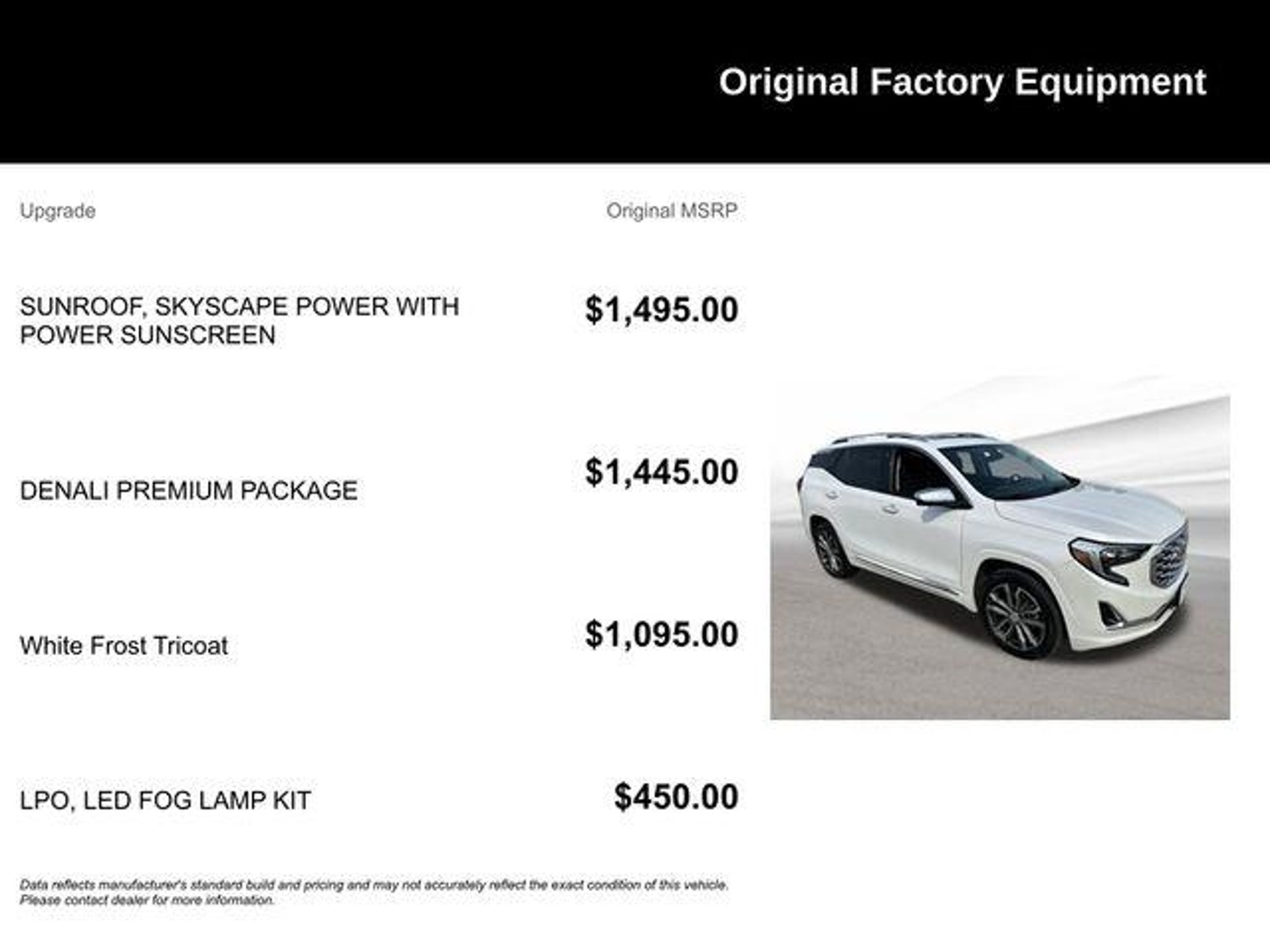 Details > 2020 GMC Terrain 4X4 Denali 4DR SUV For Sale in Mayfield Heights, OH Private Party Sellers Click here to place your ad now! You auta tell them you saw the ad in AutaBuy when you call or email. 1/40 2/40 3/40 4/40 5/40 6/40 7/40 8/40 9/40 10/40 11/40 12/40 13/40 14/40 15/40 16/40 17/40 18/40 19/40 20/40 21/40 22/40 23/40 24/40 25/40 26/40 27/40 28/40 29/40 30/40 31/40 32/40 33/40 34/40 35/40 36/40 37/40 38/40 39/40 40/40 View 40 Photos View All Add to My Garage Parked in Your Garage! Nick Mayer Ford Contact Seller: I would like to: Make Offer Check Availability Ask A Question Request More Photos Check Financing Options Send a copy of this message to me Add this listing to my garage Send to Mobile Mileage 75,094 Exterior Color White Frost Tri-Coat Interior Color Jet Black Doors 4 Engine 2.0L I4 Transmission 9 Speed Auto Stock # TUL01383A VIN 3GKALXEX5LL305998 Estimated Monthly Payment $382 mo Apply Now J.J. Best Banc & Co. 2020 GMC Terrain 4X4 Denali 4DR SUV Description: 2020 GMC Terrain Denali White Frost Tricoat Recent Arrival! AWD. CARFAX One-Owner. Clean CARFAX. 21/26 City/Highway MPG · Mileage: 75,094 · Color: White Frost Tri-Coat Price: $21,970. Mileage 75,094 Exterior Color White Frost Tri-Coat Interior Color Jet Black Doors 4 Engine 2.0L I4 Transmission 9 Speed Auto Stock # TUL01383A VIN 3GKALXEX5LL305998 Estimated Monthly Payment $382 mo Apply Now J.J. Best Banc & Co. Add to My Garage Parked in Your Garage! Message Seller Nick Mayer Ford Contact Seller: I would like to: Make Offer Check Availability Ask A Question Request More Photos Check Financing Options Send a copy of this message to me Add this listing to my garage Offered for sale by Nick Mayer Ford MAYFIELD HEIGHTS, OH Price: $21,970. Offered for sale by Nick Mayer Ford MAYFIELD HEIGHTS, OH [entire inventory] Ask Auta Intelligence The first collector-car AI built directly into a classic car marketplace Where is this located? What transmission options did these offer? Tell me the history on this model When was this model first introduced? How far is this from me? How many of these were produced? What engine options did these come with? What kind of mileage do these get? What trim levels were available for this model? What does this VIN number tell me? How many passengers can this seat comfortably? What factory options were available on this model? What safety features does this model offer? How easy are parts to find for this model? How many Terrains were produced in White? Can you show me more suvs for a similar price? What colors did these come in? Do you have a similar car to sell? List It Now! Questions about this car? Ask Auta Intelligence for production numbers, available options, etc. · Subscribe to AutaBuy! · Send a Gift Subscription Notice to a Friend