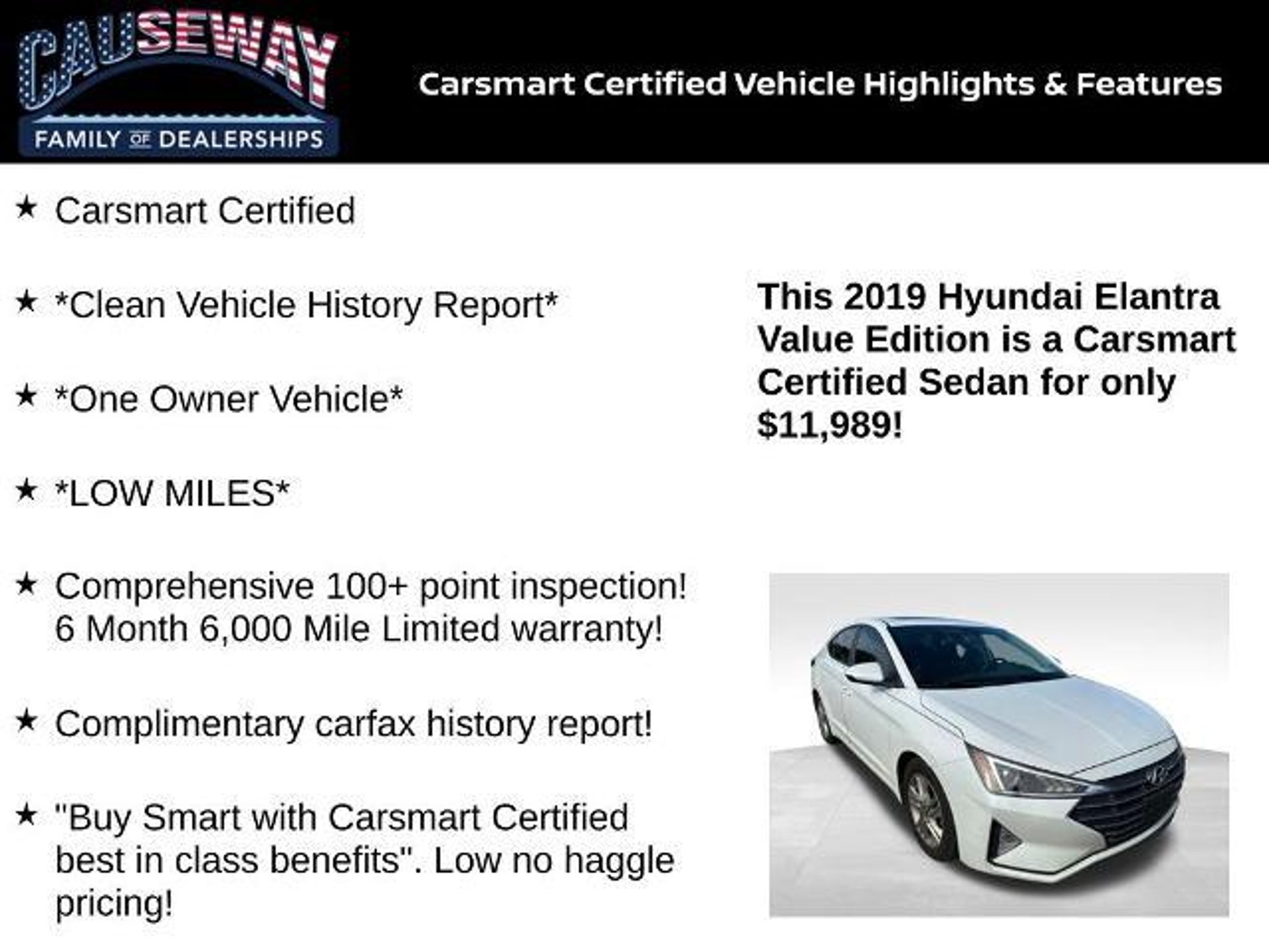 2019 Hyundai Elantra Value Edition Quartz White Pearl FWD 6-Speed Automatic with Shiftronic 2.0L 4-Cylinder DOHC 16V Carsmart Certified, *Clean Vehicle History Report*, *One Owner Vehicle*, *LOW MILES*, Comprehensive 100 point inspection! 6 Month 6,000 Mile Limited warranty!, Complimentary carfax history report!, Buy Smart with Carsmart Certified best in class benefits. Low no haggle pricing!. Recent Arrival! 28/37 City/Highway MPG Certification Program Details: 6 month/6000 mile warranty, powertrain 100 point inspection, Free Carfax history report, available Extended Protection! Ask us how you can make money using our Causeway Referral Rewards Program!