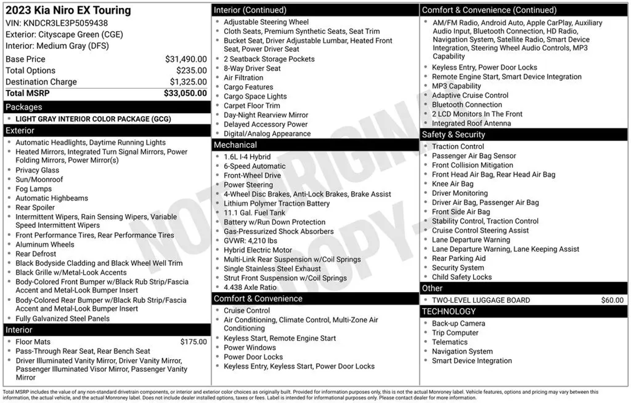 Experience the exceptional 2023 Kia Niro EX Touring, a masterfully crafted hybrid that seamlessly blends style, efficiency, and advanced technology. This striking vehicle, dressed in a captivating Green exterior, is poised to elevate your driving experience. Tailored to meet your needs, the Niro EX Touring offers a curated selection of premium features, including: - Carpet Floor Mats - Two-Level Luggage Board - Light Gray Interior Color Package Beneath the sleek exterior lies a 1.6L I4 DGI Hybrid DOHC 16V LEV3-SULEV30 engine, delivering an exceptional fuel economy of 53 city MPG and 45 highway MPG. This powertrain, paired with a 6-Speed Automatic transmission and Front-Wheel Drive, ensures a responsive and efficient driving experience. Stepping inside, you'll be greeted by a wealth of advanced technologies designed to enhance your daily commute. The Niro EX Touring boasts a Navigation System, 6 Speakers, AM/FM/HD/SiriusXM radio, and seamless integration with Apple CarPlay and Android Auto. Dual-zone automatic climate control and a power driver's seat provide unparalleled comfort, while the Smart Key with Push-Button Start and Remote Start add a touch of convenience. Safety is paramount in the Niro EX Touring, with features like Dual Front Impact Airbags, Dual Front Side Impact Airbags, Knee Airbag, Overhead Airbag, and an Emergency Communication System. The Rear Camera, Automatic High-Beam Headlights, and Brake Assist further enhance your peace of mind on the road. Elevate your driving experience with the 2023 Kia Niro EX Touring. This exceptional hybrid offers a compelling blend of style, efficiency, and technology, making it the perfect companion for your daily adventures. Visit our showroom today and discover the true essence of modern, eco-conscious driving.