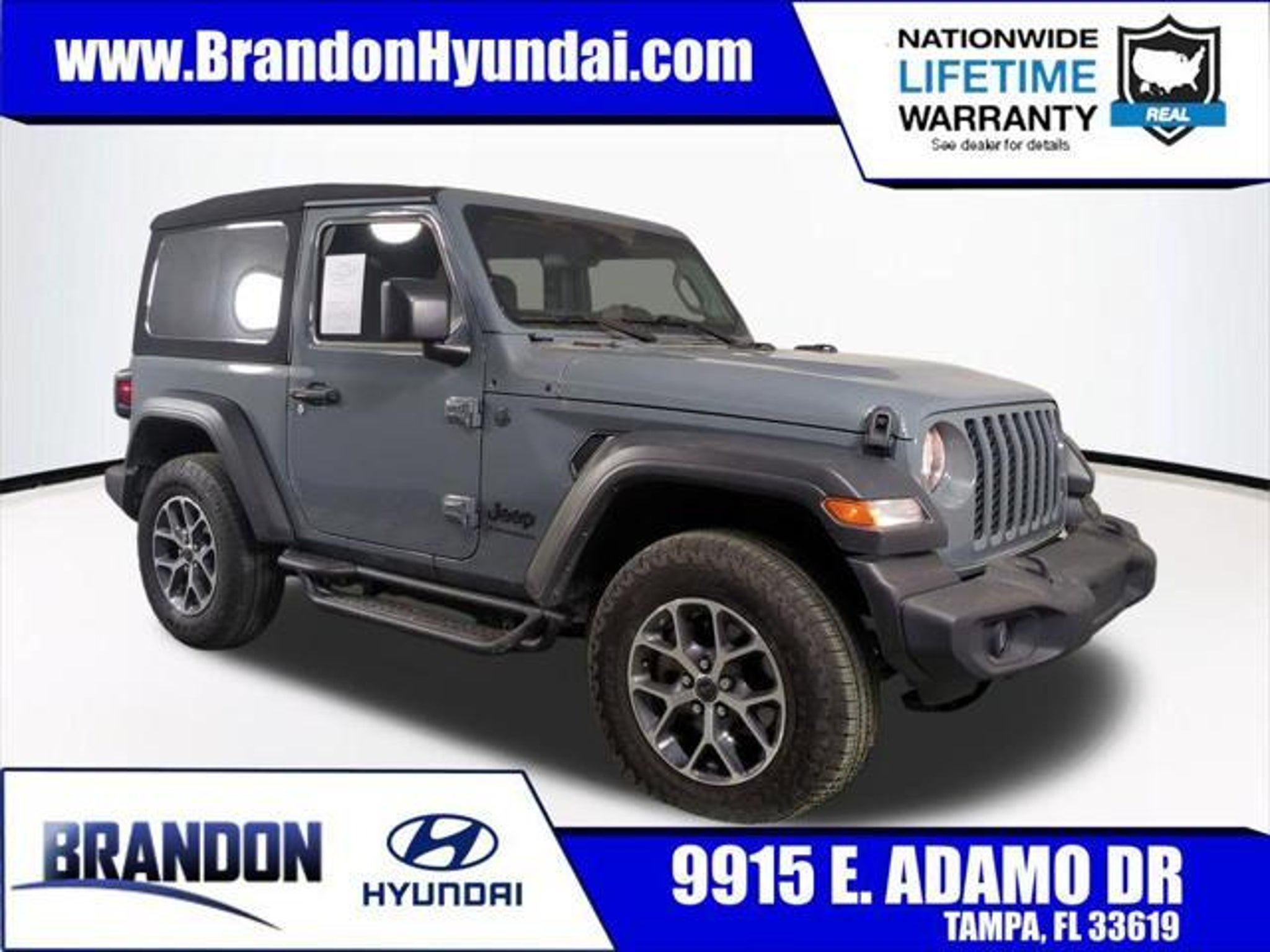 2024 Jeep Wrangler Sport S 4WD ???????????????????????????????????????????????????????????? NATIONWIDE LIFETIME WARRANTY INCLUDED ???????????????????????????????????????????????????????????? Unlimited Time Unlimited Miles Nationwide Coverage 2 Complimentary Oil Changes Every qualifying vehicle includes the Brandon Hyundai Certified Real Nationwide Lifetime Warranty with unlimited time and unlimited miles at certified repair facilities across the United States. ??? BALANCE OF FACTORY WARRANTY ??? CLEAN CARFAX ??? Dealer-Inspected ??? Fully Reconditioned ??? Smoke-Free ???????????????????????????????????????????????????????????? VEHICLE HIGHLIGHTS ???????????????????????????????????????????????????????????? ??? 2.0L Turbocharged I4 Engine ??? 8-Speed Automatic Transmission ??? 4-Wheel Drive ??? 17??? Machined Wheels wBlack Pockets ??? Uconnect?? 5 w12.3??? Touchscreen ??? Android Auto ??? Apple CarPlay ??? Back-Up Camera ??? Bluetooth Hands-Free ??? Enhanced Adaptive Cruise Control ??? Corning?? Gorilla?? Glass ??? Premium Wrapped Steering Wheel ??? 8-Speaker Audio System This Wrangler Sport S blends iconic Jeep capability with modern technology and everyday drivability. ???????????????????????????????????????????????????????????? WHY THIS WRANGLER? ???????????????????????????????????????????????????????????? Wrangler remains the benchmark for true off-road SUVs. Buyers comparing: ??? Ford Bronco ??? Toyota 4Runner ??? Chevy Colorado ZR2 ??? Nissan Frontier PRO-4X Will appreciate Wrangler???s removable topdoors capability 4WD system turbocharged torque and the added protection of Brandon Hyundai???s Nationwide Lifetime Warranty. This is legendary 4x4 ownership with long-term confidence built in. ???????????????????????????????????????????????????????????? ???? CALL FOR FASTEST RESPONS