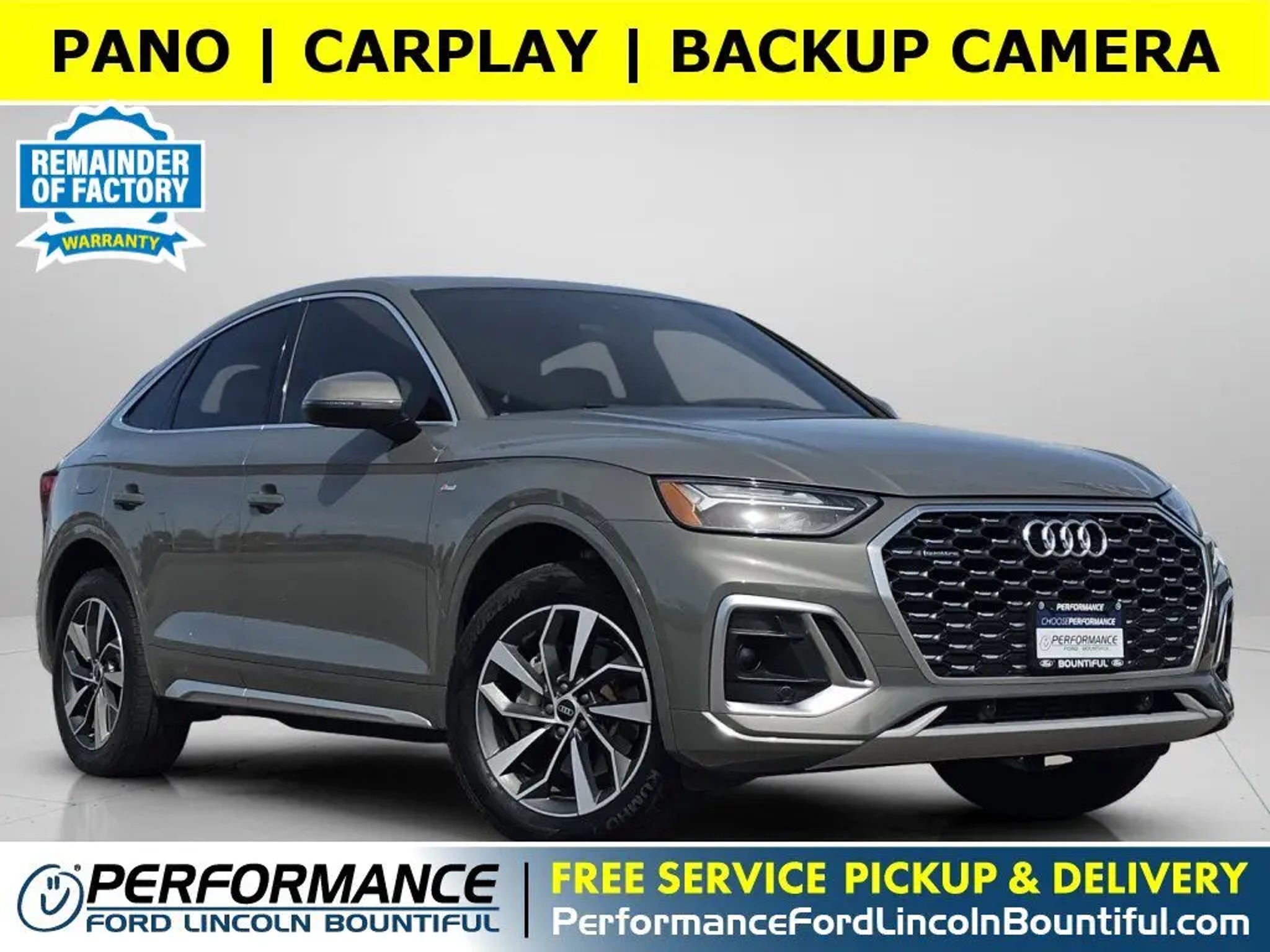This *2023 Audi Q5 Sportback 45 S line Premium* is loaded with convenient features like LEATHER, POWER LIFTGATE, MOONROOF, HEATED SEATS, BACKUP CAMERA, ALLOY-WHEELS, POWER SEAT, FOG LAMPS, Remote Entry.This stunning *2023 Audi Q5 Sportback 45 S line Premium* features a beautiful *Gray* exterior and a *Black* interior.Compare, adjust and save your payment options on every vehicle in stock at: PerformanceFordBountiful.com*Technology and Entertainment Features Include:* SiriusXM Satellite Radio, Garage Door Opener, Homelink System and Automatic Climate Control, Heated Steering Wheel, Rear Heat / AC, Compass, Woodgrain Trim, Memory Seats, Rear Reading Lights, Bucket Front Seats, Steering Wheel Audio Controls, Air Conditioning, Telescoping Wheel, Illuminated entry, Rear Seat Center Armrest, Auto Dimming R/V Mirror, Multi-zone Climate Control, Center Console Storage, Reading Lights, Vanity Mirrors, Rear Window Defroster, Trip Odometer, Tilt Steering Wheel, Outside Temperature Gauge, Center Armrest, Split Folding Rear Seat, Overhead Console, AM/FM Stereo.*Safety and Economy Features Include:* Back-Up Camera, Electronic Stability Control, Rain Sensing Wipers, Security System, Emergency SOS system, Integrated Turn Signal Mirrors, Brake Assist, Aftermarket Anti Theft System, ABS Brakes, Tire Pressure Monitoring System, Overhead airbag, Speed Sensitive Power Steering, Delay-off headlights, Dual Air Bags, Auto Highbeams, Driver Front Side Impact Air Bag, Passenger Air Bag Sensor, Low tire pressure warning.This vehicle has an EPA rated fuel economy of 29.0 highway / 22.0 city1.Performance Ford Lincoln Bountiful proudly offer our customers at-home services including *Performance Valet*! When you purchase from Performance Ford Lincoln Bountiful, you will be eligible for *FREE Pickup & Delivery*^ for your future service appointments! We value your time and that's why want to give you the best buying and service experiences in Bountiful! Also, ask your product specialist about our home test drives and deliveries. Save time and money through our exclusive Performance Remote Services! Distance limitations may apply.Our dealership is conveniently located off Exit 315 on I-15, North of Salt Lake City. We proudly serve the communities of Bountiful, Centerville, North Salt Lake, Farmington, Salt Lake City, Kaysville, South Salt Lake, Layton, Canyon Rim, Millcreek, West Valley City, Murray, Holladay, Taylorsville, and Syracuse. As a proud member of the family-owned Performance Automotive Network, we have access to thousands of new and used vehicles. This gives us the ability to find the perfect vehicle to fit your needs and budget.*Need financing assistance?* Our strong, group-wide relationships with several lending institutions allow us to offer the most competitive rates! We will give you top-dollar for your trade or make you a cash offer if you'd prefer the convenience of selling directly.With our aggressive pricing strategy, most vehicles sell within the first few weeks, so please contact us ahead of time at * * to ensure the vehicle is still available and ready for your test drive.*We'll Put A Smile On Your Face! *1Based on EPA mileage ratings. Use for comparison purposes only. Your mileage will vary depending on driving conditions, how you drive and maintain your vehicle, etc.*Terms and conditions of warranties vary by brand and vehicle. See dealer for complete details or sign in to download a copy of your vehicle's warranty. Warranty may be restricted or denied if your vehicle or part has been modified, improperly maintained or removed.Delivery to door for Test Drive.