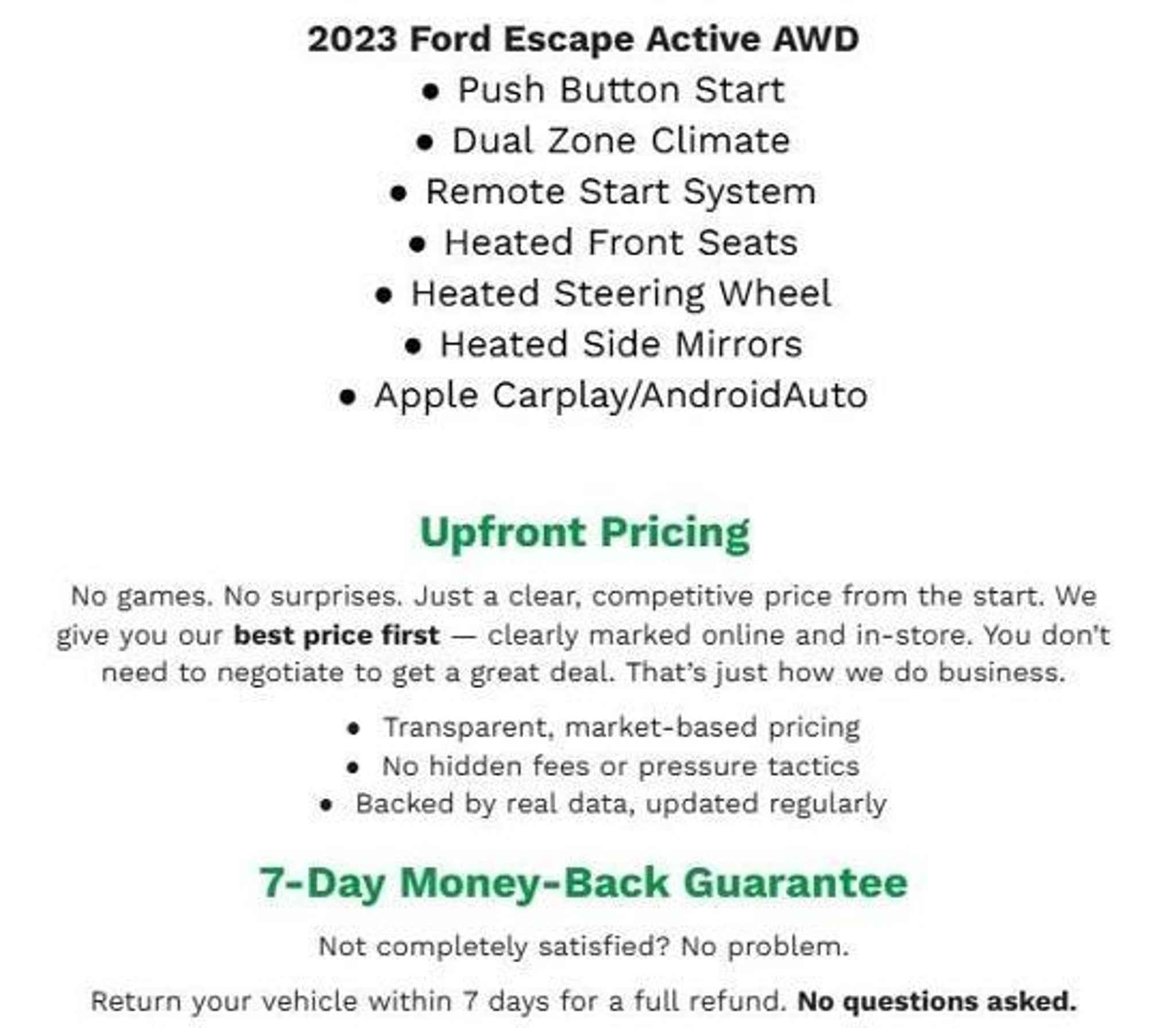 Recent Arrival! 2023 Ford Escape Active CARFAX One-Owner. Agate Black Metallic AWD 1.5L EcoBoost26/32 City/Highway MPGBergstrom Ford of Oshkosh wants to buy your vehicle - even if you don't buy ours. Get your free and quick offer to purchase. To get our top dollar offer, call our Bergstrom Buying Team Hotline at 920-429-6222 Equipment Group 200A, Tech Pack #1 (Rear Parking Sensor, Connected Built-In Navigation, Speed Sign Recognition, SYNC 4 w/Enhanced Voice Recognition, Ford Co-Pilot360 Assist, Intelligent Adaptive Cruise Control w/Stop-and-Go, and Rear-View Camera), Tech Pack #2 (Body Color Mirrors, 12.3 Productivity Screen in Instrument Cluster, Intersection Assist, Wireless Charging Pad, Reverse Brake Assist, SecuriCode Keyless Entry Keypad, HD Radio, Radio: B&O Sound System by Bang & Olufsen, 360-Degree Camera w/Split View, Ford Co-Pilot360 Assist 2.0, 10-Way Power Driver's Seat, and 6-Way Power Passenger Seat), Smoker's Package, Memory Package, Power Liftgate, Engine Block Heater, Front License Plate Bracket, Splash Guards, Heated door mirrors, Bumpers: body-color, Spoiler, Power door mirrors, Front & Rear Floor Liners w/Carpet Mats, Front & Rear Floor Liners w/o Carpet Mats, Cargo Mat, First Aid Kit, Unique Cloth Front Bucket Seats, Ash Cup w/Coin Holder, Center Console In-Vehicle Safe by Console Vault, Telescoping steering wheel, Illuminated entry, Heated steering wheel, Outside temperature display, Rear seat center armrest, Compass, Overhead console, Tilt steering wheel, Front reading lights, Driver door bin, Driver vanity mirror, Trip computer, Passenger vanity mirror, Rear reading lights, Tachometer, Rear window defroster, Air Conditioning, Automatic temperature control, Front dual zone A/C, Power driver seat, Power windows, Power steering, Remote keyless entry, Steering wheel mounted audio controls, Reduced Capacity Amplifier (Discontinued), AM/FM Stereo, SYNC 4, AM/FM radio: SiriusXM, Radio data system, 6 Speakers, FordPass Connect, 4-Wheel Disc Brakes, Emergency communication system: SYNC 4 911 Assist, Rear anti-roll bar, Dual front impact airbags, ABS brakes, Overhead airbag, Dual front side impact airbags, Knee airbag, Low tire pressure warning, Occupant sensing airbag, Front anti-roll bar, Speed-sensing steering, Traction control, Four wheel independent suspension, Easy Access Cargo Shade, Cargo Organizer, Soft-Sided Standard, Folding, Cargo Organizer, Soft-Sided Large, Folding, Cargo Organizer, Soft-Sided Cooler Bag, Black Roof-Rack Side Rails, Passenger door bin, Ro