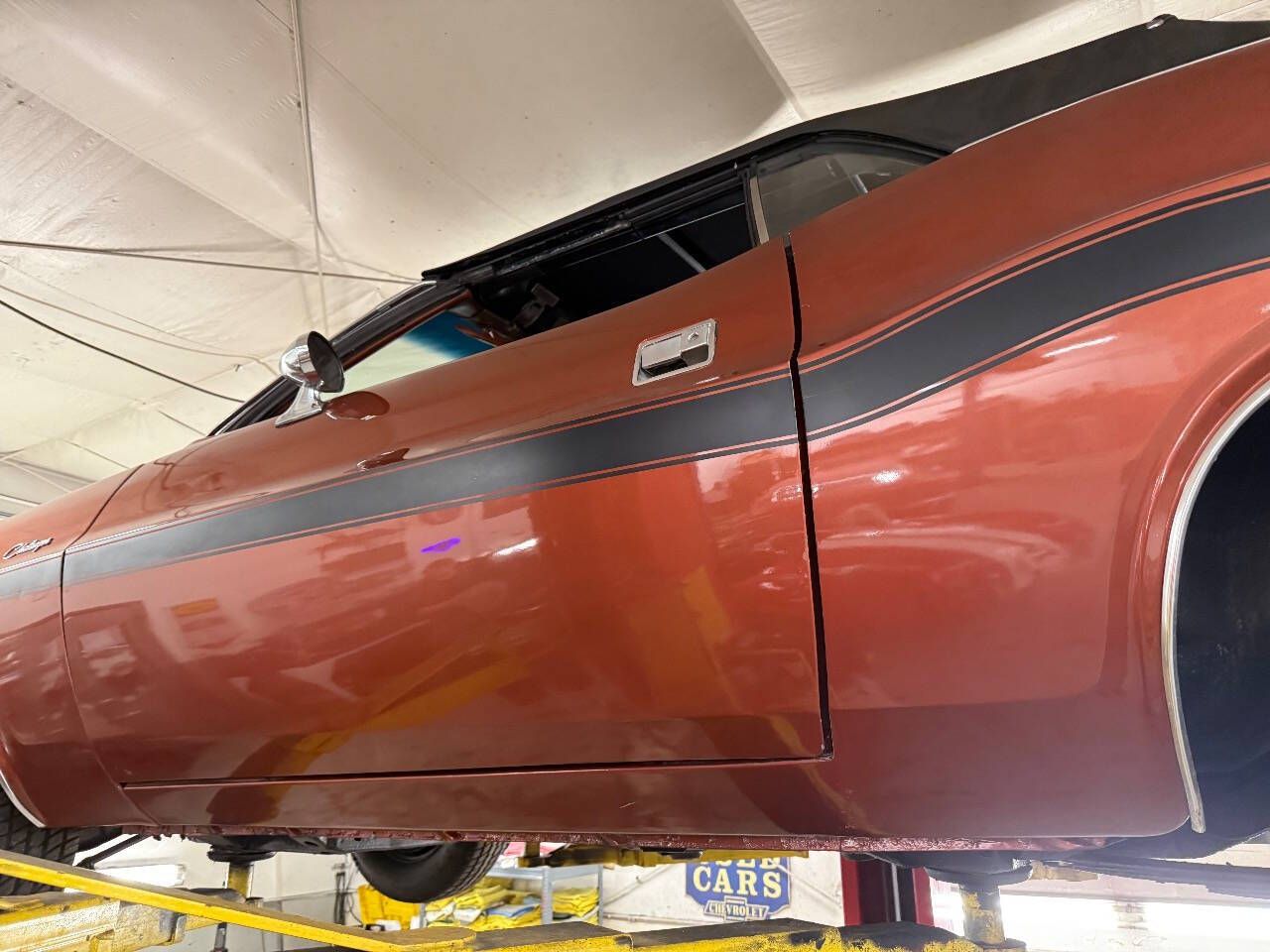 New arrival! Call for more information! 1970 Challenger convertible 383 automatic, power steering power black vinyl top showing believed actual 69,071 miles with one repaint in Dark Burnt orange metallic paint with matching burnt orange interior with aftermarket radio. Original chrome bumpers.