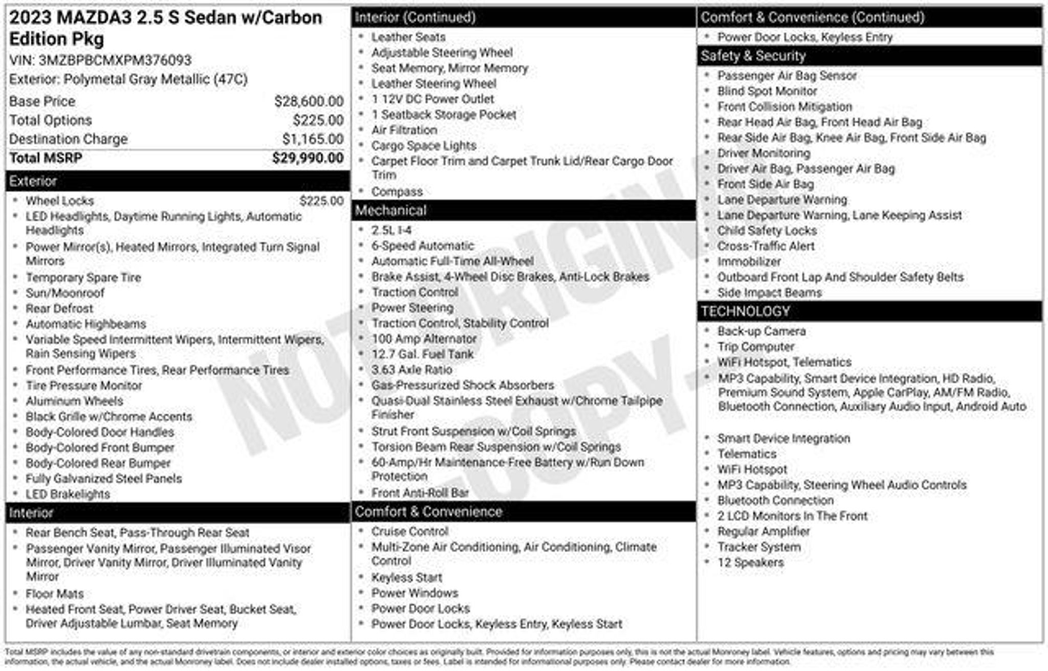 Details > 2023 Mazda MAZDA3 Sedan AWD 2.5 S Carbon Edition 4DR Sedan For Sale in Chico, CA Private Party Sellers Click here to place your ad now! You auta tell them you saw the ad in AutaBuy when you call or email. 1/34 2/34 3/34 4/34 5/34 6/34 7/34 8/34 9/34 10/34 11/34 12/34 13/34 14/34 15/34 16/34 17/34 18/34 19/34 20/34 21/34 22/34 23/34 24/34 25/34 26/34 27/34 28/34 29/34 30/34 31/34 32/34 33/34 34/34 View 34 Photos View All Add to My Garage Parked in Your Garage! Ed Wittmeier Ford Contact Seller: I would like to: Make Offer Check Availability Ask A Question Request More Photos Check Financing Options Send a copy of this message to me Add this listing to my garage Send to Mobile Mileage 17,885 Exterior Color Polymetal Gray Metallic Interior Color Red Doors 4 Engine 2.5L I4 Transmission 6 Speed Auto Stock # 26H0849B VIN 3MZBPBCMXPM376093 Estimated Monthly Payment $452 mo Apply Now J.J. Best Banc & Co. 2023 Mazda MAZDA3 Sedan AWD 2.5 S Carbon Edition 4DR Sedan Description: CARFAX One-Owner. Clean CARFAX. 2023 Mazda Mazda3 2.5 S Carbon Edition Polymetal Gray Metallic AWD 2.5L I4 DOHC 16V LEV3-SULEV30 191hp 6-Speed Automatic Recent Arrival! Odometer is 11541 miles below market average! 26/35 City/Highway MPG · Mileage: 17,885 · Color: Polymetal Gray Metallic Price: $25,985. Mileage 17,885 Exterior Color Polymetal Gray Metallic Interior Color Red Doors 4 Engine 2.5L I4 Transmission 6 Speed Auto Stock # 26H0849B VIN 3MZBPBCMXPM376093 Estimated Monthly Payment $452 mo Apply Now J.J. Best Banc & Co. Add to My Garage Parked in Your Garage! Message Seller Ed Wittmeier Ford Contact Seller: I would like to: Make Offer Check Availability Ask A Question Request More Photos Check Financing Options Send a copy of this message to me Add this listing to my garage Offered for sale by Ed Wittmeier Ford CHICO, CA Price: $25,985. Offered for sale by Ed Wittmeier Ford CHICO, CA [entire inventory] Ask Auta Intelligence The first collector-car AI built directly into a classic car marketplace When was this model first introduced? What factory options were available on this model? How many MAZDA3 Sedans were produced in Gray? Tell me about this model What transmission options did these offer? How far is this from me? What engine options did these come with? What does this VIN number tell me? What colors did these come in? How easy are parts to find for this model? Can you show me more cars for a similar price? What trim levels were available for this model? Where is this located? What kind of mileage do these get? How many of these were produced? Do you have a similar car to sell? List It Now! Questions about this car? Ask Auta Intelligence for production numbers, available options, etc. · Subscribe to AutaBuy! · Send a Gift Subscription Notice to a Friend