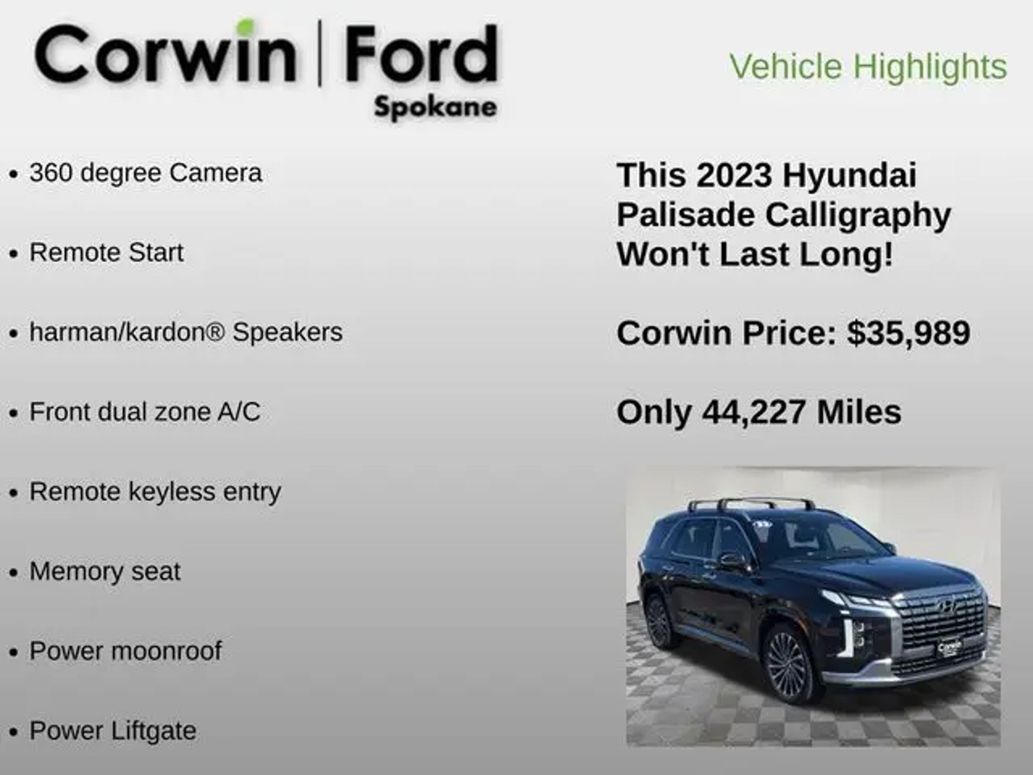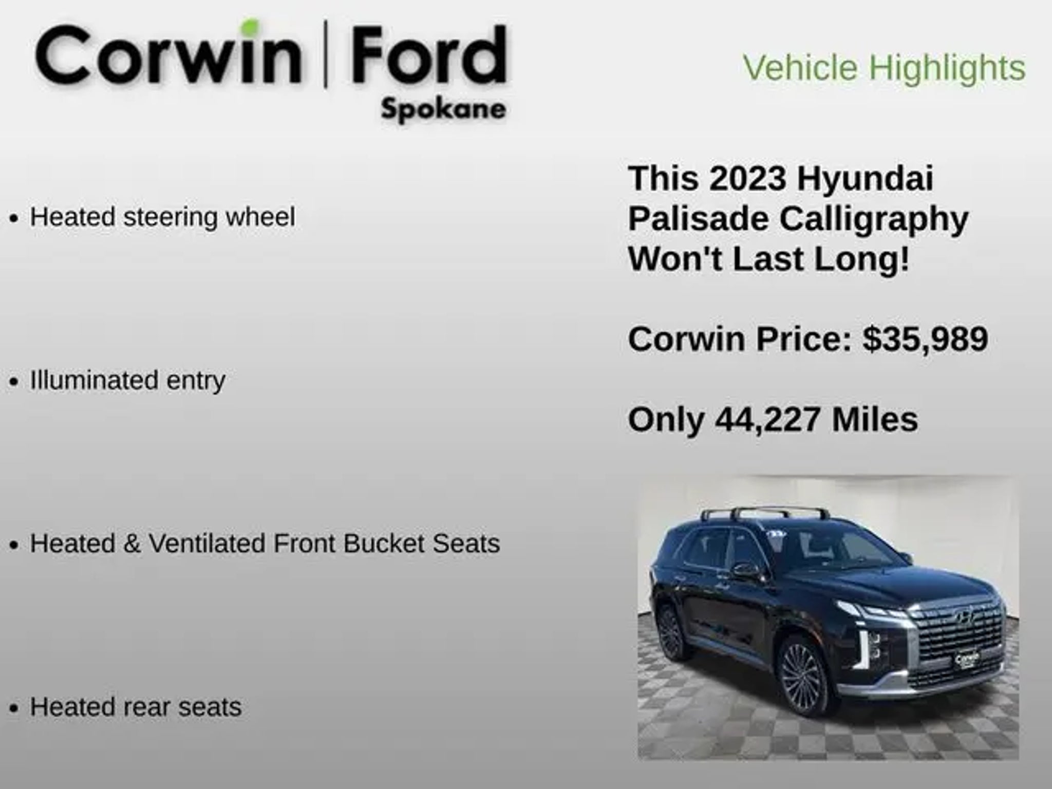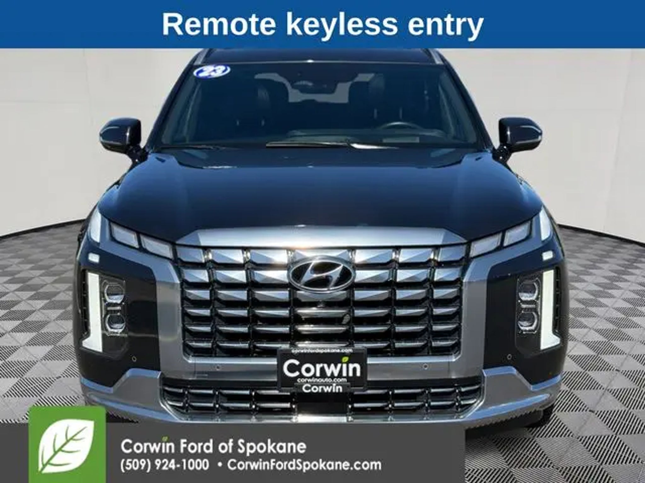 The 2023 Hyundai Palisade Calligraphy is a remarkable SUV that offers unparalleled style, comfort, and capability. With its sleek exterior design, spacious interior, and advanced technology, this vehicle is the perfect choice for the discerning driver. - 360 degree Camera - Remote Start - Harman/Kardon Premium Sound System - Front Dual Zone A/C - Memory Seat - Remote Keyless Entry - Power Hands Free Liftgate - Heated Steering Wheel - Illuminated Entry - Heated & Ventilated Front Bucket Seats - Heated Rear Seats - Power Moonroof The Palisade Calligraphy's impressive V6 engine, paired with an 8-speed automatic transmission and all-wheel drive, delivers exceptional performance and fuel efficiency, with an EPA-estimated 19 city/25 highway MPG. The advanced safety features, including Blind Spot Monitoring, Rear Cross-Traffic Alert, and Forward Collision-Avoidance Assist, provide you and your passengers with the ultimate peace of mind. Step inside the Palisade Calligraphy and you'll be greeted by a luxurious cabin adorned with premium Nappa leather seating, a stunning 12.3-inch touchscreen display, and a host of connectivity features, including Apple CarPlay and Android Auto. The spacious third-row seating and generous cargo capacity make this SUV the perfect companion for your family adventures. Experience the exceptional craftsmanship and attention to detail that sets the 2023 Hyundai Palisade Calligraphy apart. Schedule a test drive today and discover why this remarkable SUV is the perfect choice for your next vehicle. See us today at Corwin Ford Spokane. Family owned for over 100 years! Excellent selection of New and Used vehicles, Financing options. Serving Spokane, Pasco, Kennewick, Richland, Walla Walla, Hermiston, Umatilla, Yakima, Sunnyside, Grandview, Dayton, Prescott, Denton County, Franklin County, Yakima County, Spokane County, Adams County, Grant County, and the Greater Columbia Basin. *All Prices plus applicable sales tax, license, and a negotiable documentary service fee up to $200 may be added to sales price or capitalized cost of the vehicle. One vehicle unless otherwise noted and subject to prior sale without notice. While supplies last. EPA mileage estimates are for newly manufactured vehicles only. Your actual mileage will vary depending on how you drive and maintain your vehicle.