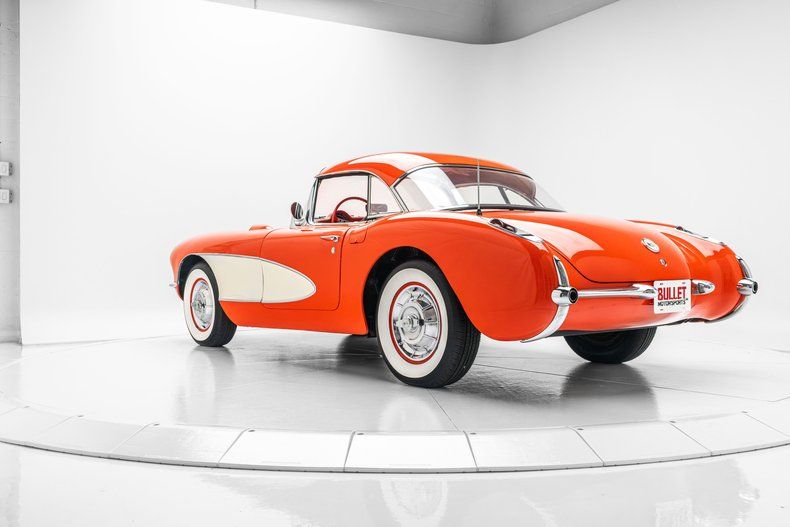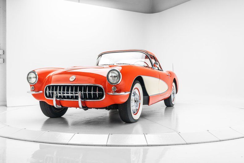 Description: This 1957 Chevrolet Corvette is powered by a 283ci V8 paired with a two-speed Powerglide automatic transmission. The car is refinished in red over red vinyl and equipped with a tan convertible soft top, a Positraction limited-slip differential, bucket seats, an aftermarket stereo, and a twin-cowl dash with a dash-mounted rearview mirror.