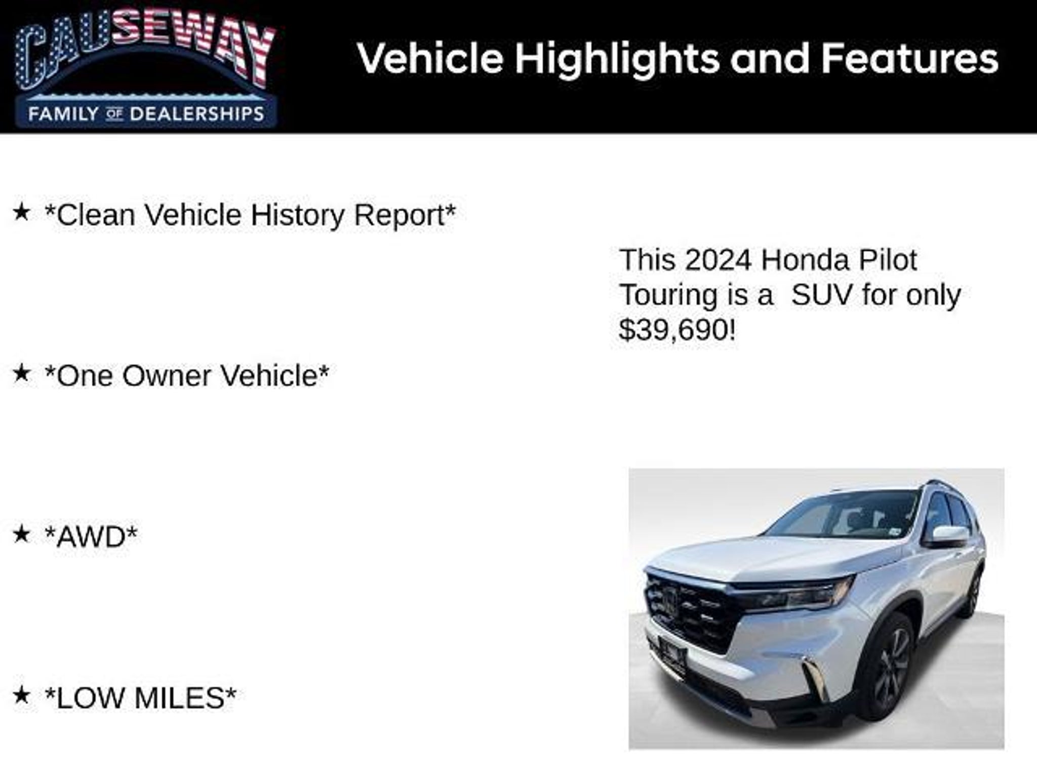 Details > 2024 Honda Pilot AWD Touring 4DR SUV For Sale in Manahawkin, NJ Private Party Sellers Click here to place your ad now! You auta tell them you saw the ad in AutaBuy when you call or email. 1/3 2/3 3/3 View 3 Photos View All Add to My Garage Parked in Your Garage! Causeway Ford Contact Seller: I would like to: Make Offer Check Availability Ask A Question Request More Photos Check Financing Options Send a copy of this message to me Add this listing to my garage Send to Mobile Mileage 51,482 Doors 4 Engine 3.5L V6 Transmission 10 Speed Auto Stock # HRB013061 VIN 5FNYG1H70RB013061 Estimated Monthly Payment $691 mo Apply Now J.J. Best Banc & Co. 2024 Honda Pilot AWD Touring 4DR SUV Description: 2024 Honda Pilot Touring AWD 10-Speed Automatic 3.5L V6 DOHC 24V *Clean Vehicle History Report*, *One Owner Vehicle*, *AWD*, *LOW MILES*, AWD. Recent Arrival! Ask us how you can make money using our Causeway Referral Rewards Program! · Mileage: 51,482 Price: $39,690. Mileage 51,482 Doors 4 Engine 3.5L V6 Transmission 10 Speed Auto Stock # HRB013061 VIN 5FNYG1H70RB013061 Estimated Monthly Payment $691 mo Apply Now J.J. Best Banc & Co. Add to My Garage Parked in Your Garage! Message Seller Causeway Ford Contact Seller: I would like to: Make Offer Check Availability Ask A Question Request More Photos Check Financing Options Send a copy of this message to me Add this listing to my garage Offered for sale by Causeway Ford MANAHAWKIN, NJ Price: $39,690. Offered for sale by Causeway Ford MANAHAWKIN, NJ [entire inventory] Ask Auta Intelligence The first collector-car AI built directly into a classic car marketplace How many passengers can this seat comfortably? What engine options did these come with? Tell me about this model What transmission options did these offer? Where is this located? What does this VIN number tell me? Can you show me more suvs for a similar price? How many of these were produced? What kind of mileage do these get? What safety features does this model offer? How far is this from me? What trim levels were available for this model? What colors did these come in? How easy are parts to find for this model? What factory options were available on this model? When was this model first introduced? Do you have a similar car to sell? List It Now! Questions about this car? Ask Auta Intelligence for production numbers, available options, etc. · Subscribe to AutaBuy! · Send a Gift Subscription Notice to a Friend