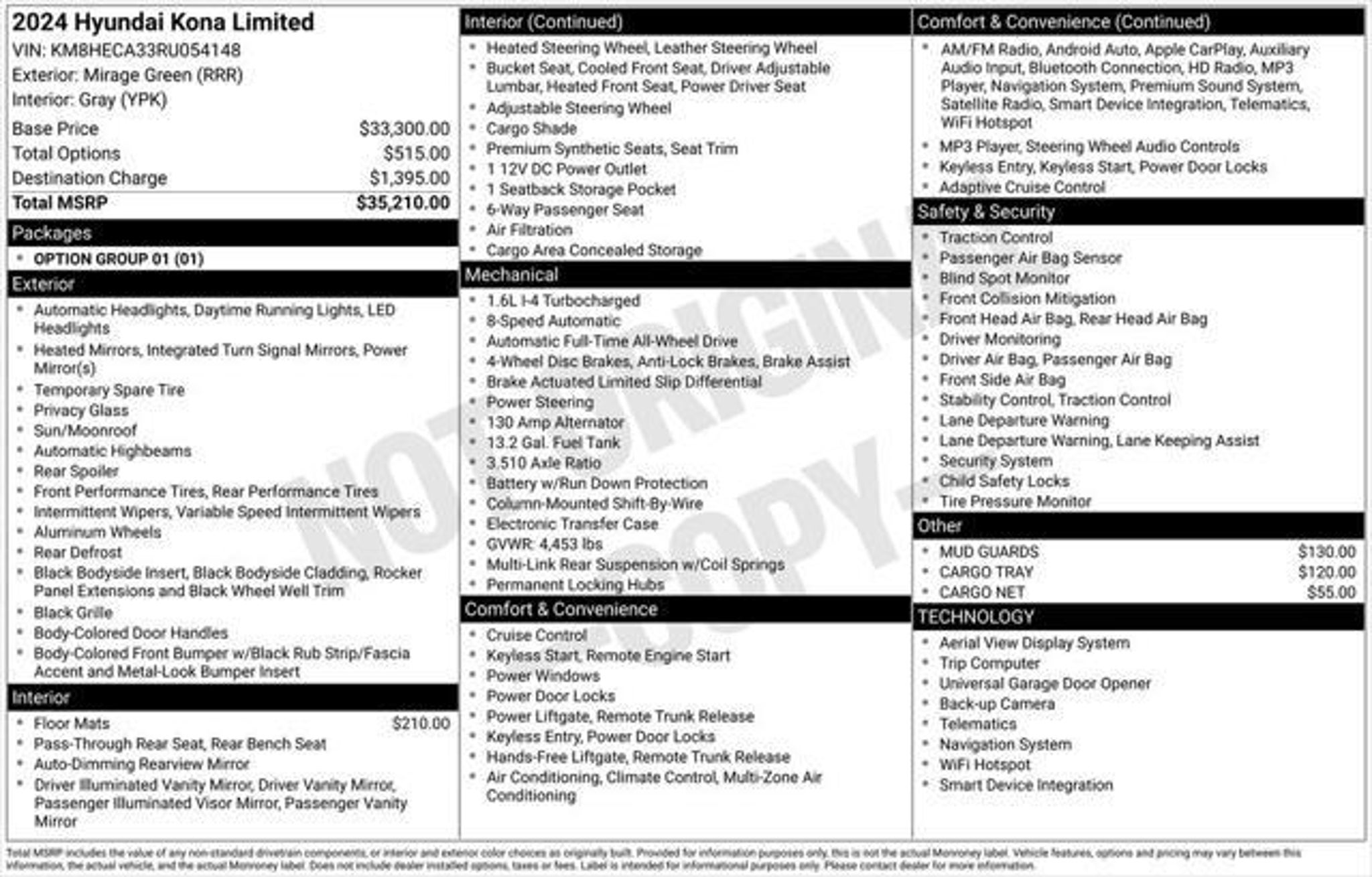 Recent Arrival! Always over 1,000 Pre-Owned in stock! No Payments for 90 days! 30 Year / 300,000 Mile EXCLUSIVE Warranty - HCUV U60!, 10 Year / 100,000 Mile EXCLUSIVE Warranty - HCUV O60!. Clean CARFAX. Certified. Mirage Green 2024 Hyundai Kona Limited AWD 8-Speed Automatic I4 24/29 City/Highway MPG Hyundai Certified Used Vehicles Details: * Vehicle History * Roadside Assistance * Limited Warranty: 60 Month/60,000 Mile (whichever comes first) from original in-service date * Powertrain Limited Warranty: 120 Month/100,000 Mile (whichever comes first) from original in-service date * Warranty Deductible: $50 * 173 Point Inspection * Includes 10-year/Unlimited Mileage Roadside Assistance with Rental Car and Trip Interruption Reimbursement; Please See Dealers for Specific Vehicle Eligibility Requirements. 10-Year/100,000 Mile Hybrid/EV Battery Warranty. 3-Months SiriusXM Trial Subscription. Complimentary 1 Year (Connected Care & Remote Pkgs). Option Group 01, Hyundai Certified Used Vehicles Certified, 3.510 Axle Ratio, 4-Wheel Disc Brakes, 8 Speakers, ABS brakes, Air Conditioning, Alloy wheels, AM/FM radio: SiriusXM, Apple CarPlay & Android Auto, Auto High-beam Headlights, Auto-dimming Rear-View mirror, Automatic temperature control, Brake assist, Bumpers: body-color, Cargo Net, Cargo Tray, Carpeted Floor Mats, Column-Mounted Shift-By-Wire, Delay-off headlights, Driver door bin, Driver vanity mirror, Dual front impact airbags, Dual front side impact airbags, Electronic Stability Control, Emergency communication system: Bluelink, Four wheel independent suspension, Front anti-roll bar, Front Bucket Seats, Front Center Armrest, Front dual zone A/C, Front reading lights, Fully automatic headlights, Garage door transmitter: HomeLink, H-Tex Leatherette Seat Trim, Heated & Ventilated Front Bucket Seats, Heated door mirrors, Heated front seats, Heated steering wheel, Illuminated entry, Leather Shift Knob, Leather steering wheel, Low tire pressure warning, Mud Guards, Navigation System, Occupant sensing airbag, Outside temperature display, Overhead airbag, Panic alarm, Passenger door bin, Passenger vanity mirror, Power door mirrors, Power driver seat, Power Liftgate, Power moonroof, Power steering, Power windows, Radio: AM/FM/HD Radio/SiriusXM Audio System, Rear anti-roll bar, Rear seat center armrest, Rear window defroster, Rear window wiper, Remote keyless entry, Security system, Speed control, Speed-sensing steering, Split folding rear seat, Spoiler, Steering wheel mounted audio controls, Tachometer, Telescoping steering wheel, Tilt steering wheel, Traction control, Trip computer, Turn signal indicator mirrors, Variably intermittent wipers, Ventilated front seats, and Wheels: 19 x 7.5J Glossy Black Alloy.