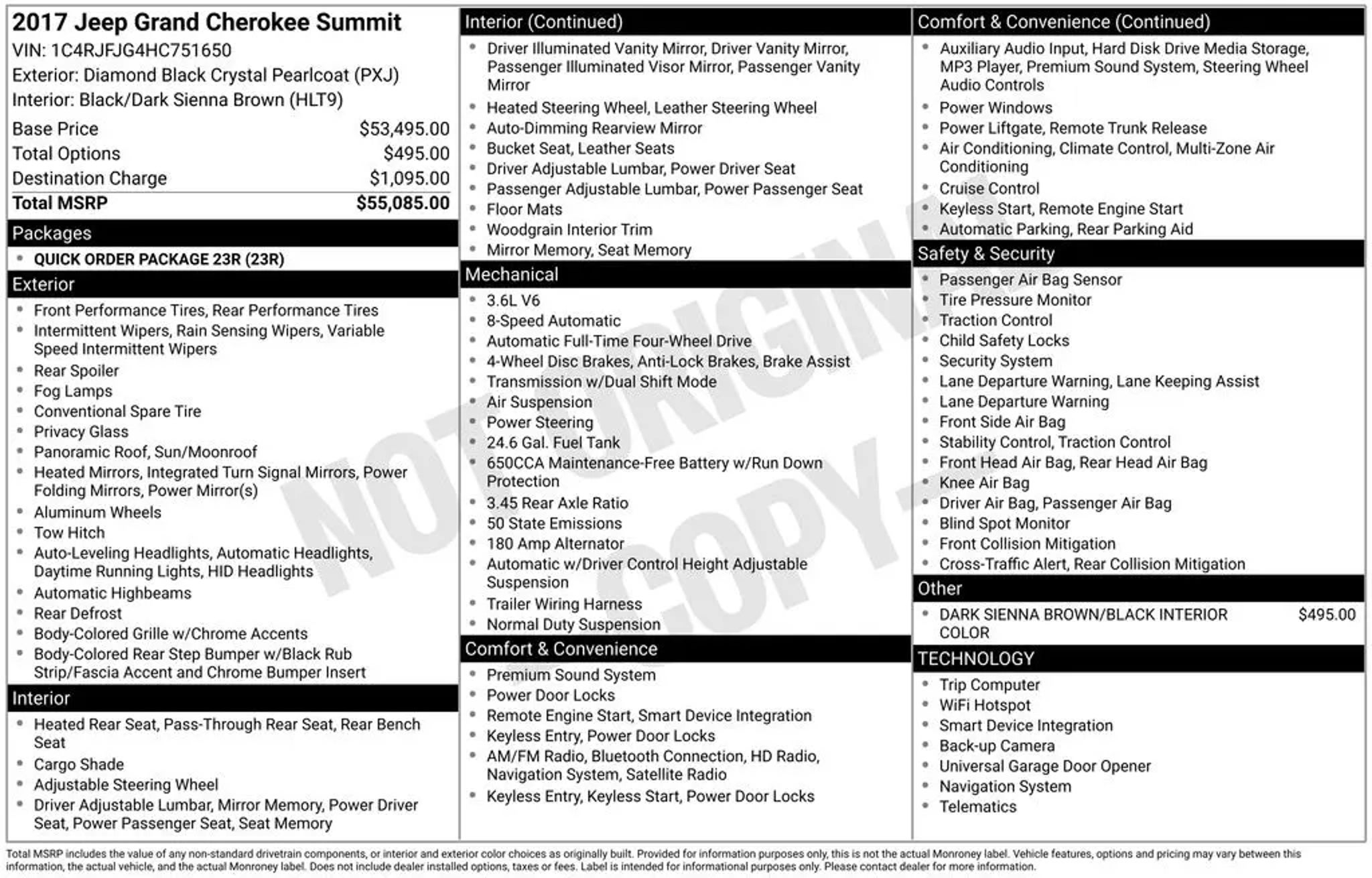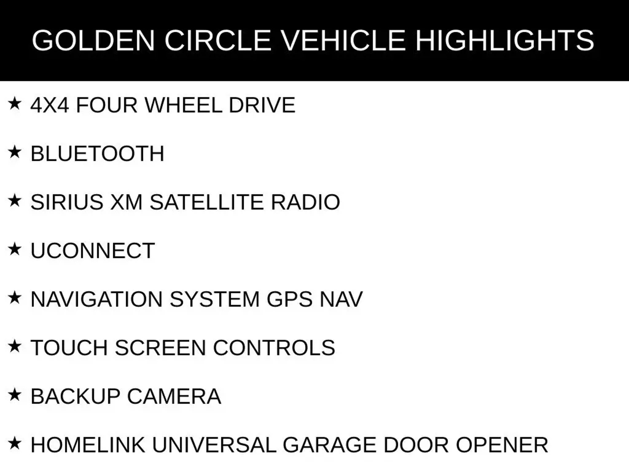 4X4 FOUR WHEEL DRIVE, BLUETOOTH, SIRIUS XM SATELLITE RADIO, UCONNECT, NAVIGATION SYSTEM GPS NAV, TOUCH SCREEN CONTROLS, BACKUP CAMERA, HOMELINK UNIVERSAL GARAGE DOOR OPENER, KEYLESS PUSH BUTTON START, AUTOMATIC HEADLIGHTS, POWER DRIVER SEAT, POWER PASSENGER SEAT, HEATED/COOLED LEATHER SEATS, HEATED REAR LEATHER SEATS, PANORAMIC SUNROOF/MOONROOF, MEMORY PACKAGE / MEMORY SEAT, TOW PACKAGE / TRAILER PACKAGE, HARMAN/KARDON HIGH END SOUND PACKAGE / 19 SPEAKERS, SUMMIT SERIES, QUICK ORDER PACKAGE 23R, 20 FULLY POLISHED ALUMINUM WHEELS, AIR CONDITIONING, ANTI-WHIPLASH FRONT HEAD RESTRAINTS, AUTO-DIMMING DOOR MIRRORS, AUTO-DIMMING REAR-VIEW MIRROR, AUTO-LEVELING SUSPENSION, AUTOMATIC TEMPERATURE CONTROL, BRAKE ASSIST, COMPASS, DRIVER VANITY MIRROR, EMERGENCY COMMUNICATION SYSTEM: UCONNECT ACCESS, ENGINE OIL COOLER, FRONT DUAL ZONE A/C, FRONT FOG LIGHTS, HEADLIGHT CLEANING, HEATED DOOR MIRRORS, LEATHER SHIFT KNOB, LEATHER STEERING WHEEL, LOW TIRE PRESSURE WARNING, NORMAL DUTY SUSPENSION, OCCUPANT SENSING AIRBAG, OUTSIDE TEMPERATURE DISPLAY, OVERHEAD CONSOLE, PANIC ALARM, PASSENGER VANITY MIRROR, POWER DOOR MIRRORS, POWER STEERING, POWER WINDOWS, RADIO DATA SYSTEM, RAIN SENSING WIPERS, REAR WINDOW DEFROSTER, REAR WINDOW WIPER, REMOTE KEYLESS ENTRY, SPEED-SENSITIVE WIPERS, TELESCOPING STEERING WHEEL, TILT STEERING WHEEL, TURN SIGNAL INDICATOR MIRRORS, VARIABLY INTERMITTENT WIPERS.