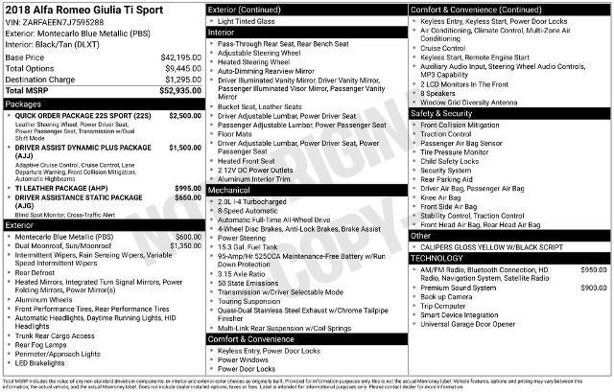 At Mullinax there are NO DEALER FEES! That SAVES you $900 over our largest competitors every day. This stunning 2018 Alfa Romeo Giulia Ti Sport is a true driver's delight, blending exhilarating performance with refined Italian style. Outfitted with a powerful I4 engine and an advanced 8-speed automatic transmission, this all-wheel-drive sedan delivers an exceptional driving experience that will leave you eagerly anticipating every curve in the road. - QUICK ORDER PACKAGE 22S SPORT - TI LEATHER PACKAGE - DRIVER ASSISTANCE STATIC PACKAGE - DRIVER ASSIST DYNAMIC PLUS PACKAGE - DUAL-PANE SUNROOF The Giulia Ti Sport's striking exterior is accentuated by its Montecarlo Blue Metallic paint, while the sleek Gloss Black accents and 18-inch aluminum wheels lend an air of sophistication. Step inside and you'll be greeted by a premium Harman/Kardon audio system, advanced navigation, and a host of driver-centric technologies that will enhance your daily commute. Comfort and convenience are also priorities in this Giulia, with features like dual-zone climate control, power-adjustable front seats, and a heated steering wheel ensuring a relaxing and enjoyable ride. The spacious interior and generous cargo capacity make this Alfa Romeo an ideal companion for both daily errands and weekend adventures. THIS VEHICLE COMES WITH WARRANTY! Mullinax Silver vehicles get the reassurance of a 45-point vehicle inspection, 60-day unlimited mileage 50/50 warranty, and a complete CARFAX vehicle history report! This vehicle also comes with a 5 DAY/300-MILE EXCHANGE POLICY. JUST ADD TAX! At Mullinax, there are NO DEALER FEES! We save you over $900 vs. Our largest competitors every day! Over 3,500 vehicles to choose from!