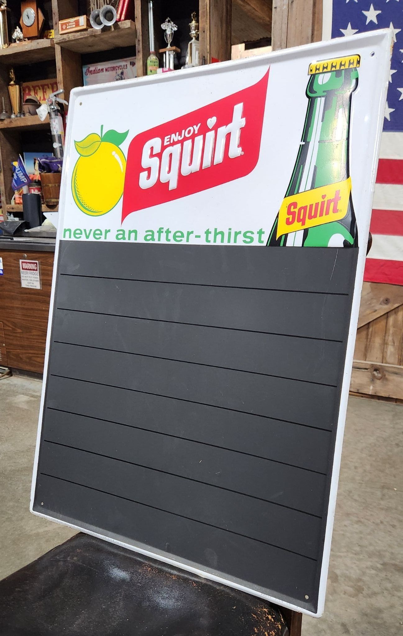 Squirt Beverage Tin Sign. 28"H X 20"W. This Factory Squirt tin advertising sign has chalkboard surface for advertising messages.