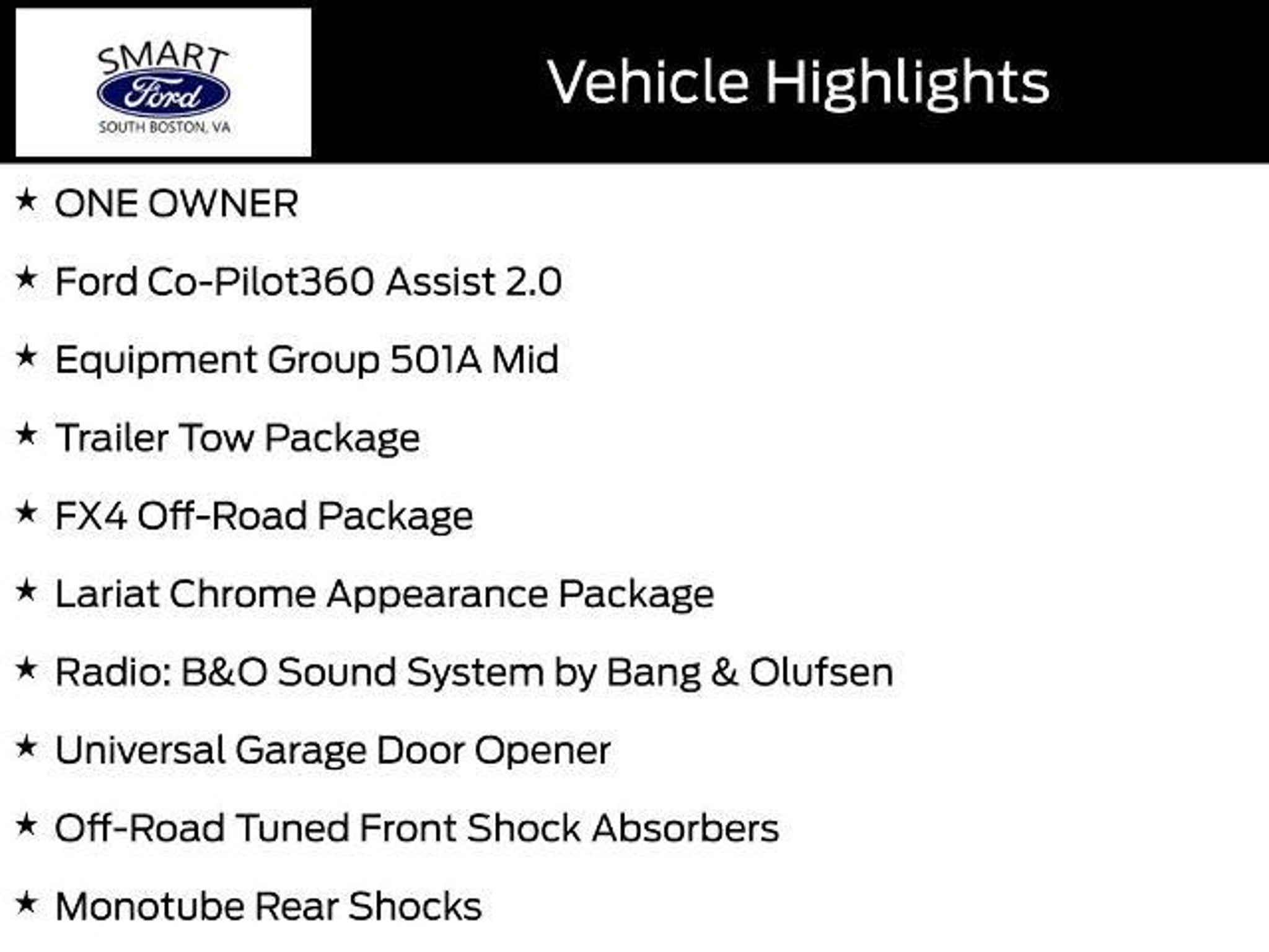 Introducing the 2021 Ford F-150 Lariat, a true workhorse with uncompromising capability and refined style. This exceptional vehicle is more than just a pickup - it's a testament to Ford's engineering prowess and a reflection of your active, adventurous lifestyle. - ONE OWNER - FORD CO-PILOT360 ASSIST 2.0 with Evasive Steering Assist, Intelligent Adaptive Cruise Control, and more - PRO POWER ONBOARD - 7.2KW - EQUIPMENT GROUP 501A MID with B&O Sound System, Universal Garage Door Opener, and Onboard 400W Outlet - INTERIOR WORK SURFACE - TRAILER TOW PACKAGE with Towing Capability, Integrated Trailer Brake Controller, and Pro Trailer Backup Assist - FX4 OFF-ROAD PACKAGE with Off-Road Tuned Shock Absorbers, Skid Plates, Rock Crawl Mode, and Hill Descent Control - POWER TAILGATE with Tailgate Step and Tailgate Work Surface - LARIAT CHROME APPEARANCE PACKAGE with Chrome Accents and 18 Chrome-Like PVD Wheels Powered by the impressive 3.5L PowerBoost Full-Hybrid V6 engine, this F-150 Lariat delivers remarkable efficiency without compromising on performance. The 10-speed automatic transmission and 4WD system ensure seamless power delivery and confident handling, whether you're hauling a heavy load or tackling off-road adventures. The interior of the F-150 Lariat is a true sanctuary, with premium leather-trimmed bucket seats that are both heated and ventilated for maximum comfort. The SYNC 4 infotainment system with Connected Navigation and the stunning B&O sound system provide cutting-edge technology and entertainment at your fingertips. Versatility is the hallmark of this exceptional truck. The Pro Power Onboard feature transforms the F-150 Lariat into a mobile power station, allowing you to run tools, appliances, and more right from the bed. The Interior Work Surface and Tailgate Work Surface further enhance the vehicle's utility, making it the ultimate companion for your work and play. Safety is also a top priority in the F-150 Lariat. The Ford Co-Pilot360 Assist 2.0 suite of advanced driver-assistance technologies, including Evasive Steering Assist and Intelligent Adaptive Cruise Control, help keep you and your passengers secure on the road. Experience the unparalleled capability, technology, and style of the 2021 Ford F-150 Lariat. This truck is a true reflection of your active lifestyle, and it's waiting for you at our dealership. Schedule a test drive today and discover the power and versatility that can only be found in a Ford.
