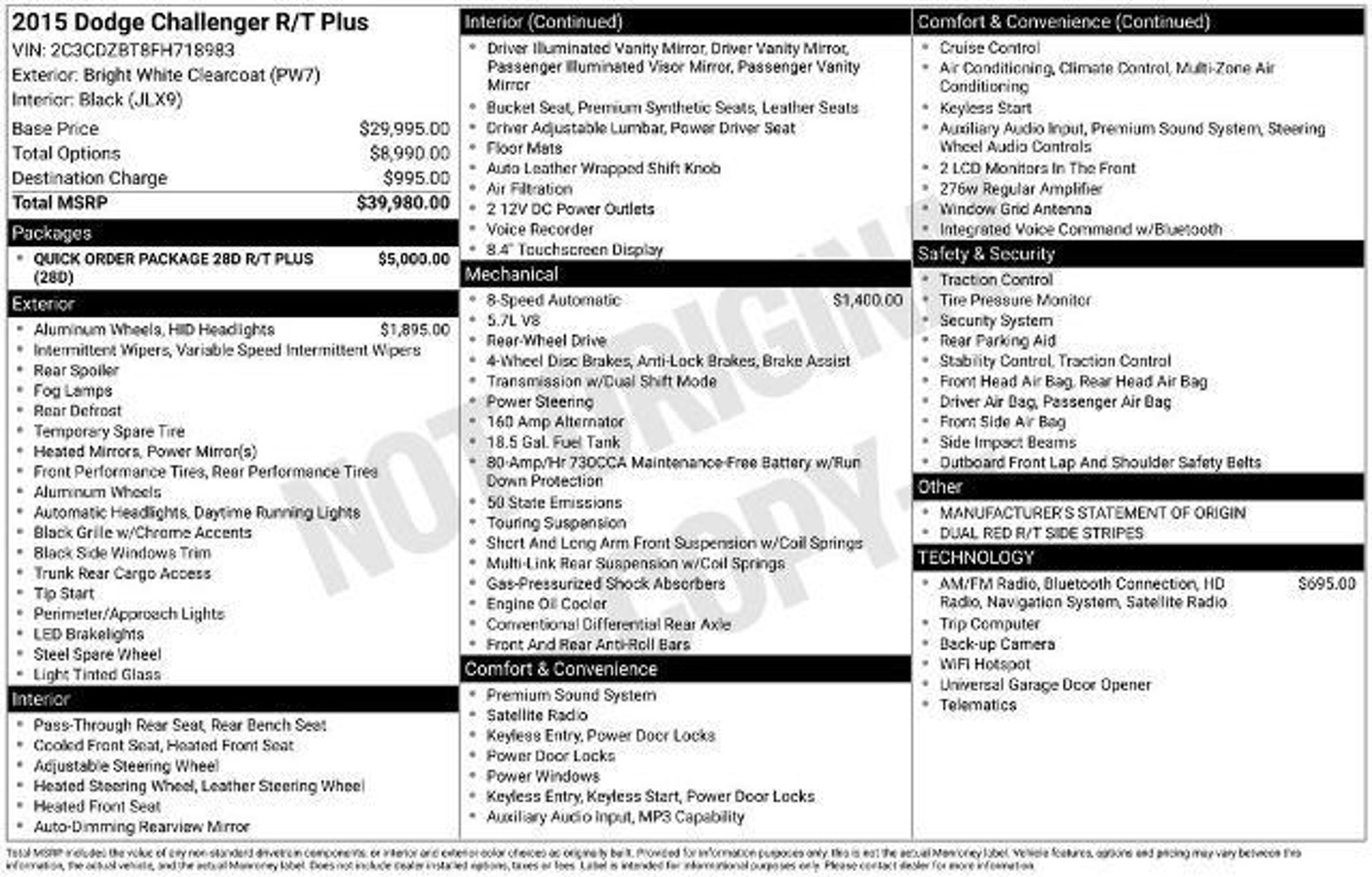 Elevate your driving experience with this stunning 2015 Dodge Challenger R/T. This powerful sports car boasts a commanding presence on the road, combining classic muscle car styling with modern performance and technology. - QUICK ORDER PACKAGE 28D R/T PLUS - R/T CLASSIC - 8-Speed Automatic Transmission - RADIO: UCONNECT 8.4 NAV with GPS Navigation, SiriusXM Traffic and Travel Link Under the hood, the HEMI 5.7L V8 engine delivers an exhilarating 372 horsepower, mated to an 8-speed automatic transmission that provides smooth, responsive power delivery. With a 0-60 mph time of just 5.1 seconds and a top speed of 155 mph, this Challenger R/T offers an unparalleled driving experience. The bold, muscular exterior of this Challenger is enhanced by the classic R/T styling cues, including the Challenger script fender badge, dual black R/T side stripes, and 20-inch polished aluminum wheels. The sleek, aerodynamic design not only looks stunning, but also contributes to the Challenger's impressive fuel efficiency, with an EPA-estimated 25 mpg on the highway. Step inside the well-appointed cabin and you'll be surrounded by premium features that elevate the driving experience. The Nappa leather-trimmed sport seats with heating and ventilation provide exceptional comfort, while the Uconnect 8.4-inch touchscreen infotainment system with built-in navigation and SiriusXM radio keeps you connected and entertained. Safety is also a top priority, with features like electronic stability control, traction control, and a suite of airbags to help protect you and your passengers. The Challenger's impressive performance and handling capabilities are complemented by its advanced safety technologies, giving you the confidence to tackle any road with ease. This 2015 Dodge Challenger R/T is a true driver's car, blending classic American muscle with modern refinement and technology. Experience the thrill of the open road in this exceptional sports car. Contact us today to schedule a test drive and discover the power and performance that the Challenger R/T has to offer.