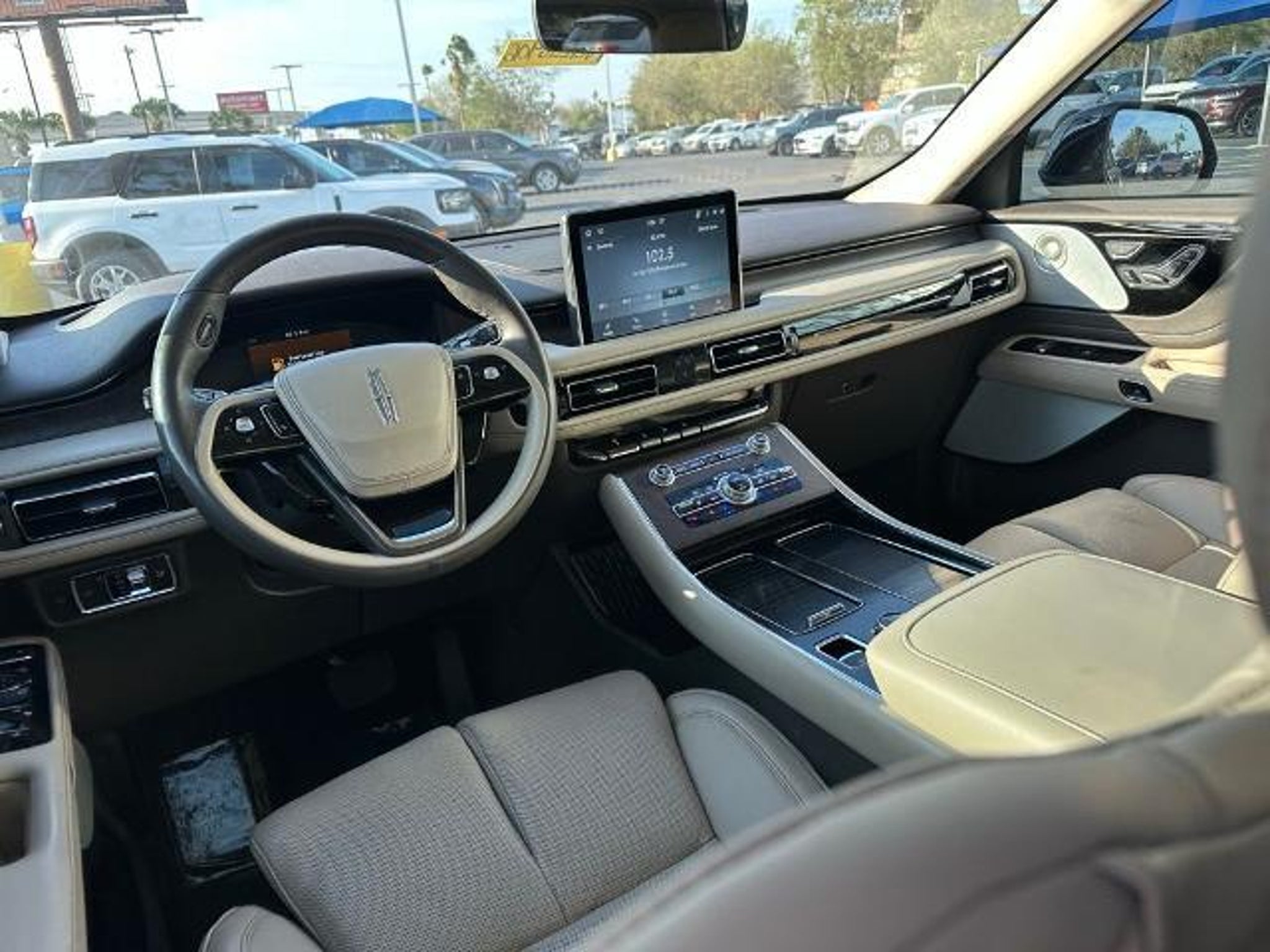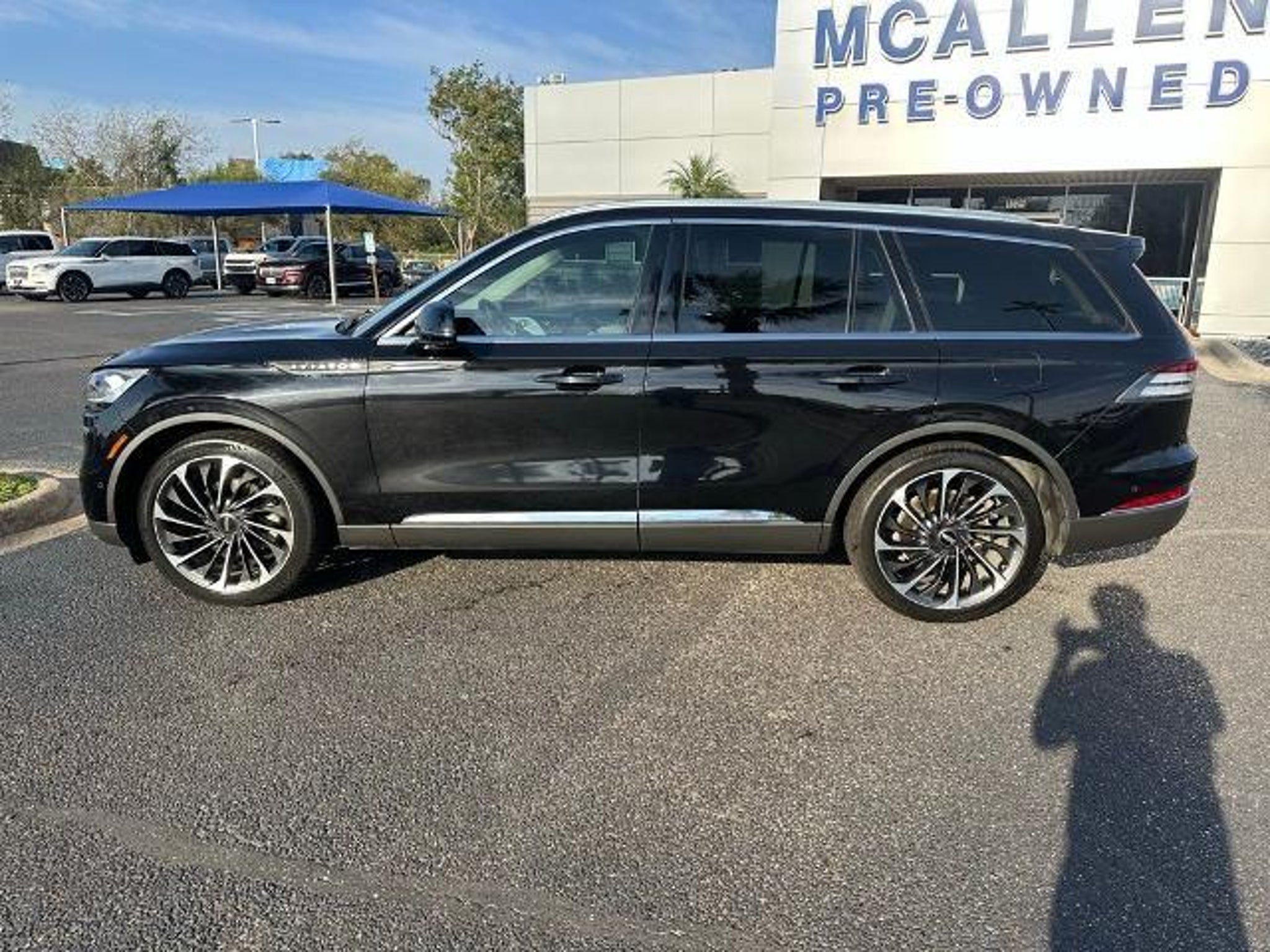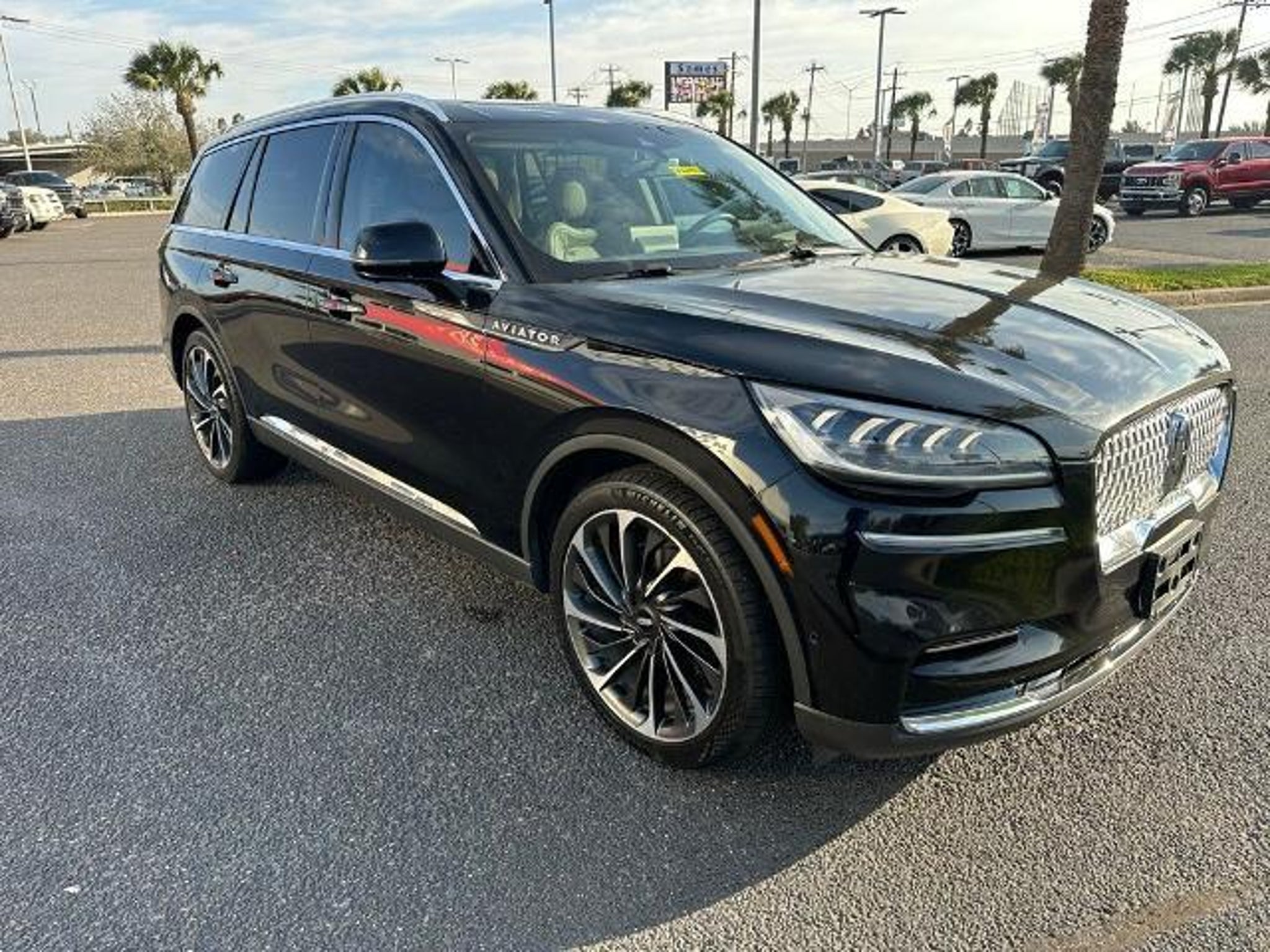 This 2022 Lincoln Aviator Reserve in Black Metallic comes with the following features: 3.0L V6 10-Speed Automatic RWD Elements Package Plus (Auto Air Refresh, Auto Heated/Ventilated Driver & Passenger Seats, Heated Steering Wheel, Heated VisioBlade Wipers, and Heated/Ventilated 2nd Row Outboard Seats), Equipment Group 201A (Head-Up Display and Phone As A Key), Lincoln Co-Pilot360 1.5 Plus (Active Park Assist 2.0, Evasive Steering Assist, Intelligent Adaptive Cruise Control, and Reverse Brake Assist), Luxury Package (30-Way Perfect Position Seats w/Active Motion, Radio: Revel Ultima 3D Audio System w/28 Speakers, and Rear Door Sunshades), 14 Speakers, 2nd Row Bench Seat, 3.58 Axle Ratio, 3rd row seats: split-bench, 4-Wheel Disc Brakes, ABS brakes, Air Conditioning, Alloy wheels, AM/FM radio: SiriusXM, Audio memory, Auto High-beam Headlights, Auto-dimming door mirrors, Auto-dimming Rear-View mirror, Automatic temperature control, Brake assist, Bumpers: body-color, Cargo Area Cover, Compass, Delay-off headlights, Driver door bin, Driver vanity mirror, Dual front impact airbags, Dual front side impact airbags, Electronic Stability Control, Emergency communication system, Four wheel independent suspension, Front anti-roll bar, Front Bucket Seats, Front Center Armrest, Front dual zone A/C, Front fog lights, Front License Plate Bracket, Front reading lights, Fully automatic headlights, Garage door transmitter, Heated door mirrors, Heated front seats, HVAC memory, Illuminated entry, Knee airbag, Leather steering wheel, Low tire pressure warning, Memory seat, Navigation System, Occupant sensing airbag, Outside temperature display, Overhead airbag, Overhead console, Panic alarm, Passenger door bin, Passenger vanity mirror, Power door mirrors, Power driver seat, Power Liftgate, Power moonroof: Panoramic Vista Roof, Power passenger seat, Power steering, Power windows, Premium Lthr Heated/Ventilated Fnt Captain's Chairs, Radio data system, Radio: Revel AM/FM Audio System w/14 Speakers, Rain sensing wipers, Rear air conditioning, Rear anti-roll bar, Rear audio controls, Rear dual zone A/C, Rear reading lights, Rear window defroster, Rear window wiper, Remote keyless entry, Security system, SiriusXM Radio, Speed control, Speed-Sensitive Wipers, Split folding rear seat, Spoiler, Steering wheel memory, Steering wheel mounted A/C controls, Steering wheel mounted audio controls, SYNC 3 Communication & Entertainment System, Tachometer, Telescoping steering wheel, Tilt steering wheel, Traction control, Trip computer, Turn sig