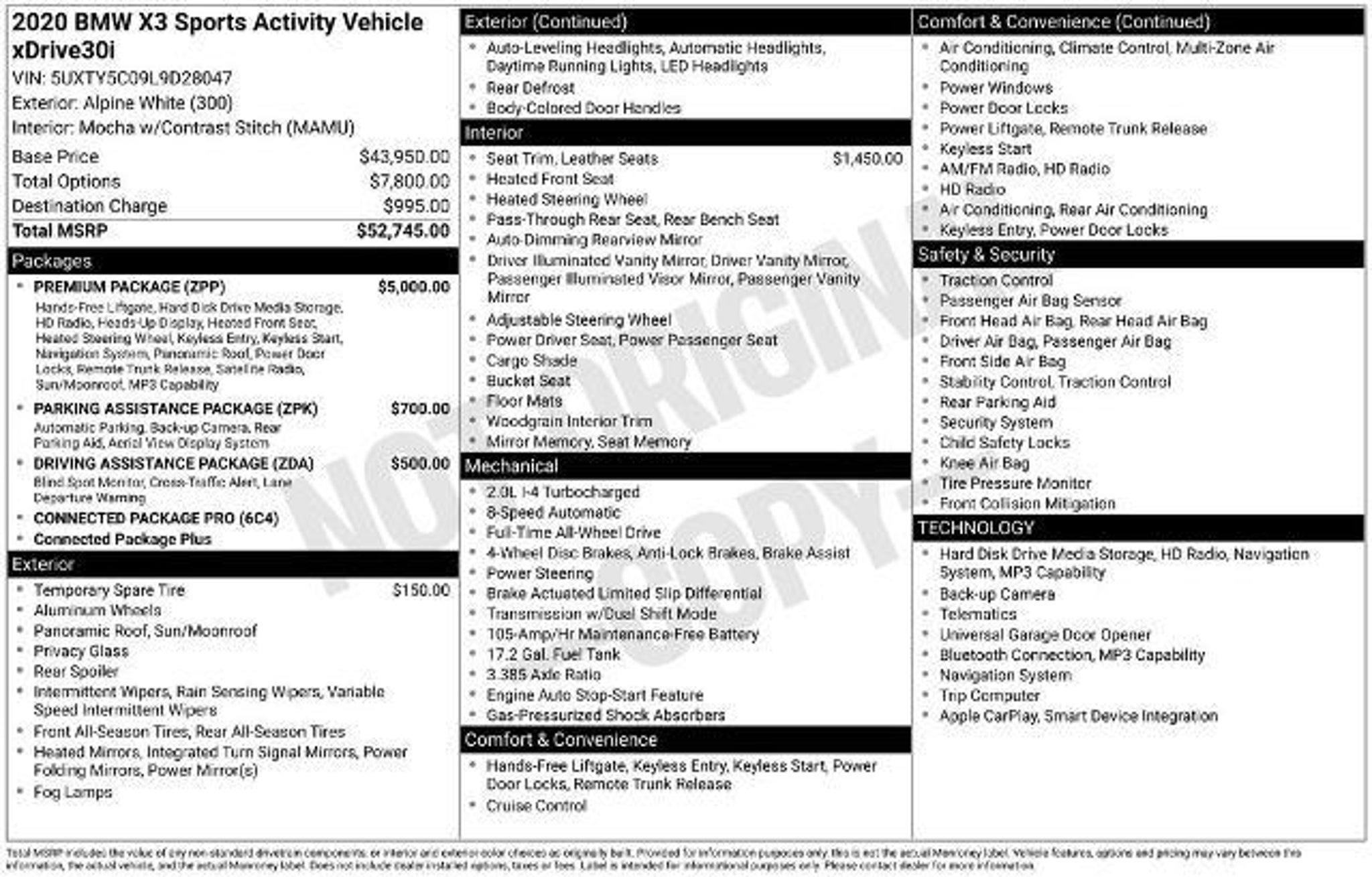 Elevate your driving experience with this exceptional 2020 BMW X3 xDrive30i. Boasting a sleek white exterior and a well-appointed interior, this versatile SUV is ready to take you on the journey of a lifetime. - Space-saver spare - Mocha with contrast stitch, Vernasca leather upholstery - Driving Assistance Package (Lane Departure Warning, Active Blind Spot Detection, Active Driving Assistant, Rear Cross-Traffic Alert, Speed Limit Info) - Parking Assistance Package (Active Park Distance Control, Surround View with 3D View, Rear View Camera, Parking Assistant Plus) - Premium Package (Comfort Access Keyless Entry, Live Cockpit Pro with Navigation, Head-Up Display, Heated Steering Wheel, Panoramic Moonroof, SiriusXM Satellite Radio) Powered by a robust 2.0L I4 TwinPower Turbo engine and equipped with an 8-speed automatic transmission, this BMW X3 delivers an impressive balance of power and efficiency, with an EPA-estimated 24 mpg in the city and 29 mpg on the highway. Experience the thrill of BMW's renowned driving dynamics, enhanced by the xDrive all-wheel-drive system, which seamlessly distributes power for optimal traction and control. The BMW X3 is more than just a luxury SUV ? it's a true driver's vehicle, designed to elevate your daily commute and weekend adventures alike. Indulge in the convenience of the Comfort Access Keyless Entry, allowing you to effortlessly access your vehicle. The Live Cockpit Pro with Navigation keeps you connected and informed, while the Head-Up Display projects vital information directly into your line of sight, helping you stay focused on the road. Elevate your comfort with the Heated Steering Wheel and Heated Front Seats, ensuring a cozy and relaxing ride no matter the weather. The Panoramic Moonroof floods the cabin with natural light, creating an open and airy atmosphere. Staying connected has never been easier, thanks to the SiriusXM Satellite Radio and the Connected Package Pro, which provides a wealth of features to keep you entertained and informed on the go. This 2020 BMW X3 xDrive30i is a true testament to the brand's commitment to excellence. With its impressive performance, advanced technology, and luxurious amenities, it's the perfect companion for the discerning driver. Experience the difference for yourself ? schedule a test drive today and discover the joy of owning this exceptional vehicle.