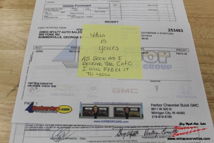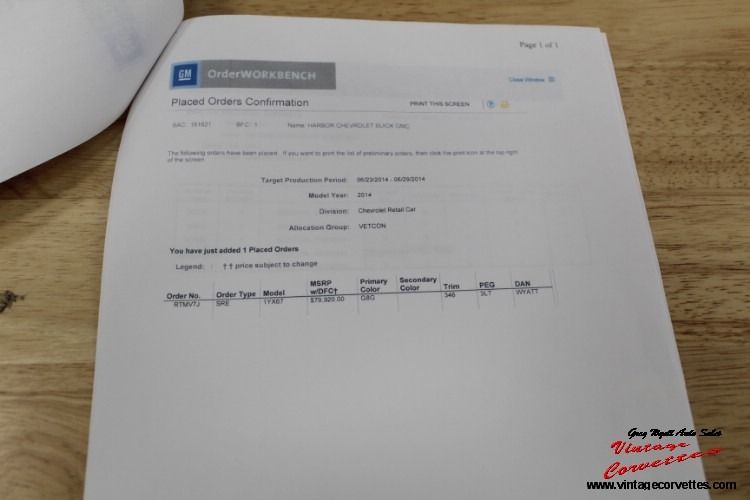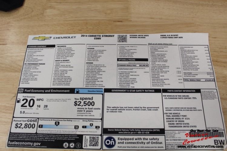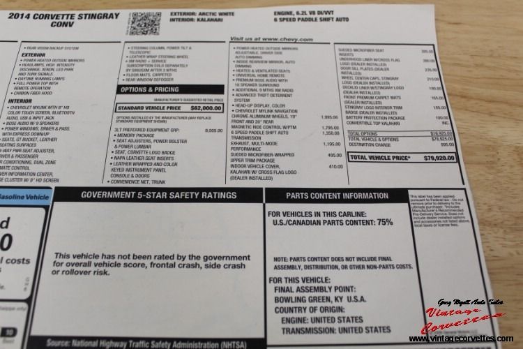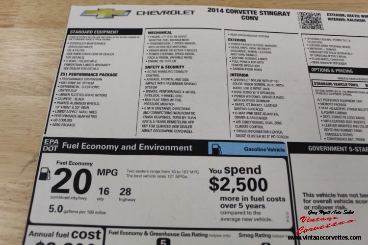2014 Chevrolet Corvette Stingray Convertible. Arctic White, Kalahari Interior and Top, 6.2L V8, 6 Speed Paddle Shift Automatic, Z-51 Package, 3-LT Including all Factory options ordered on this One Owner car. All Factory/Dealer paperwork, Factory Car Cover, One Owner Car with only 8,100 Original Miles. Never in the Rain, Car looks as New, New 2014 Corvette. www.vntagecorvettes.com or call 706-857-3916 or 706-506-5745