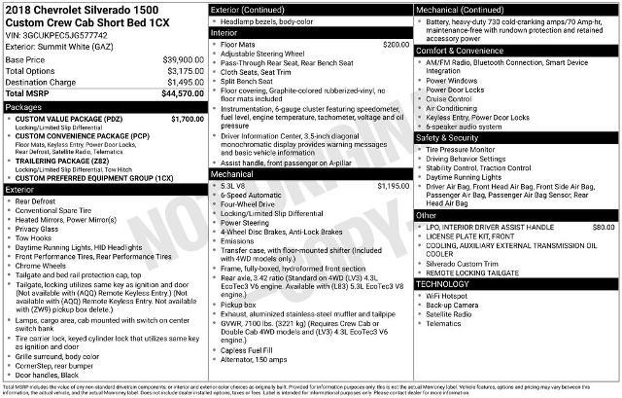 Discover the perfect blend of power, capability, and style with this 2018 Chevrolet Silverado 1500 Custom. This rugged and versatile pickup is ready to take on any task, whether you're hauling heavy loads, towing your weekend toys, or simply enjoying the open road. - Interior Driver Assist Handle (LPO) - 5.3L V8 EcoTec3 engine with Active Fuel Management and Variable Valve Timing - Custom Convenience Package - Trailering Package - Locking Rear Differential Boasting a powerful 5.3L V8 EcoTec3 engine, this Silverado 1500 Custom delivers exceptional performance, with more than 300 lb-ft of torque available from 2,000 to 5,600 rpm. The 6-speed automatic transmission with overdrive ensures smooth, efficient power delivery, while the available 4-wheel drive system provides the traction and control you need to tackle any terrain. Beyond its impressive capabilities, this Silverado 1500 Custom also offers a wealth of premium features and conveniences. The Custom Convenience Package includes an interior driver assist handle, while the Trailering Package equips the vehicle with the necessary components for effortless towing. The locking rear differential provides enhanced traction and stability, making this truck a true workhorse. Complementing its rugged persona, the Silverado 1500 Custom also boasts a stylish exterior, with a body-color grille surround, headlamp bezels, and rear bumper. The 20-inch chrome-clad aluminum wheels add a touch of sophistication, while the deep-tinted glass and all-weather floor liner provide both form and function. Inside, the Silverado 1500 Custom offers a comfortable and well-appointed cabin, with features like Chevrolet MyLink, SiriusXM Satellite Radio, and Bluetooth connectivity. The 40/20/40 front split bench seat and 60/40 folding rear bench provide ample seating and storage flexibility, ensuring that you and your passengers can ride in comfort. Whether you're tackling tough jobs or seeking a capable and stylish daily driver, this 2018 Chevrolet Silverado 1500 Custom is the perfect choice. Experience the power, versatility, and refined features that make this truck a standout in its class. Visit our showroom today to take this impressive Silverado for a test drive and discover the difference for yourself. The listed online price reflects a $1,000 finance incentive and a $1,000 qualifying retail trade-in incentive; absence of either or both incentives will result in an increase of up to $2,000 to the final sale price.
