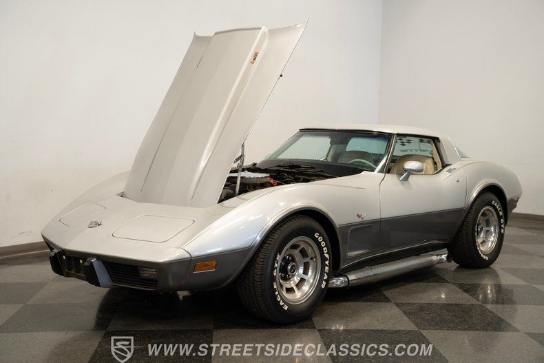 Details > 1978 Chevrolet Corvette 25TH Anniversary For Sale in Mesa, AZ Private Party Sellers Click here to place your ad now! You auta tell them you saw the ad in AutaBuy when you call or email. 1/75 2/75 3/75 4/75 5/75 6/75 7/75 8/75 9/75 10/75 11/75 12/75 13/75 14/75 15/75 16/75 17/75 18/75 19/75 20/75 21/75 22/75 23/75 24/75 25/75 26/75 27/75 28/75 29/75 30/75 31/75 32/75 33/75 34/75 35/75 36/75 37/75 38/75 39/75 40/75 41/75 42/75 43/75 44/75 45/75 46/75 47/75 48/75 49/75 50/75 51/75 52/75 53/75 54/75 55/75 56/75 57/75 58/75 59/75 60/75 61/75 62/75 63/75 64/75 65/75 66/75 67/75 68/75 69/75 70/75 71/75 72/75 73/75 74/75 75/75 View 75 Photos View All Add to My Garage Parked in Your Garage! Streetside Classic Cars Phoenix Call: 480-926-1344 Contact Seller: I would like to: Make Offer Check Availability Ask A Question Request More Photos Check Financing Options Send a copy of this message to me Add this listing to my garage Send to Mobile Exterior Color Silver Stock # 4990-PHX Ad ID 109028116 Estimated Monthly Payment $470 mo Apply Now J.J. Best Banc & Co. 1978 Chevrolet Corvette 25TH Anniversary Description: New Arrival! Details coming soon! Call 480-926-1344 for more information. Be sure to ask about our services offered; Financing, Vehicle Protection Plan, Insurance, and Transportation to your driveway! · Color: Silver Price: $26,995. Exterior Color Silver Stock # 4990-PHX Ad ID 109028116 Estimated Monthly Payment $470 mo Apply Now J.J. Best Banc & Co. Add to My Garage Parked in Your Garage! Call Seller Message Seller Streetside Classic Cars Phoenix Call: 480-926-1344 Contact Seller: I would like to: Make Offer Check Availability Ask A Question Request More Photos Check Financing Options Send a copy of this message to me Add this listing to my garage Offered for sale by Streetside Classic Cars Phoenix Call 480-926-1344 MESA, AZ Mention AutaBuy.ca when you call. Price: $26,995. Offered for sale by Streetside Classic Cars Phoenix Call 480-926-1344 MESA, AZ Mention AutaBuy.ca when you call. [entire inventory] Ask Auta Intelligence The first collector-car AI built directly into a classic car marketplace How many of these were produced? How many Corvette 25TH Anniversarys were produced in Silver? Which years was this body style produced? When was this model first introduced? What's the typical 0-60 time for this configuration? Tell me more about this model What's the typical 1/4 mile time for this setup? What colors did these come in? How far is this from me? What engine options did these come with? Where is this located? What nicknames does this model have? Can you show me more muscle cars for a similar price? What transmission options did these offer? What movies featured cars like this? What makes this model year special? What factory options were available on this model? What makes this model desirable to enthusiasts? Which engines were most common for this year? What trim levels were available for this model? What makes this model desirable to enthusiasts? How much horsepower does this have? Do you have a similar car to sell? List It Now! Questions about this car? Ask Auta Intelligence for production numbers, available options, etc. · Subscribe to AutaBuy! · Send a Gift Subscription Notice to a Friend