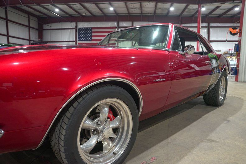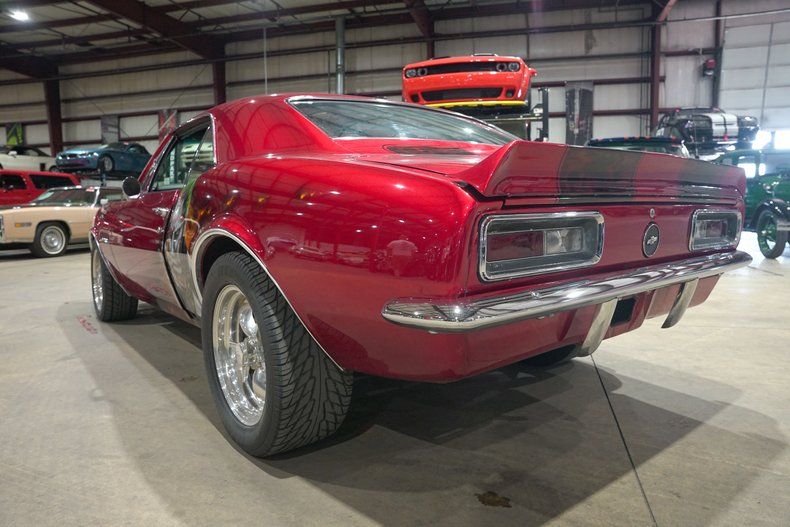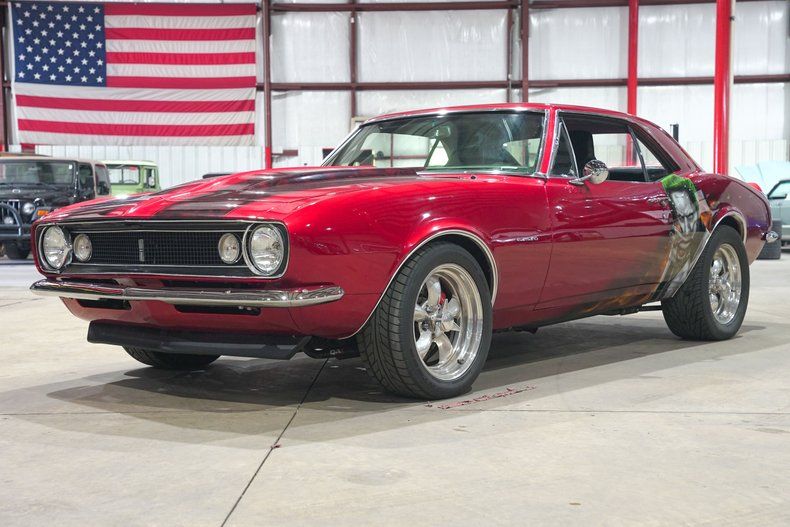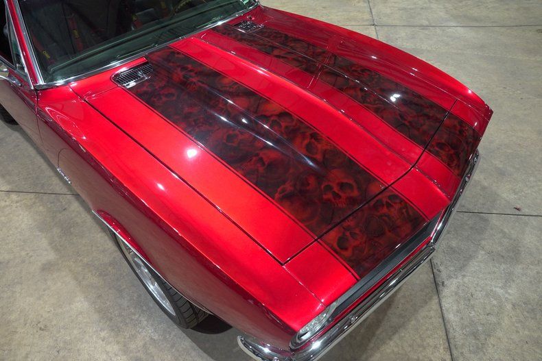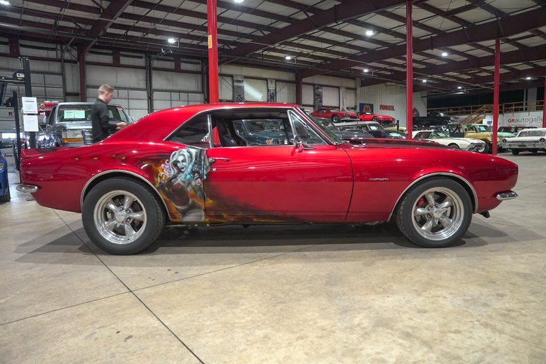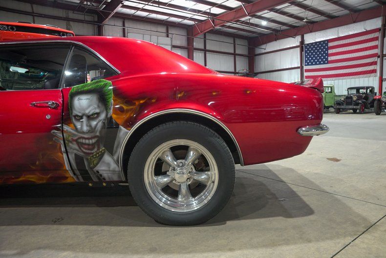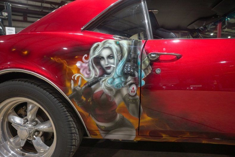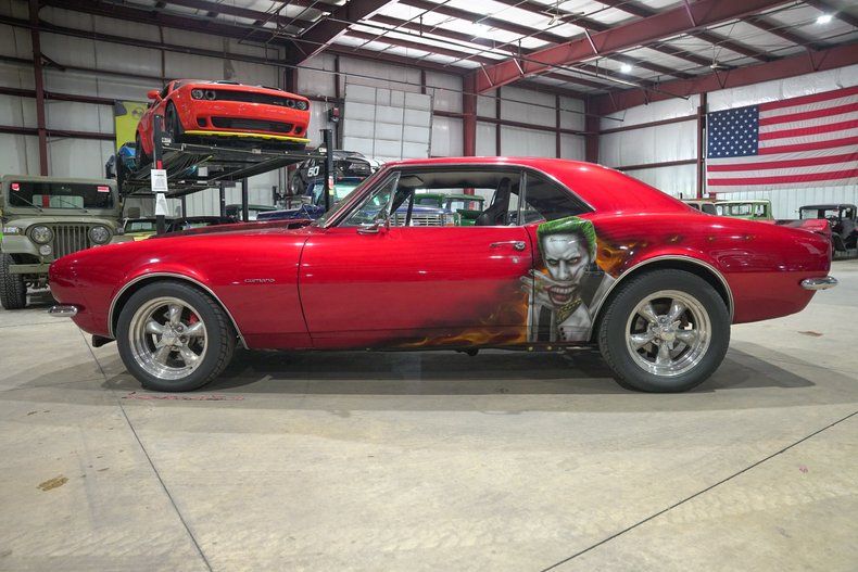 GR Auto Gallery is excited to present this 1967 Chevrolet Camaro finished in a one of a kind Candy Red paint scheme with bold red skull stripes and custom airbrushed artwork featuring the Joker on the driver side and Harley Quinn on the passenger side. This is not your typical first gen Camaro. The paint alone makes a statement, but when combined with the aggressive stance and full restoration, it becomes a true rolling piece of art. Stripped down to bare metal and rebuilt with intention, this Camaro stands out in any crowd.