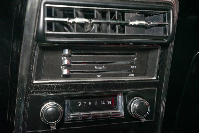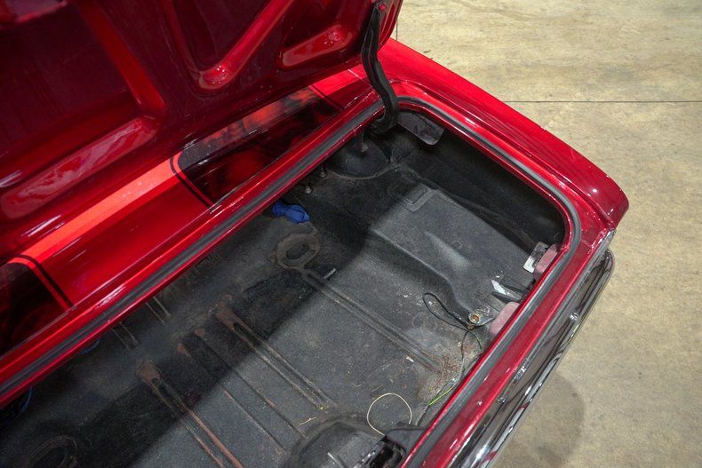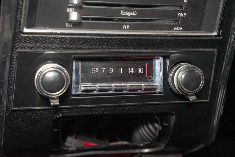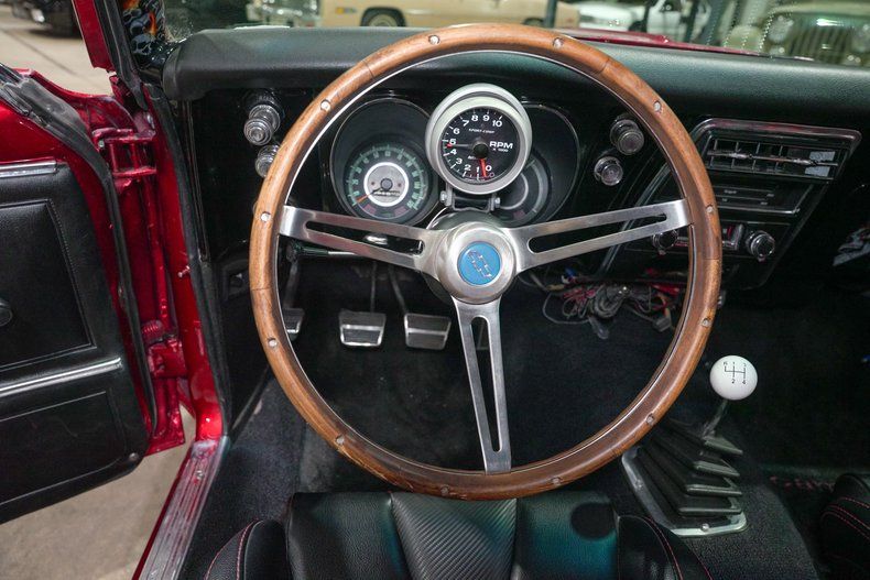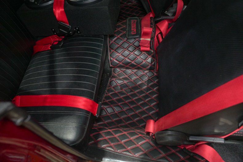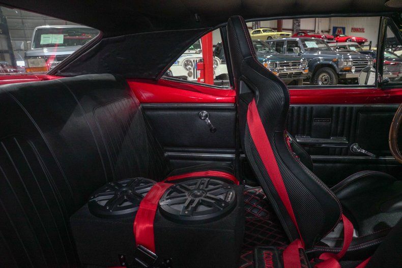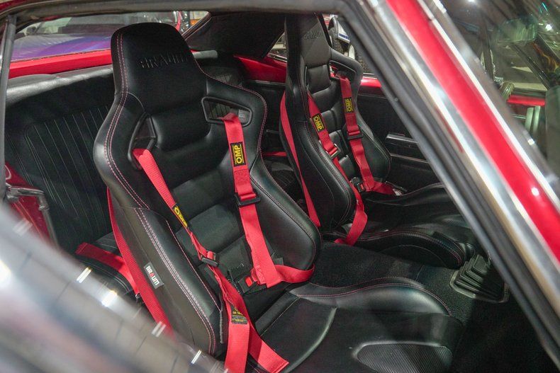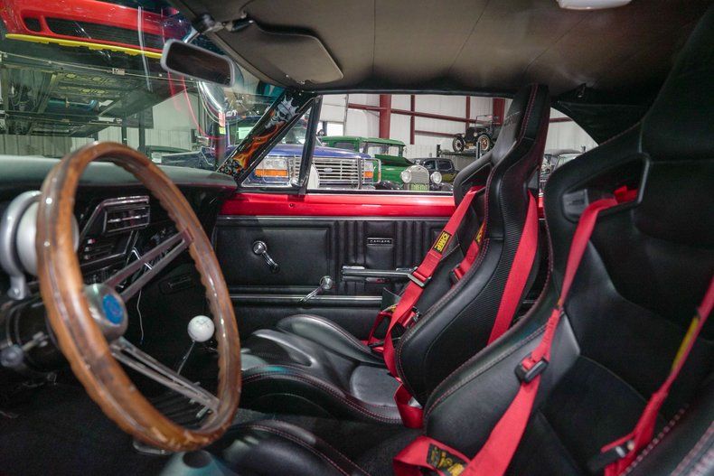 Inside, the black leather interior is both aggressive and functional. OMP red harnesses reinforce the performance focus, while a wooden steering wheel adds a classic touch. Vintage Air has been installed to keep the cabin comfortable, blending modern convenience with old school muscle. A Bluetooth stereo system paired with dual bass boxes in the trunk brings serious sound to match the car's bold personality.