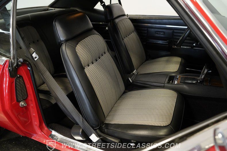 Inside, the cabin wraps you in a blend of vintage charm and comfort with black vinyl seats featuring iconic houndstooth cloth inserts that recall the muscle car heyday. The SS steering wheel with tilt column feels just right in your hands, while the center console floor shifter offers an engaging connection every time you take control. The headliner and carpet remain well preserved, completing an interior that balances style and usability.