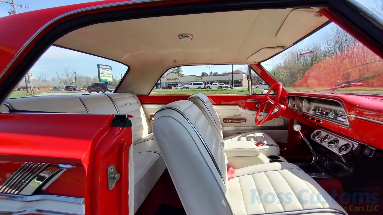 Factory bucket seats, dash has been refinished; as well as interior doors and quarters, original instrument cluster showing 72,200 miles; which is in excellent condition, dealer add on factory type air condition, also has updated AM/FM/CD stereo nicely mounted under dash, custom kick panel speakers and rear deck speakers, original steering wheel in excellent condition, at time of restoration had new headliner and sun visors, new front and rear door panels and arm rest, new front and rear seat covers, updated with front seat belts, new carpet and floor mats, Hurst 4 speed shifter, sill plates look like new.
