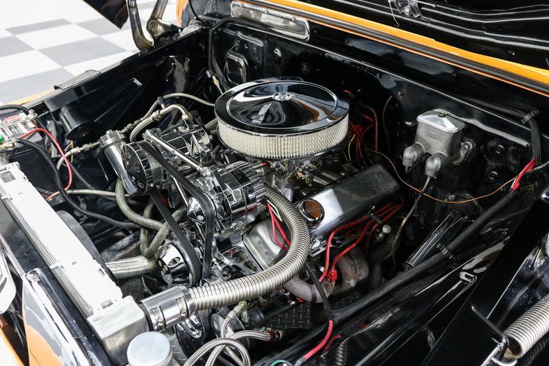 Under the hood lives a 350ci V8, the go-to small block that helped define generations of hot rodding. Backed by a 4 speed manual, this setup delivers the kind of hands-on driving experience that separates real trucks from the rest. Long tube headers, a serpentine belt system, aluminum radiator with electric fan, and chrome core support all work together to keep things running strong while adding visual punch when the hood goes up.