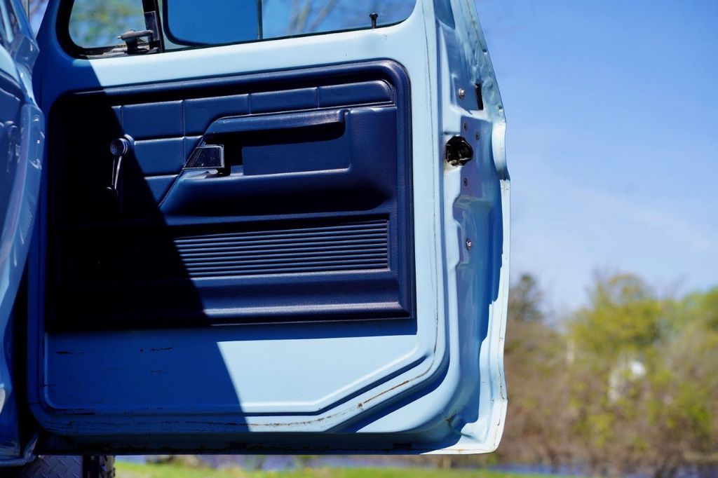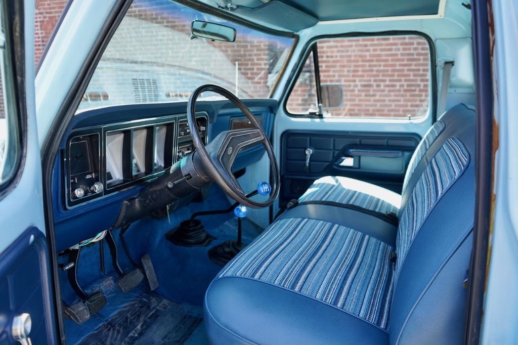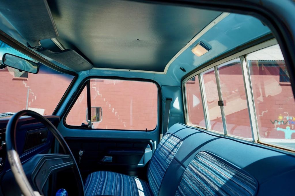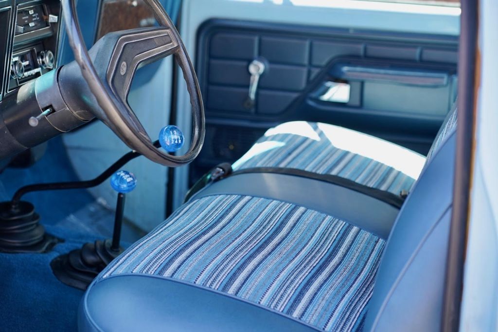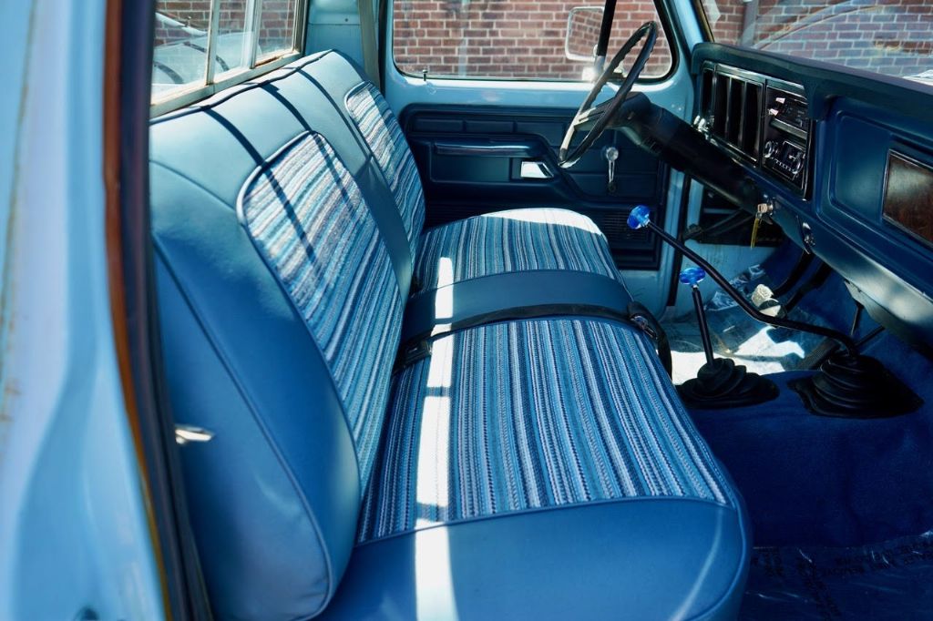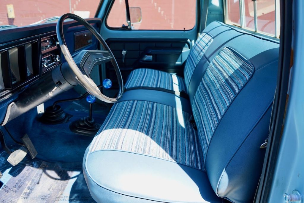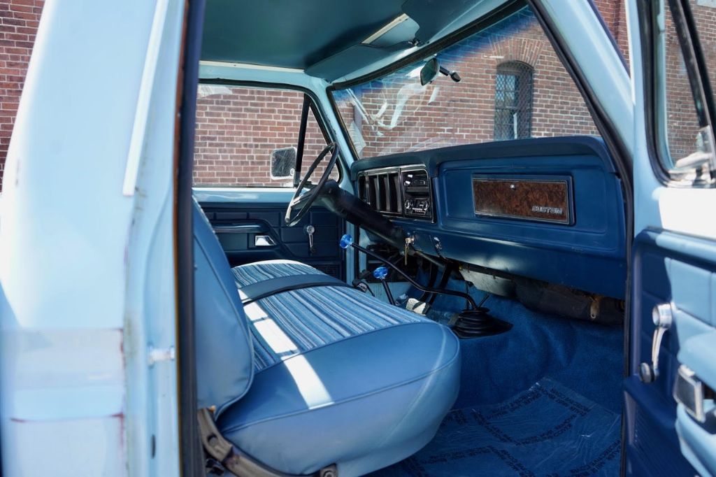 This solid rot-free West-Coast F-350 was originally built in San Jose and sold new at Wittman Ford in Lakeport, CA. This truck still retains original paint, dressed in the original colors “Light Medium Blue” over a Blue Knitted Vinyl bench seat interior. Original paint shows excellent with minor patina. The interior is completely re-done to factory specs with a new carpet, bench seat, dash pad, headliner and Bluetooth radio that works.