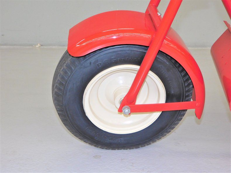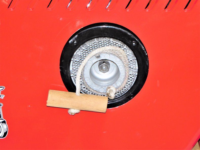 To start this Skat-Kat, you need to wrap the rope around and pull. You must re-notch each time you pull. There's a handy storage bin behind the seat to put the starting rope once started so as not to lose it. This restored Skat-Kat would be a fun addition to any garage. This is a running scooter. The consignor does not have a title for this scooter, but we will get it titled for you.