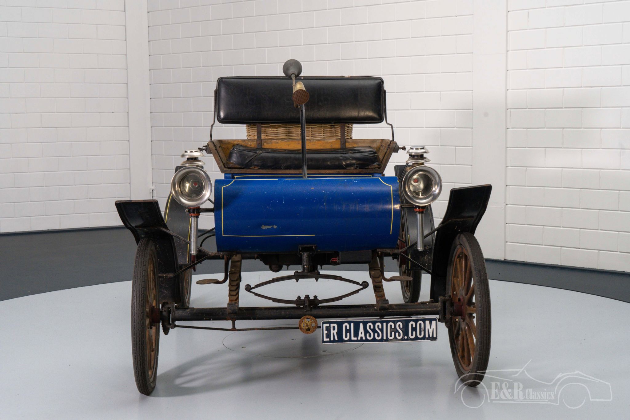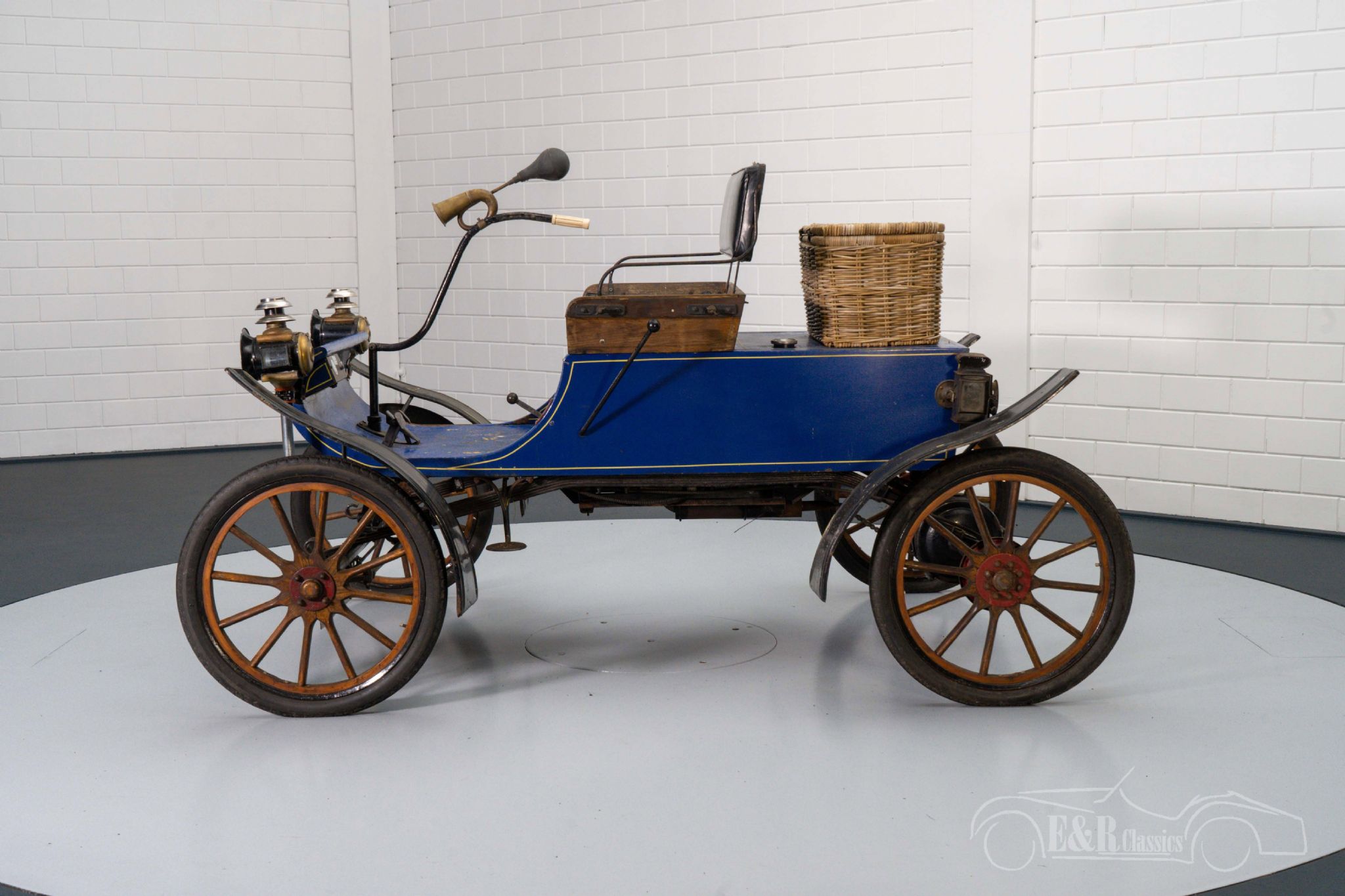 Oldsmobile Curved Dash Replica for sale at ER Classics The Oldsmobile Curved Dash Replica that we offer for sale here is anything but a standard classic. The car is built on the basis of an all-steel construction and is equipped with lighting with candles, steering rod, two-person bench, wooden spoke wheels and curved dashboard. Over the years, a beautiful patina has developed on the dark blue paintwork that completely matches the classic look of this car. Are you looking for a unique old-timer to visit shows and events? Then this Oldsmobile Curved Dash is the car for you.