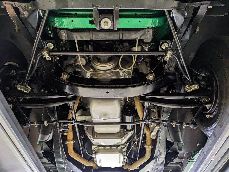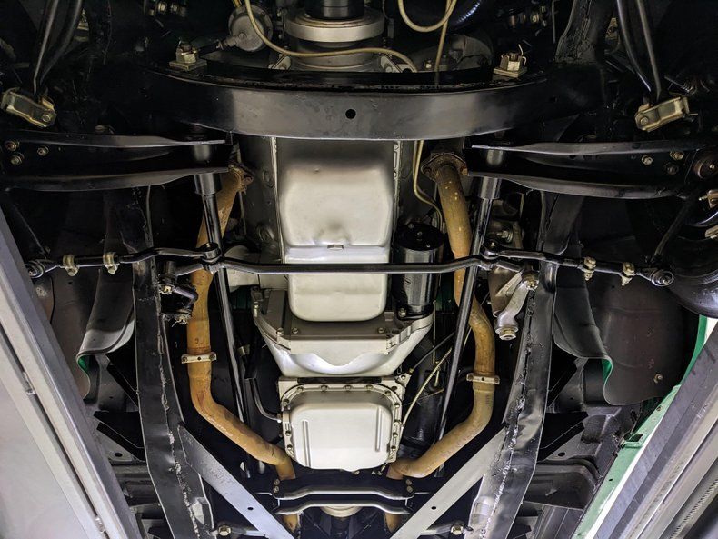 UNDERSIDE: The body was off the frame, every component was rebuilt and restored to factory new condition. These cars featured twin parallel torsion bar front suspension which allowed them to lower the engine. The low center of gravity gave the car impressive handling. The wheels went from 15 to 14 inches to lower the car even more which meant the drum brakes were smaller and had to work harder. These cars have special air ducts below the headlights that cool the front brakes. All the suspension front and back is rebuilt, the steering has been completely rebuilt. It has a four muffler exhaust system. The fuel system was restored. The chassis was all prepped and painted a semi gloss black. The rust free floors are painted a satin black. Looking up at the motor it looks like new. The correct Torque flite automatic has been restored. The drive shaft is rebuilt and painted. The rear end was restored.