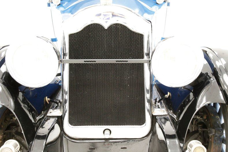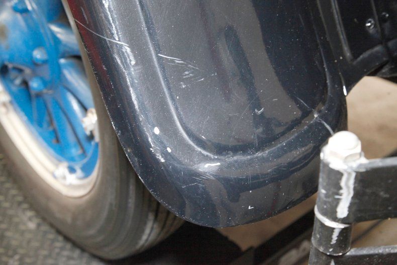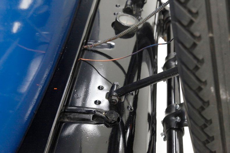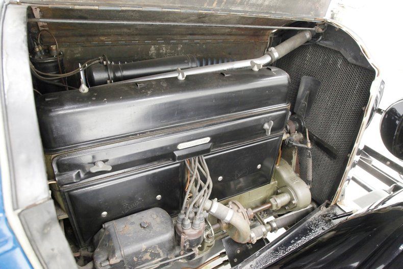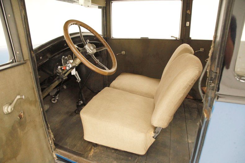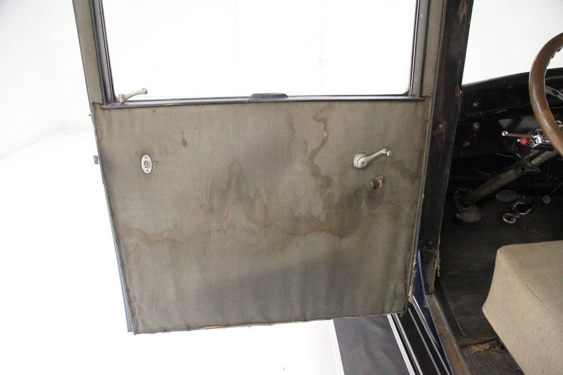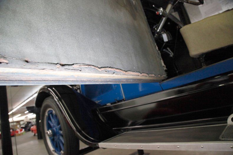 All straight steel, all rust free and all painted with a wonderful coat of Bambalina Blue for the body hovering above black for the running boards and roof. The curved fenders show some scratching but remain overall nice and rust free. The chrome is nicely polished and in good condition, confined mostly to the grille, radiator surround, headlight bezels, and edge trimmings on the running boards and central bumpers. A nice visor is shading the single pane glass windshield and all other glass is in excellent condition. 22-inch wood spoke wheels in blue have a chromed rim all wrapped in very gapped 6.00x22 tires and include a rear mounted spare. The paint is shiny and running board tops have a rubber lining on top with all looking snazzy...Yowza!