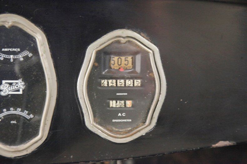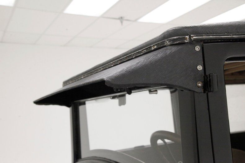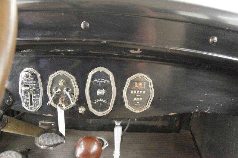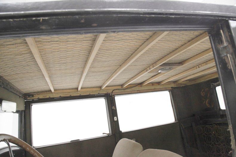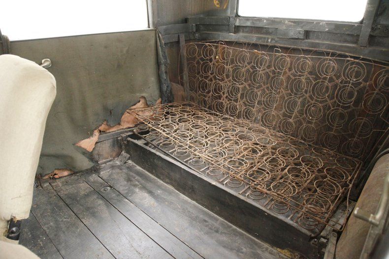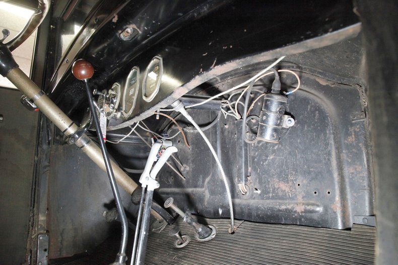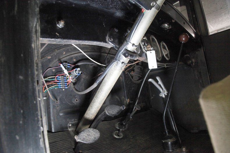 A swing of the doors and the interior will need some updating on the mohair door panels which are currently water damaged. We note that the cranks and actuators are all on but need a good polishing. Nicely recovered front bucket seats are installed and are looking just fine and a rear bench is in, however is just the frame and springs with no upholstery. The floors are uncovered and showing in black painted planking with no rot. Upfront, a nicely curved dash in all steel painted black has beautifully shaped and styled chrome bezeled instrumentation. A large wood rimmed steering wheel fronts this stylish dash and is original and unrestored. Slightly soiled rubber ribbed flooring is covering upfront with the shift lever and handbrake is protruding towards the driver in the center. Above the headliner is framed with furring strips and chicken wire but will need the actual material installed.