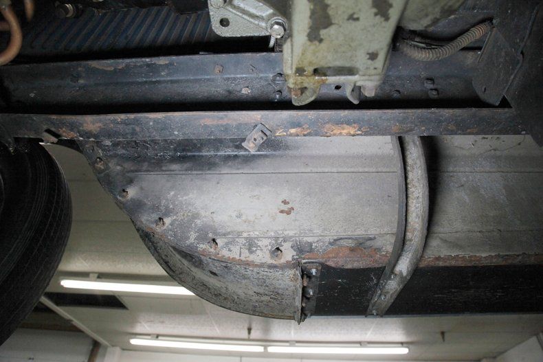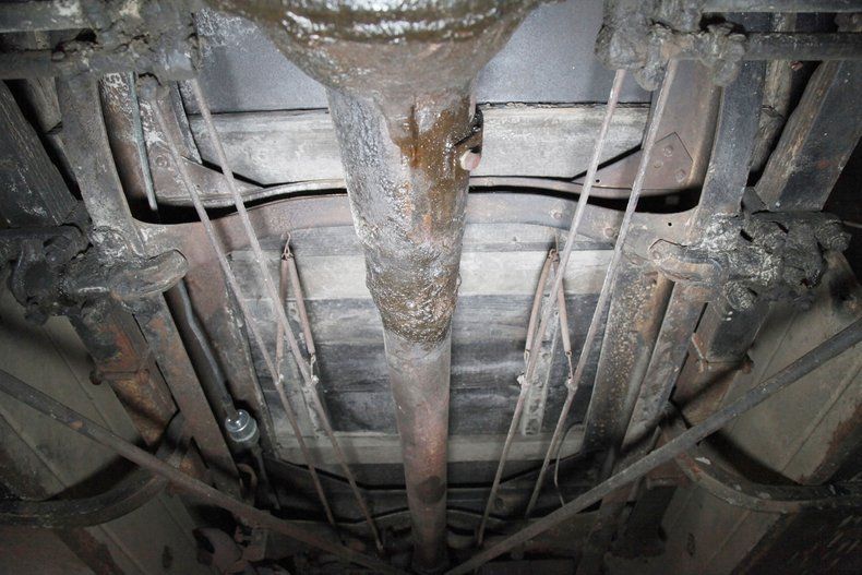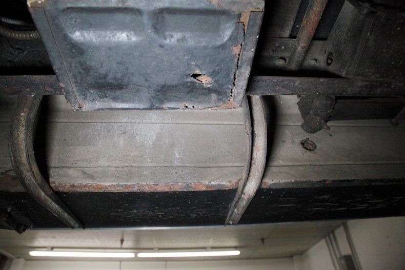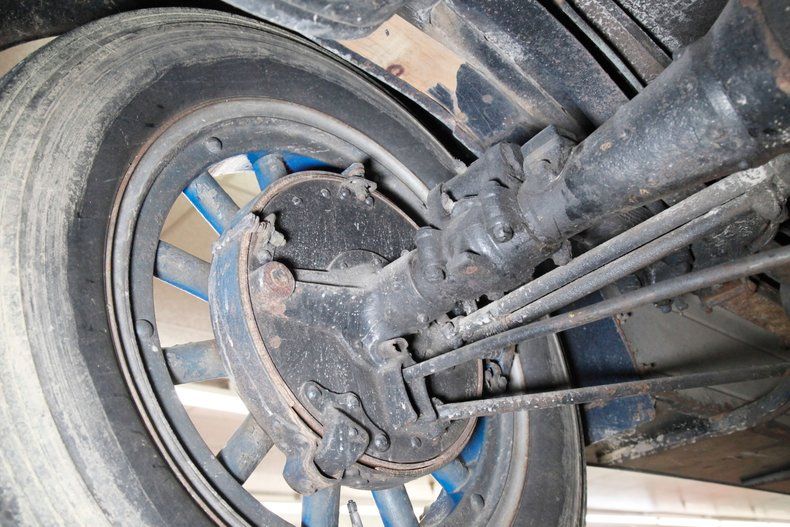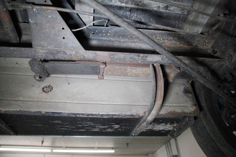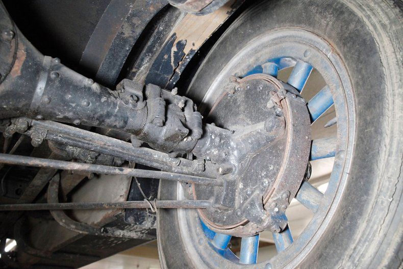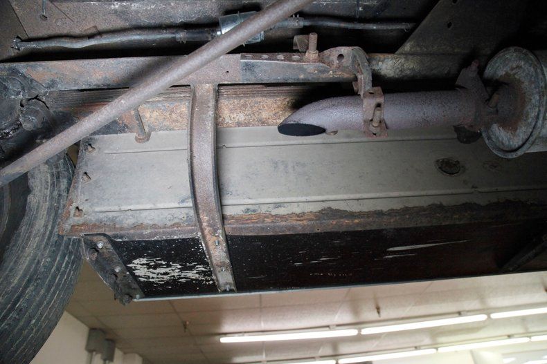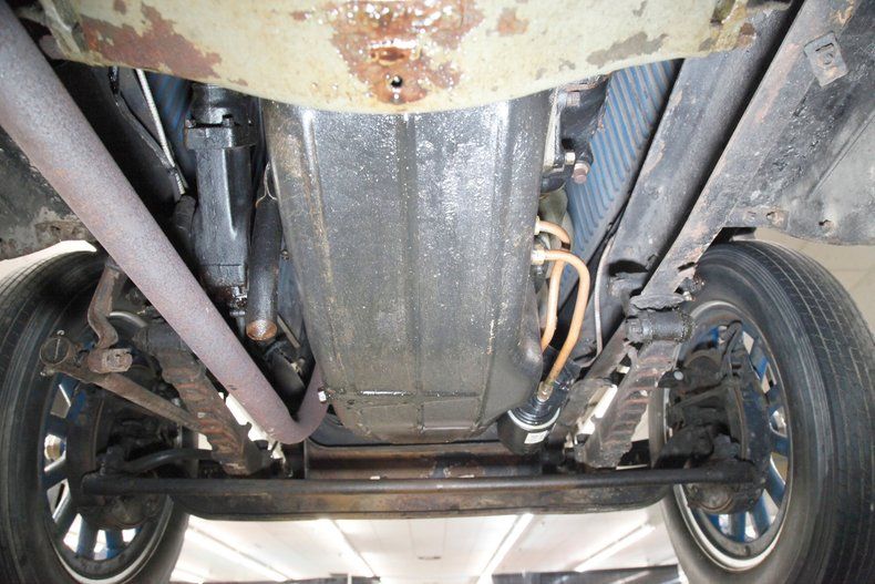 The underside of this car shows plenty of patina and just slight surface rust. All steel is solid for the framing and running board mounts and underside of them. The muffler and short tailpipe have holes in them. This car rides on front leaf springs and for the rear it utilizes quarter elliptical leaf springs with both ends sporting redone mechanical drum brakes on the corners. A 6 volt electrical system is in use with the battery mounted under the car.