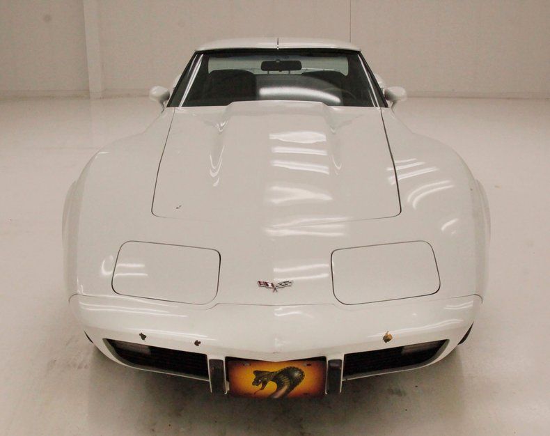 Bathed in Chevrolet Classic White, the paint is looking a bit aged in places with some cracking and crazing, as well as chip offs especially on the neoprene bumpers. Coves just behind the front wheels flare into the fender nicely and move upward to form the curved fender that melts into the hood area, which also houses the hidden headlights. A coke bottle design really showing on the rockers with a thin accenting black stripe. On top, the "T" style roof with removable panels is an option on this car. Those flying buttresses panels are seen angling toward the rear deck where a chromed luggage rack is perched. A wonderfully rounded rear roll pan all in neoprene houses round tail lights. Some serious paint chip off is noted on this rear bumper. 15-inch Chevrolet rally wheels are all around and wrapped in raised white letter Stinger Radial GTS, 215/70R15's all around.