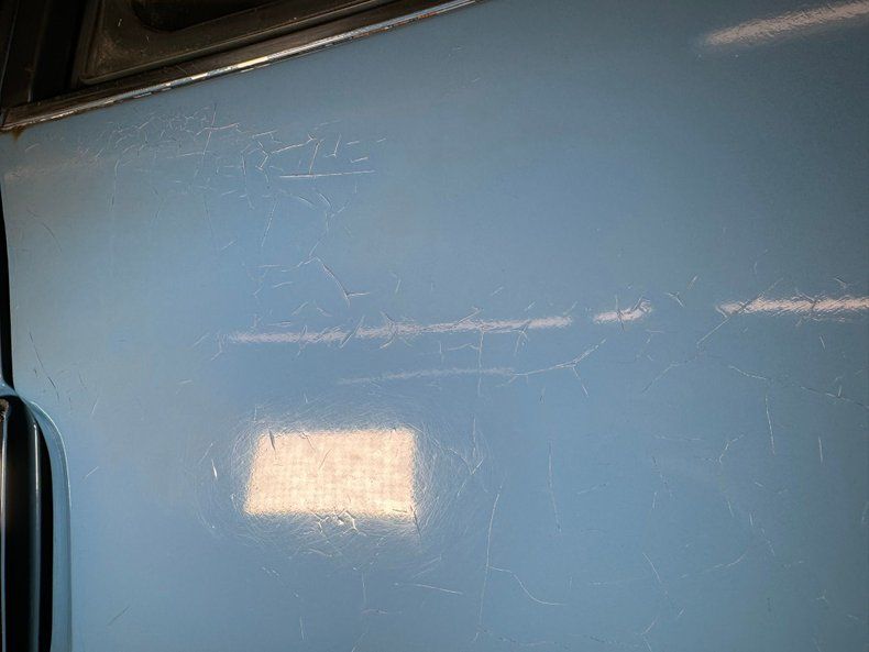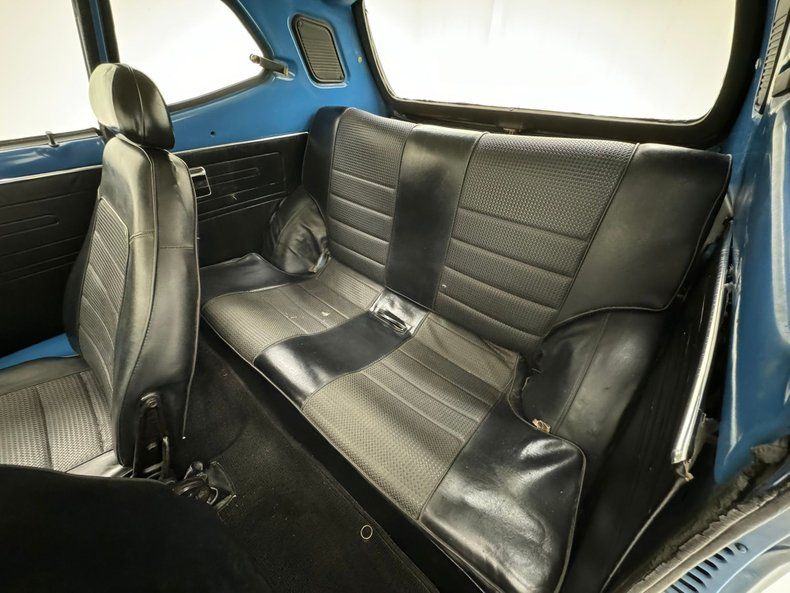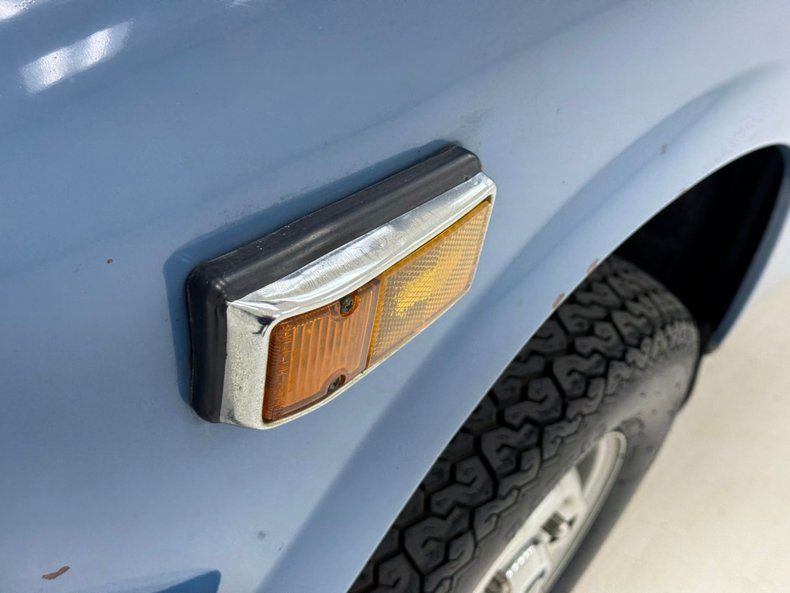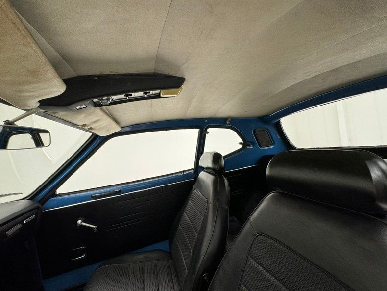 Interior Entering through either side of the long doors, access is surprisingly easy. These have a black vinyl panel in them and a simple actuator and crank and an upper handle sill pull. Weather stripping seals are dry rotted and door bottoms suffer from slight rust. Inside, high back buckets are in very nice condition and sport textured knitted tuck and roll inserts, and smooth vinyl bolsters and headrests. A similar pattern small rear bench is behind these buckets. Upfront, a nicely preserved original dash is in and this shows plenty of square and rectangle design. Sweep gauges in the round are in and some pulls and knobs. An AM radio is in the center and protruding from the lower portion of the dash is the stick shift lever, it's not from the floor, which is different. Worn black carpeting is in the floors and above is a smile short headliner that has an upper console in the center emanating from the windshield and between soiled visors.