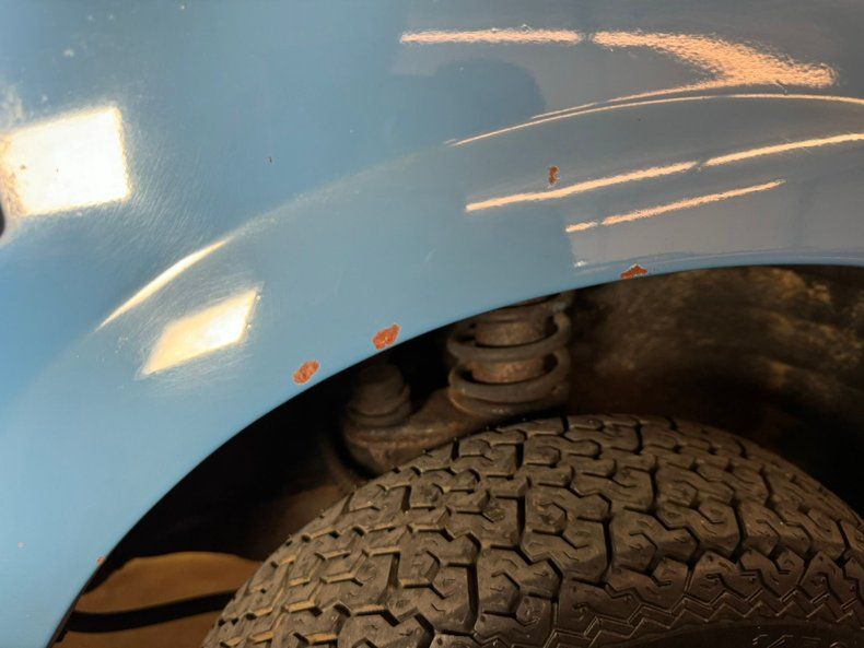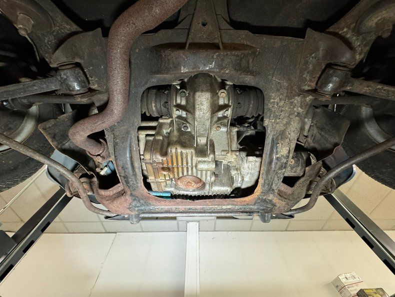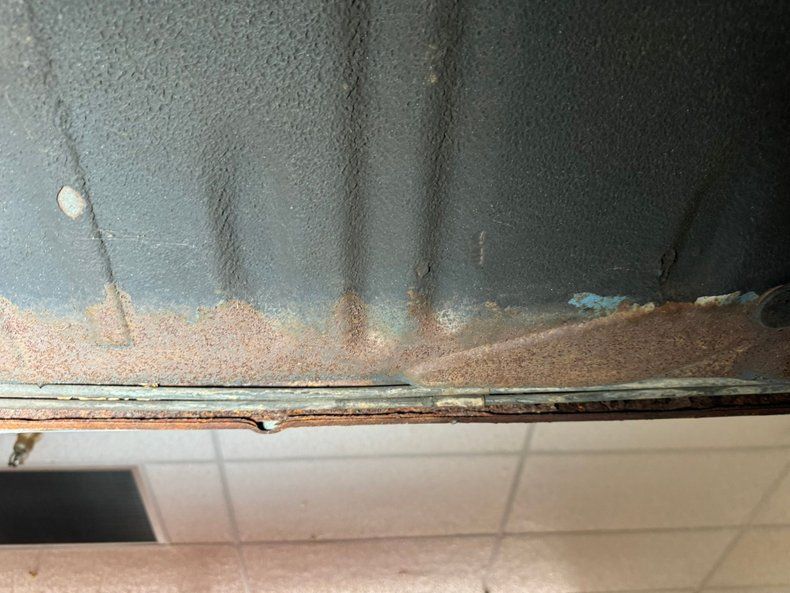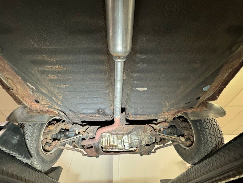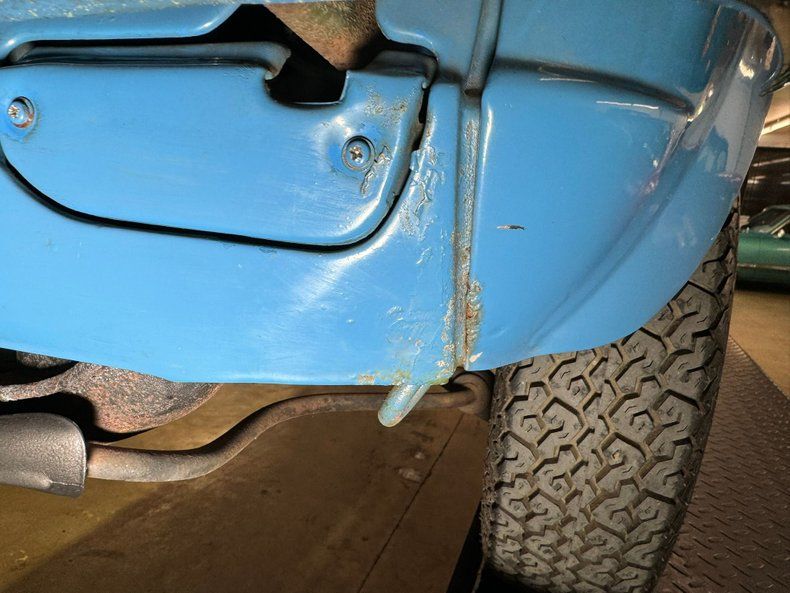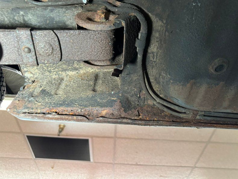 Undercarriage Sadly, there is more rust underneath with invasive rust on the rockers and some wheel well edges. Heavy surface rust is seen throughout. The floor pans are completely covering the area in the center of this underside and these appear to be solid. Independent coil springs are upfront and leaf springs are on back. Disc brakes are front and drums for the back.