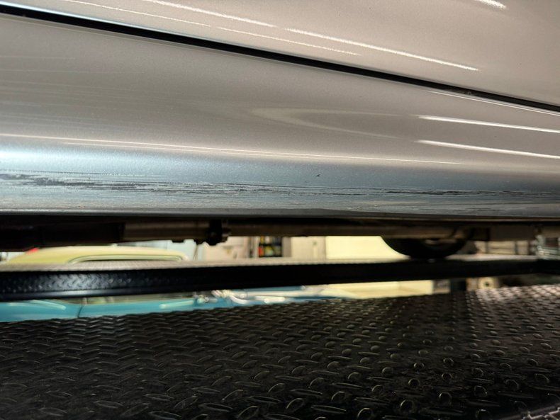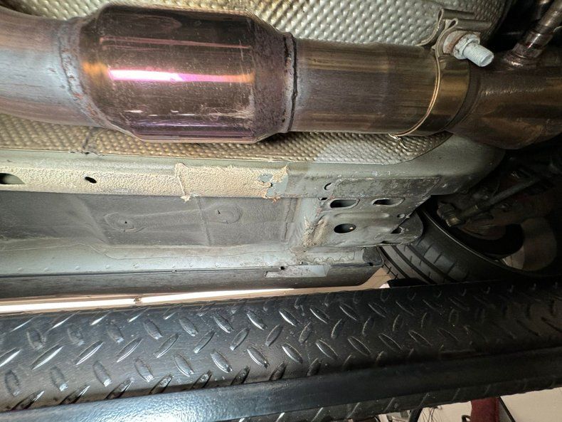 Up on the lift some slight surface rust but all structurally sound with the unibody construction. All independent suspension, and all power disc brakes all around for this car. Adjustable coilovers are in front, and lowering springs are in back. Noted, there is still a noticeable bend in the left front unibody rail near the radiator support (see photos 68 and 69).