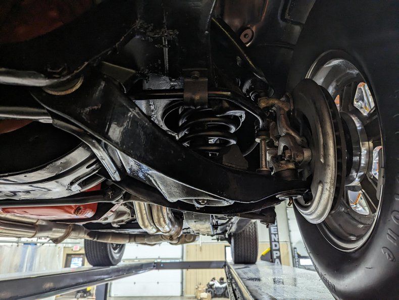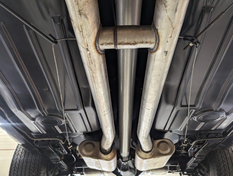 UNDERSIDE: Body off frame restored, every component was removed. Rust free, clean floors were painted a smooth satin black. Everything was put back together with new or rebuilt authentic parts. All the steering and suspension was redone, it even has correct spiral shocks. The entire brake system was redone, disc in front and drum in back. Replaced lines, e-brake cables etc. Fuel system was replaced. It was upgraded with a fatter exhaust, h-pipe and Flowmaster mufflers. Looking up at the motor it's clean Chevy orange with a correct starter. Correct M-22 "rock crusher" Muncie 4-speed with a Hurst linkage. Correct 12 bolt rear with special ordered 4.88 gears! Obviously, gas mileage was not the goal.