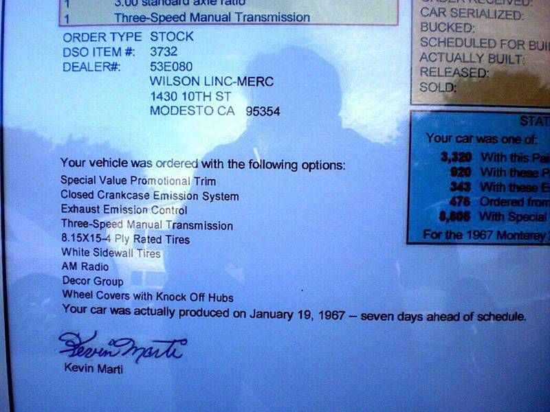 1967 Mercury Monterey 1 of only 343 California Black Plate Car This 1967 Mercury Monterey is a true California Black Plate Car & 1 of only 343 every made with this motor/transmission combination! With only 343 made in 1967 with this combination and an annual attrition rate of 10%, there MAY BE ONLY APPROXIMATELY 30 OR SO OF THESE GREAT CARS LEFT IN THE WORLD! If you find another one, I can almost guarantee you that it won't be this nice!! You are looking at a rare part of automotive history, and one that is only getting rarer! This 1967 Mercury Monterey was sold and owned in California until shortly after the events of 9-11 when it was sold to us & transported in an enclosed carrier to SD. It is a true California Black Plate Car & has been kept in our climate controlled showroom by the front row windows ever since. Taken out for periodic drives, the car is believed to be a one-owner car with actual miles with original manuals and documents. The official Marti Auto Report for this car also shows it to be 1 of only 343 1967 Mercury Montereys ever built with this motor-transmission combination, making it a truly rare car indeed! On classic cars they figure an annual attrition rate of 10 percent, meaning there may be only 30 or less of these rare cars left in the world! OPTIONS 390 V8 Engine 3-Speed Manual Transmission California Black Plate Car 2-Door Hardtop Marti Auto Report Air Conditioning New Goodyear Decathalon P215/75 R15 Tires Factory Original Hubcaps K & N Air Filter Crane Cams XR700 Ignition New Battery Beautiful Paint Fantastic Interior Stored in Climate Controlled Showroom